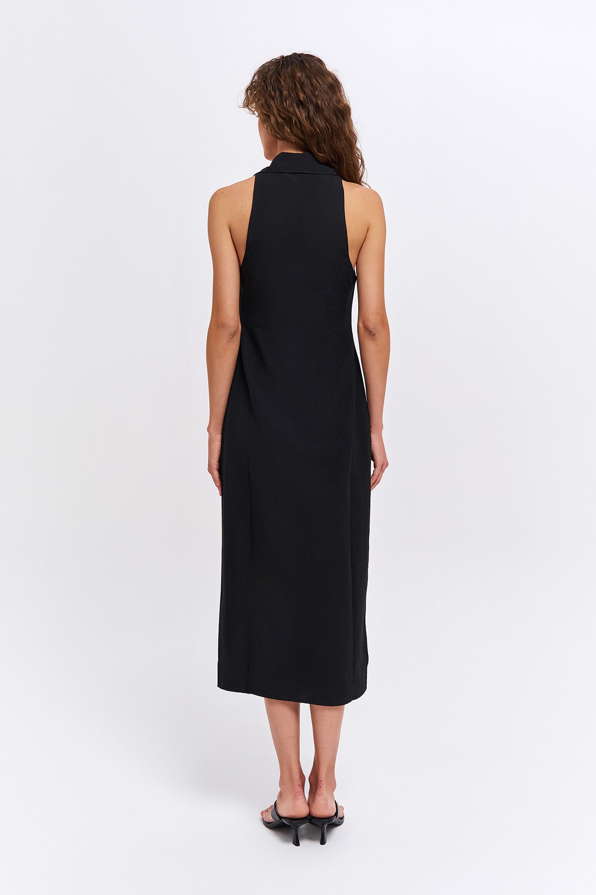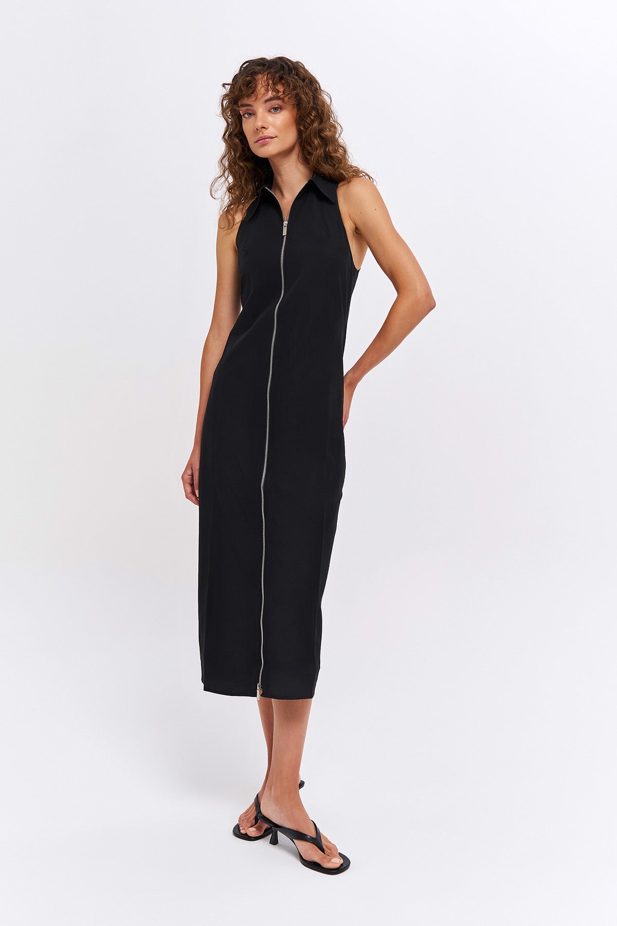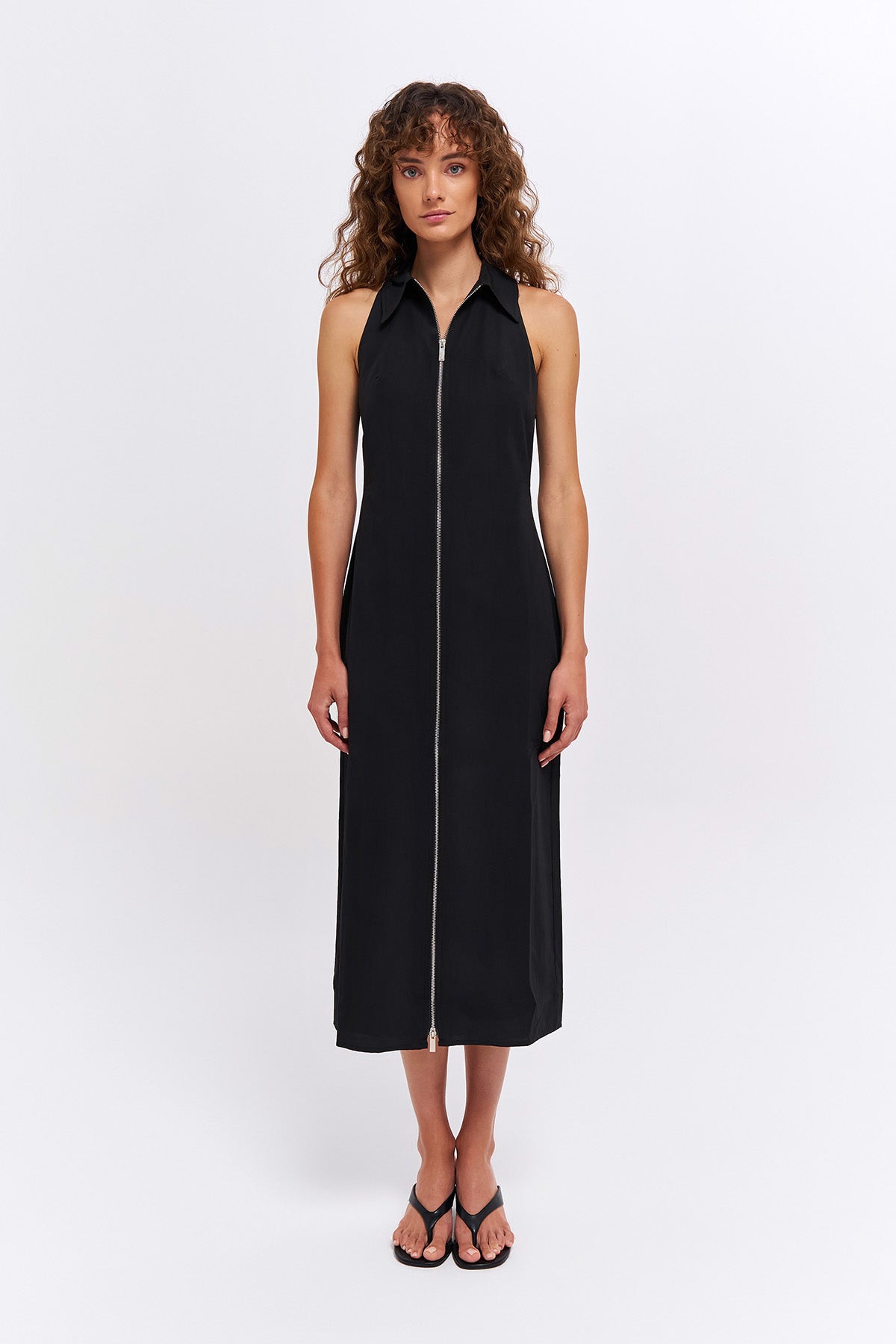 önü fermuarlı, kolsuz, yakalı, mİdİ boy elbİse.