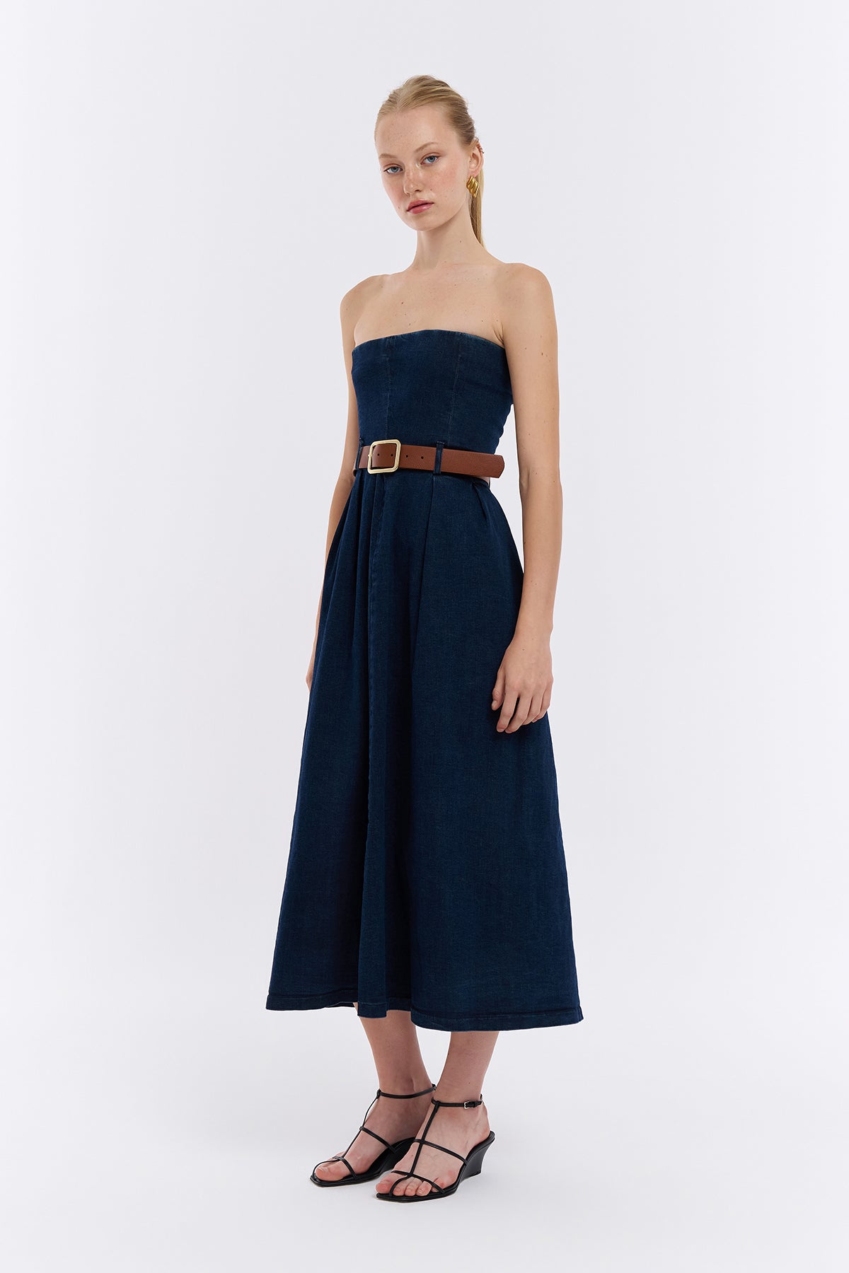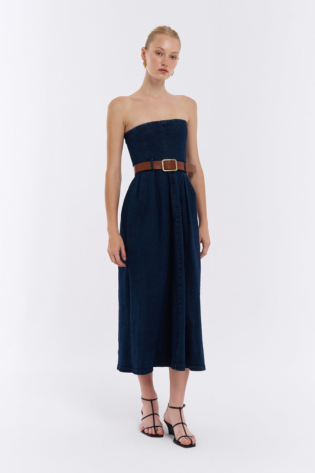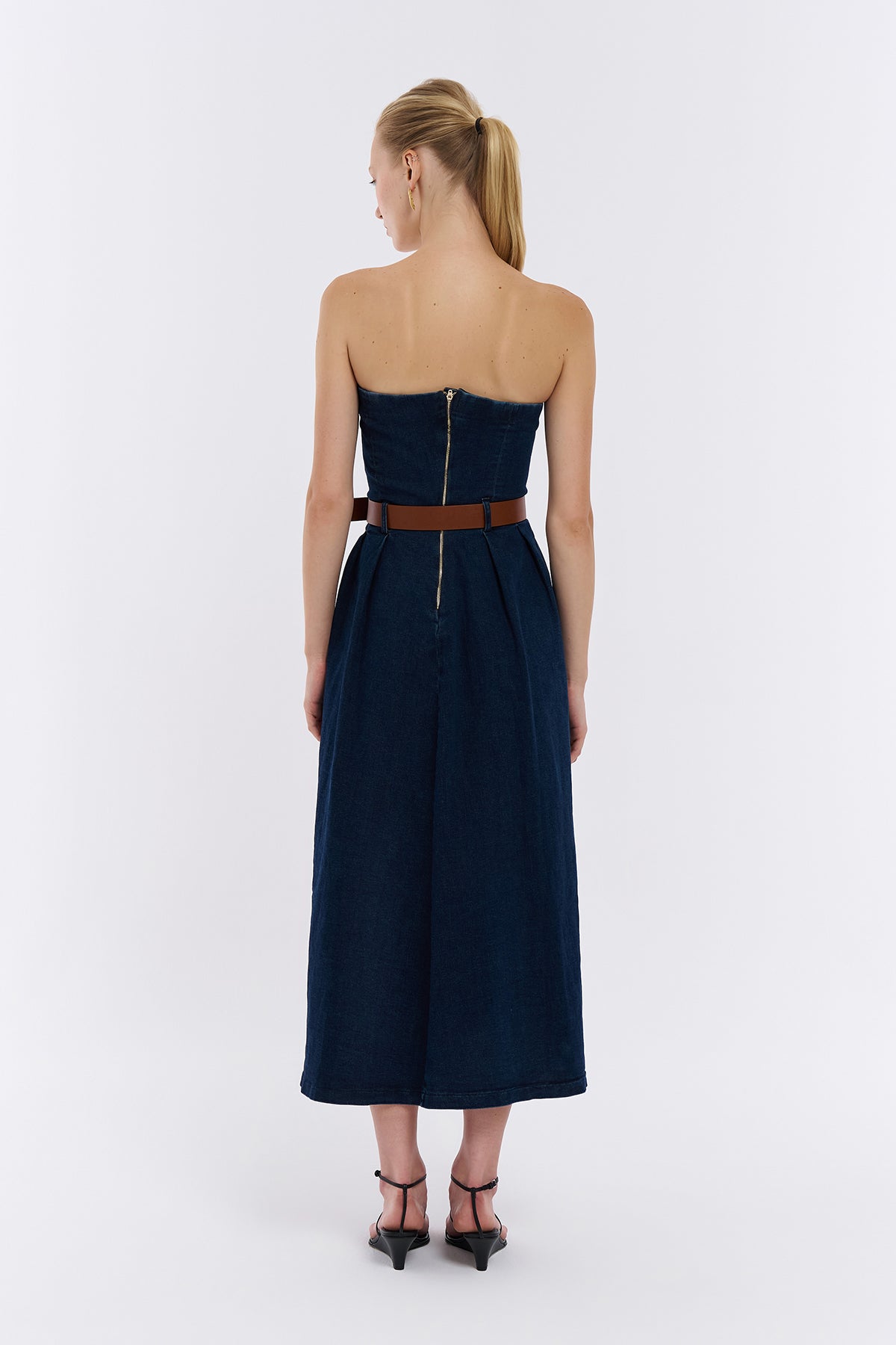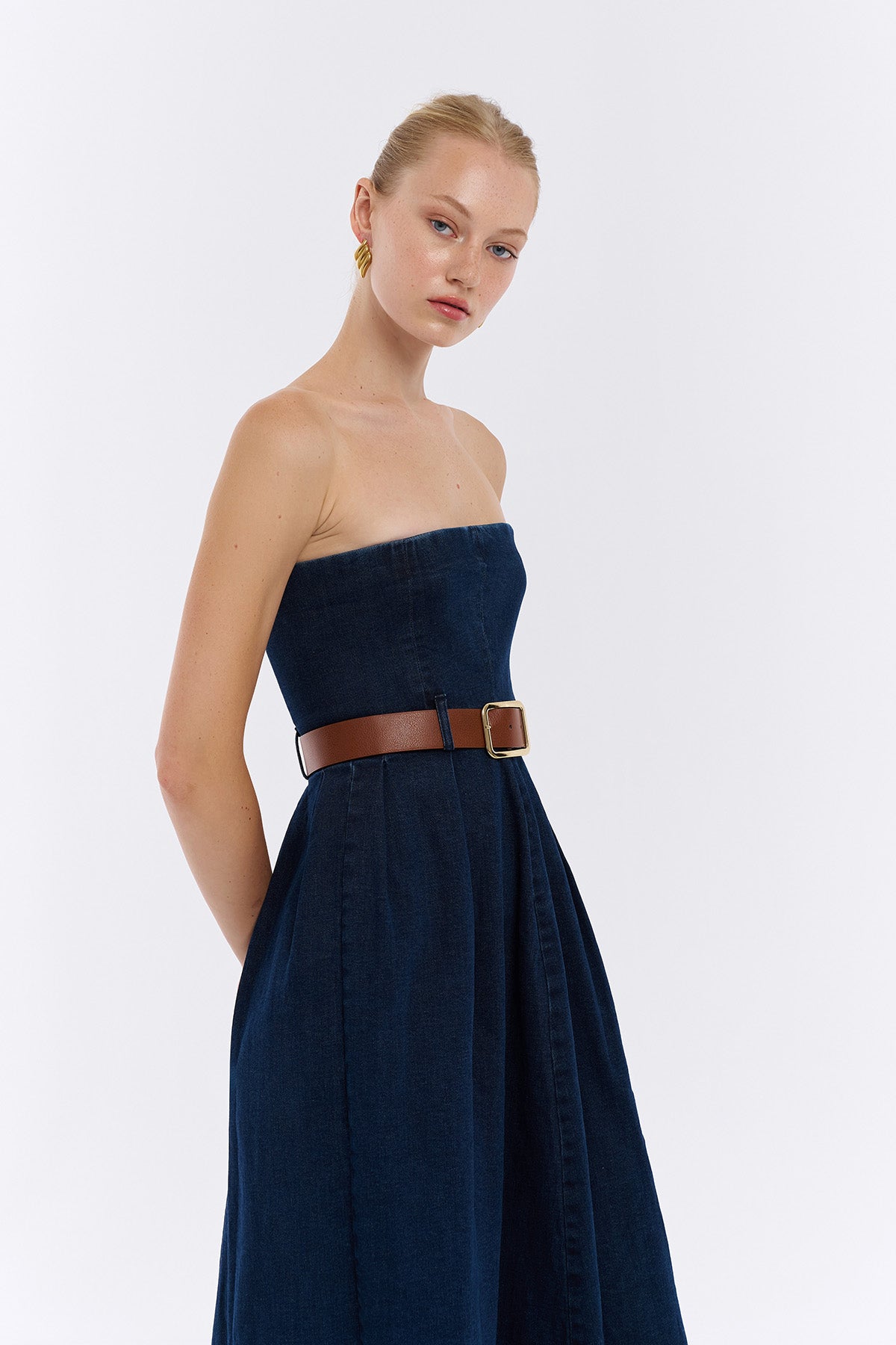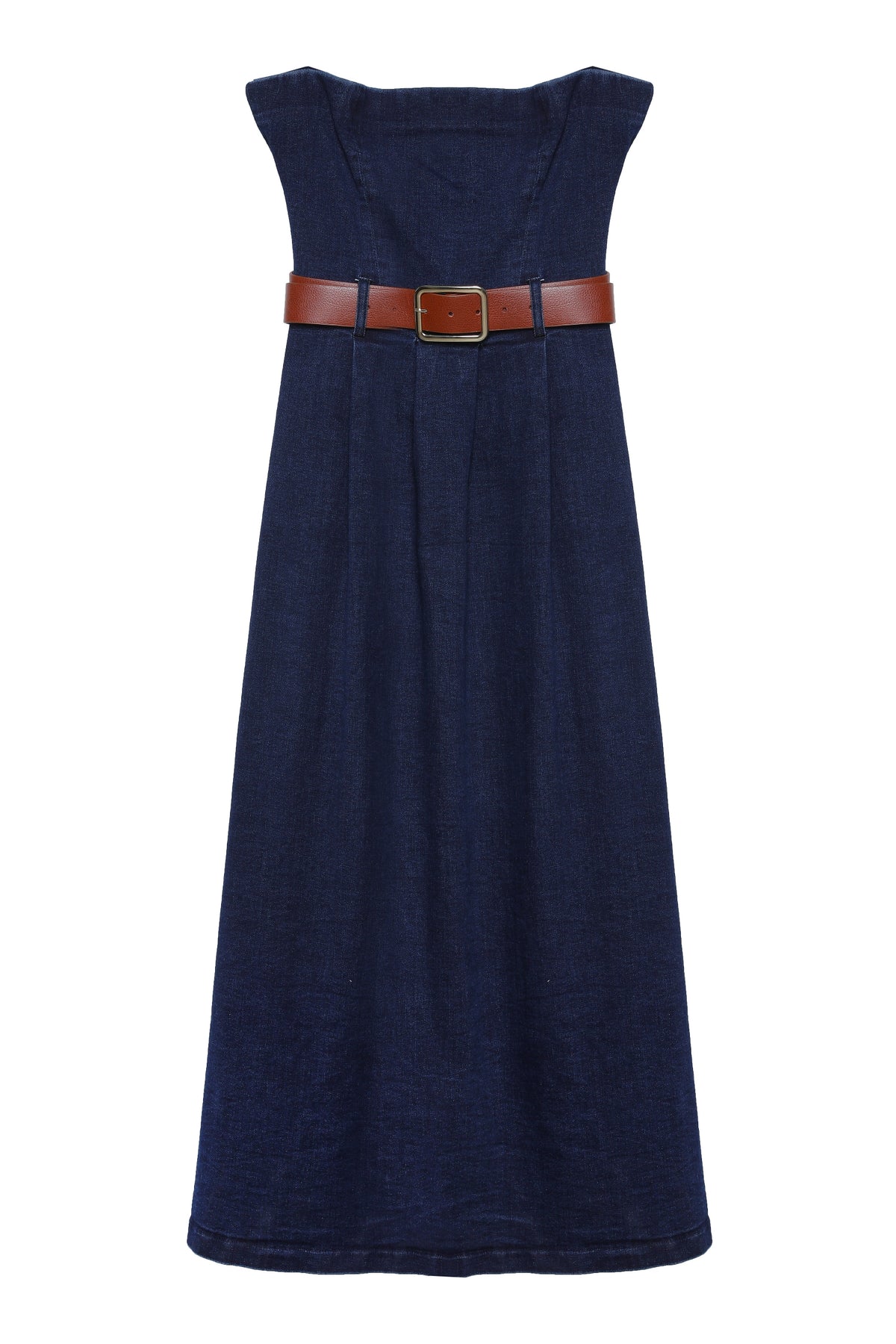 Kemer aksesuar detaylı, straplez, midi boy kot elbise.