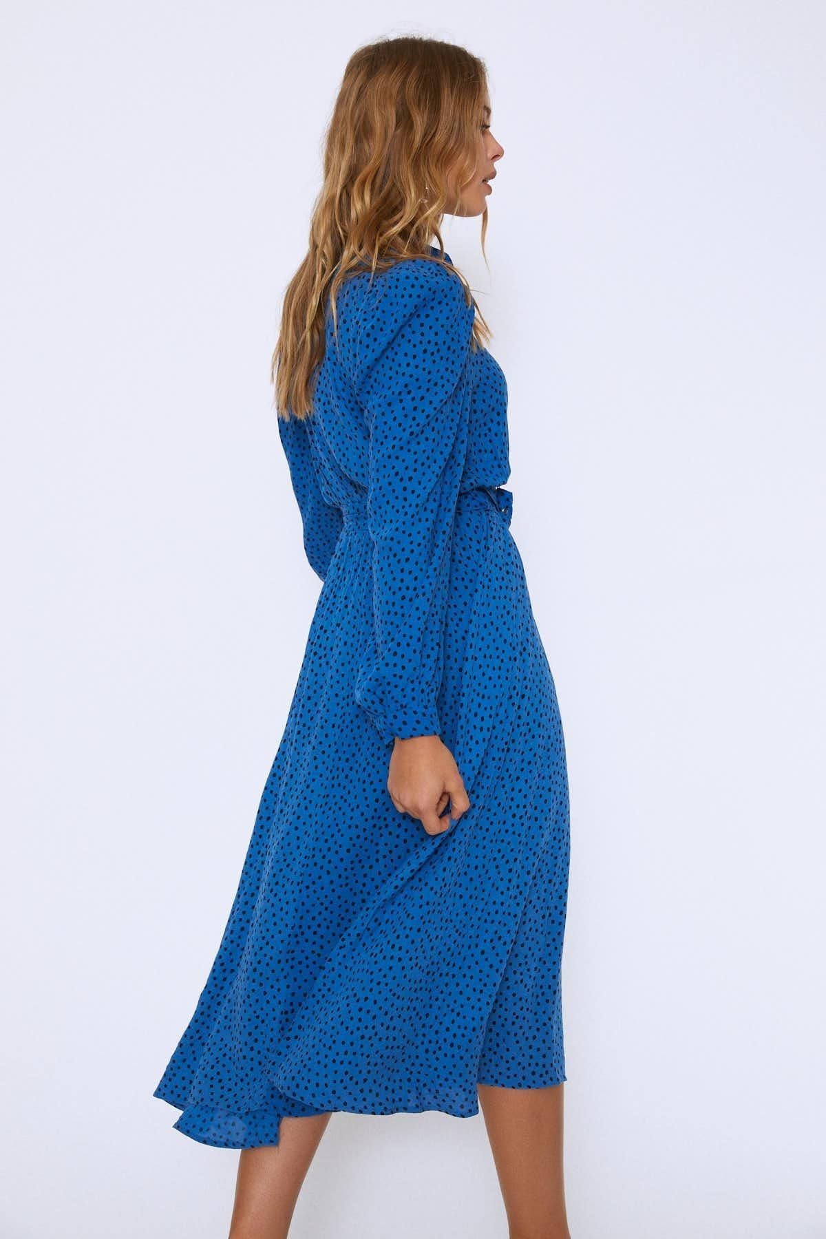 Romantik bir tavır yaratmak için ihtiyacın olan tasarım tam karşında. Puantiyeli hakim yaka elbiseyi günün her saatinde tercih edebilirsin.