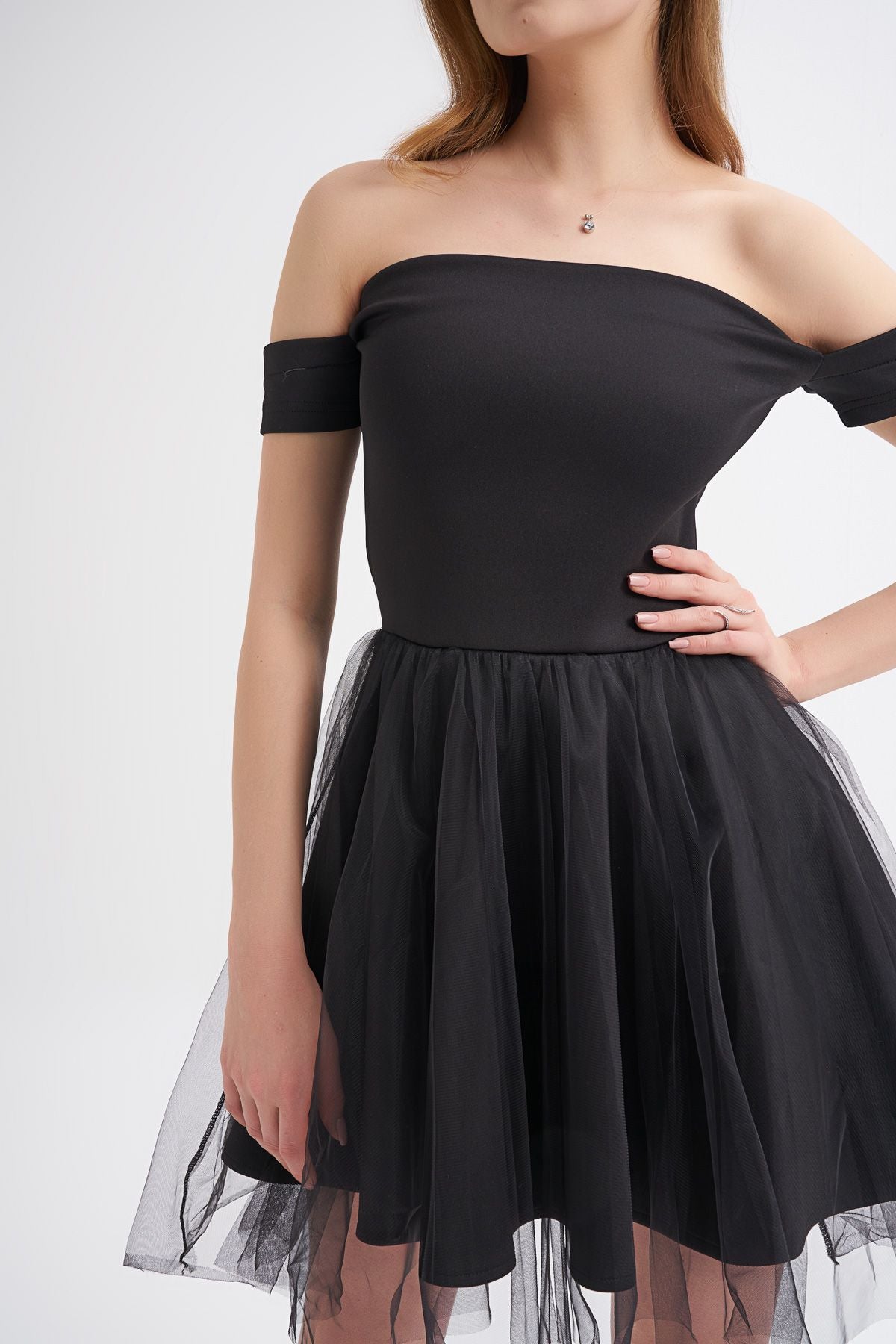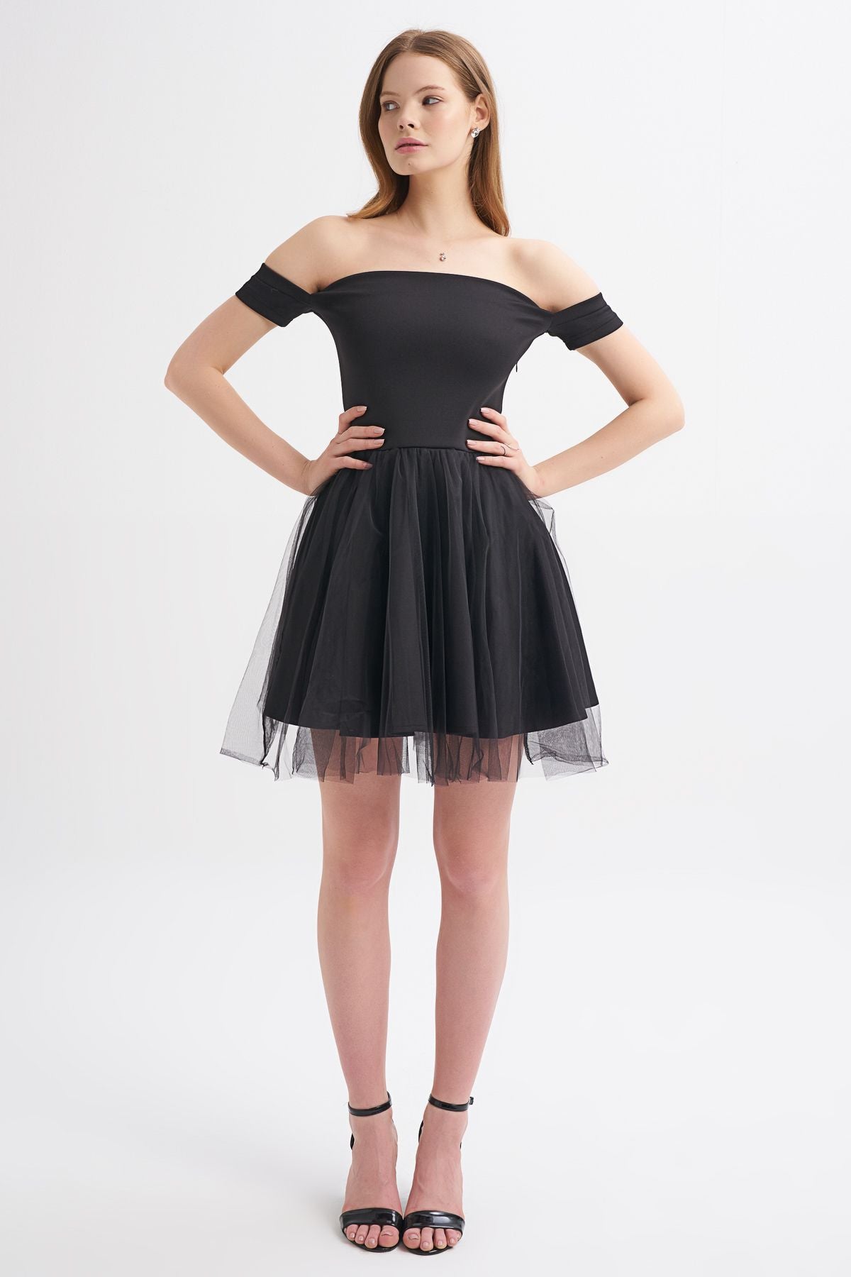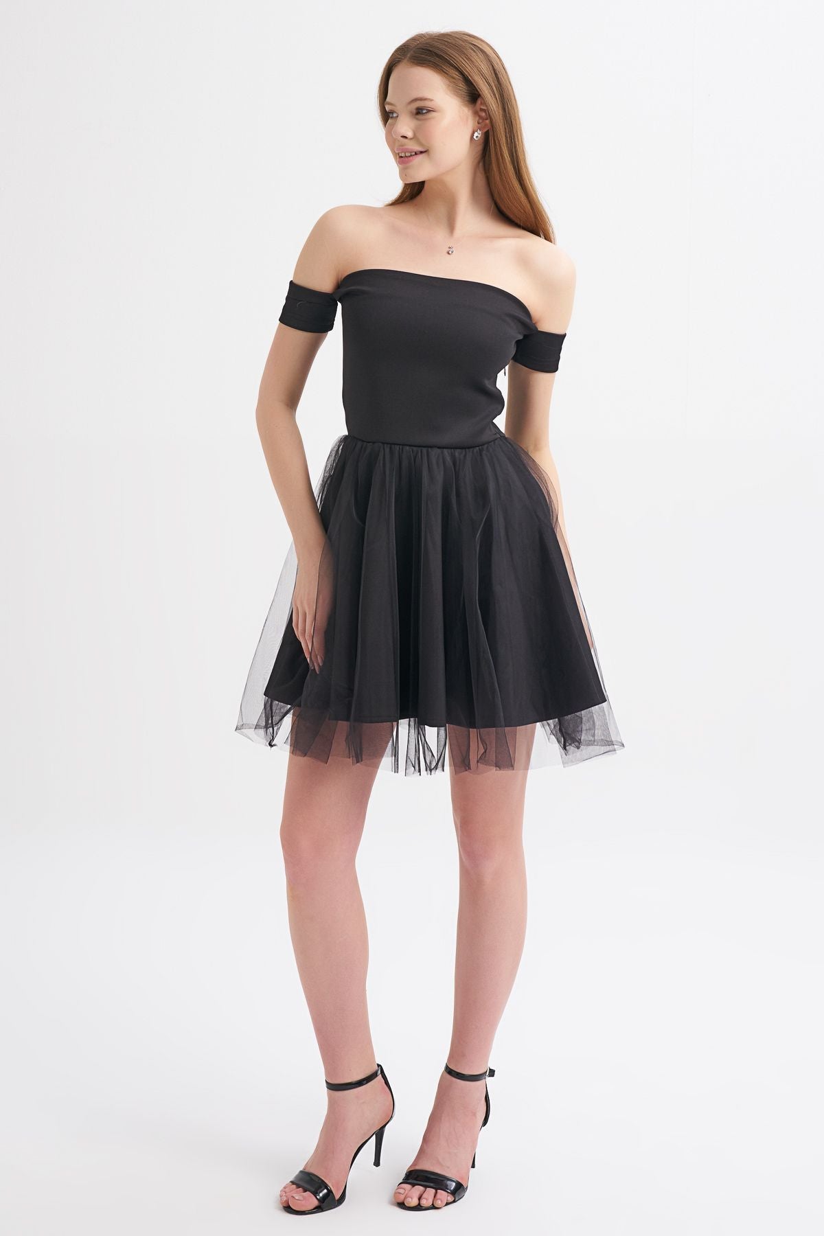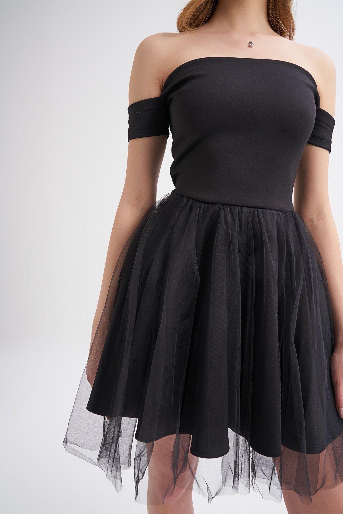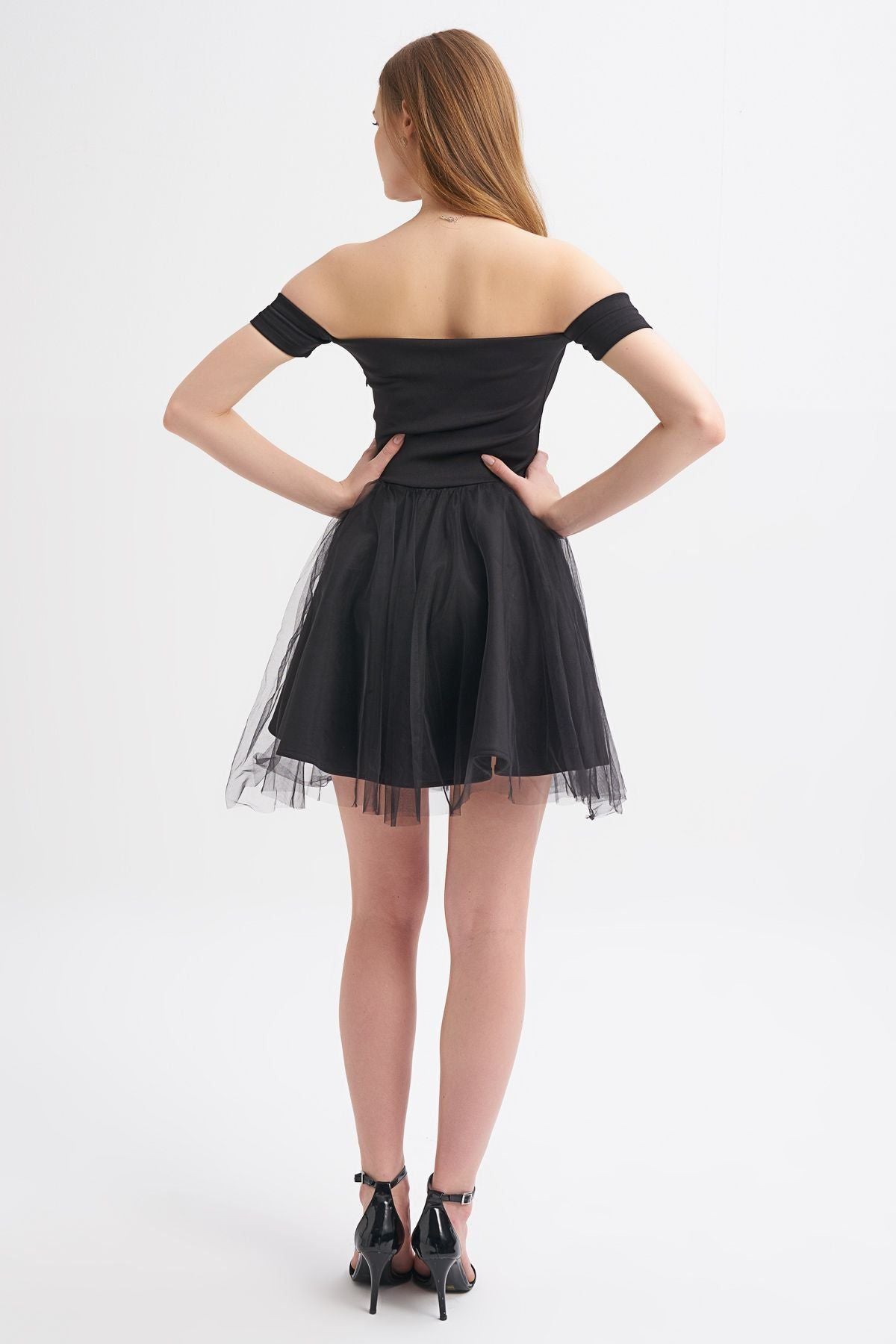 Tül Etek Askılı Mini Elbise Siyah