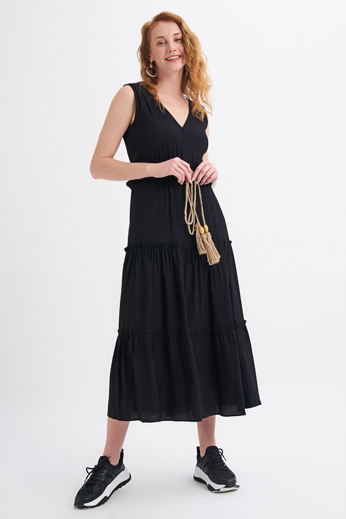 V Yaka Hasır Kemer Detaylı Elbise Siyah