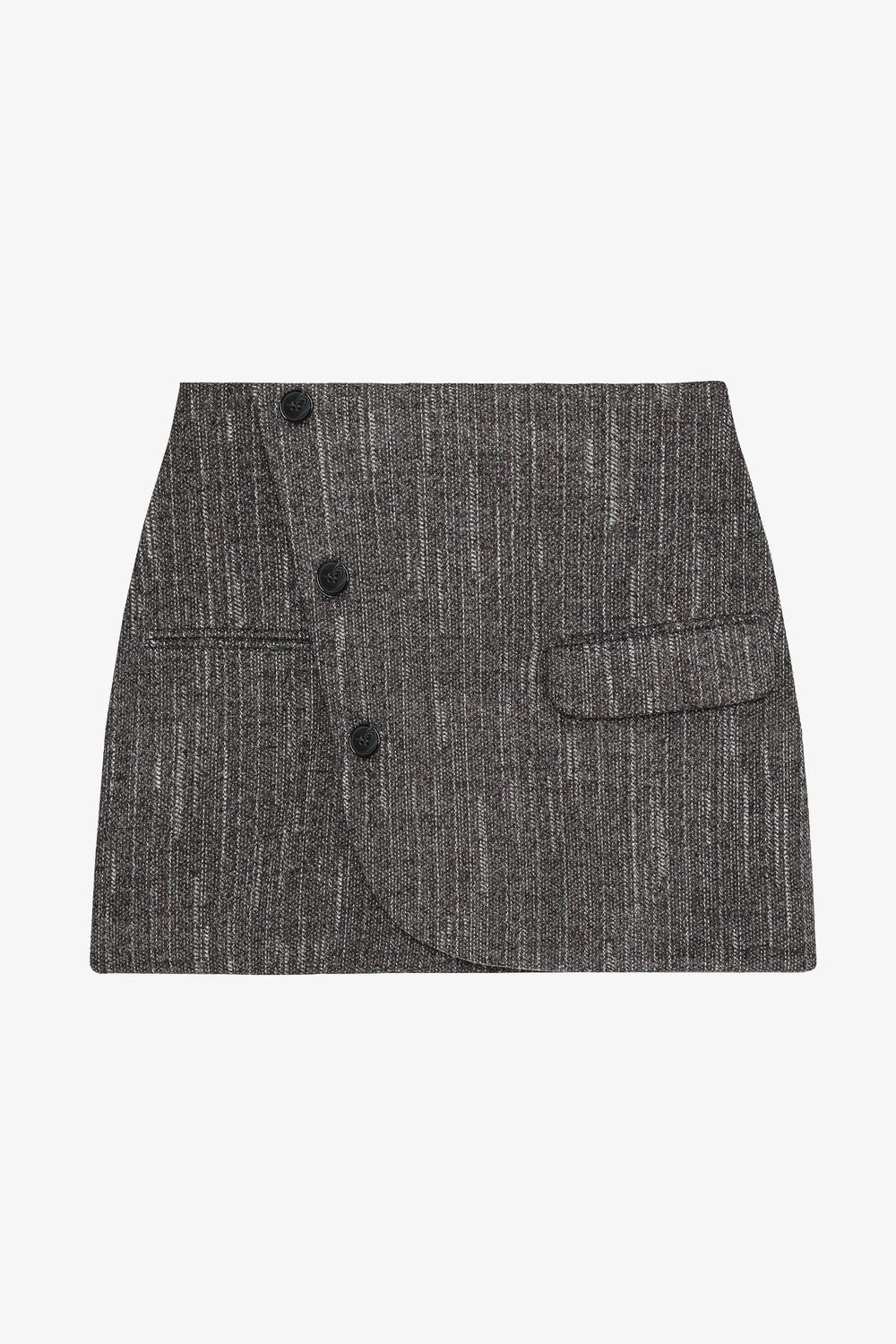 Önü düğme ve asimetrik kapak detaylı, yan cepli, astarsız, yandan fermuar kapamalı, mini boy kaşe etek.