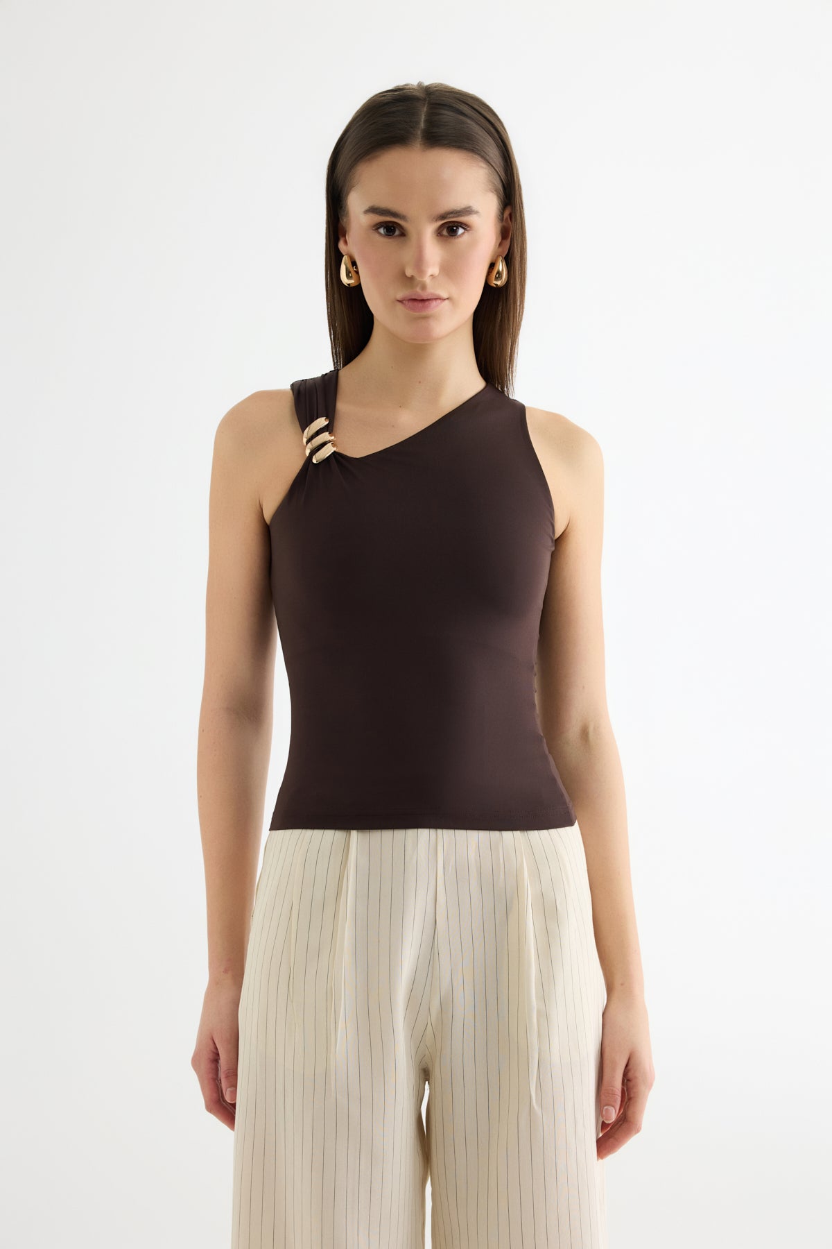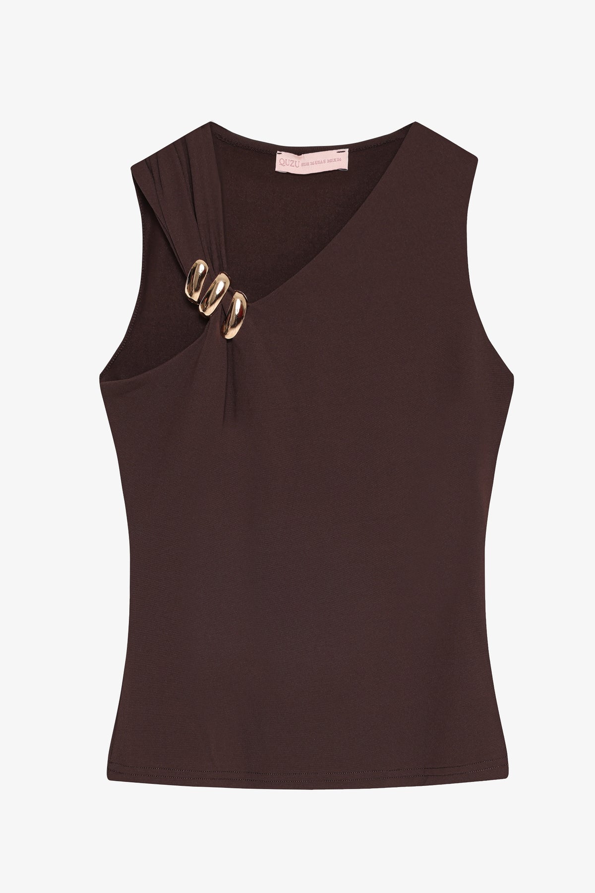 Asimetrik Yaka Metal Aksesuarlı Bluz Kahverengi