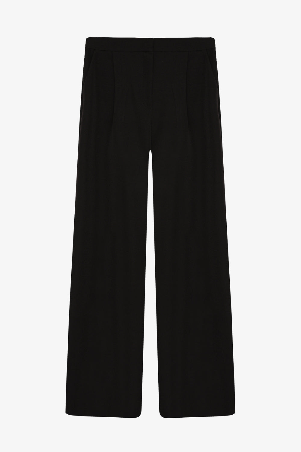 Düz kesim, yüksek bel, yan cepli, fermuarlı ve kanca kapamalı, pile detaylı, uzun boy, bol paça kumaş pantolon.