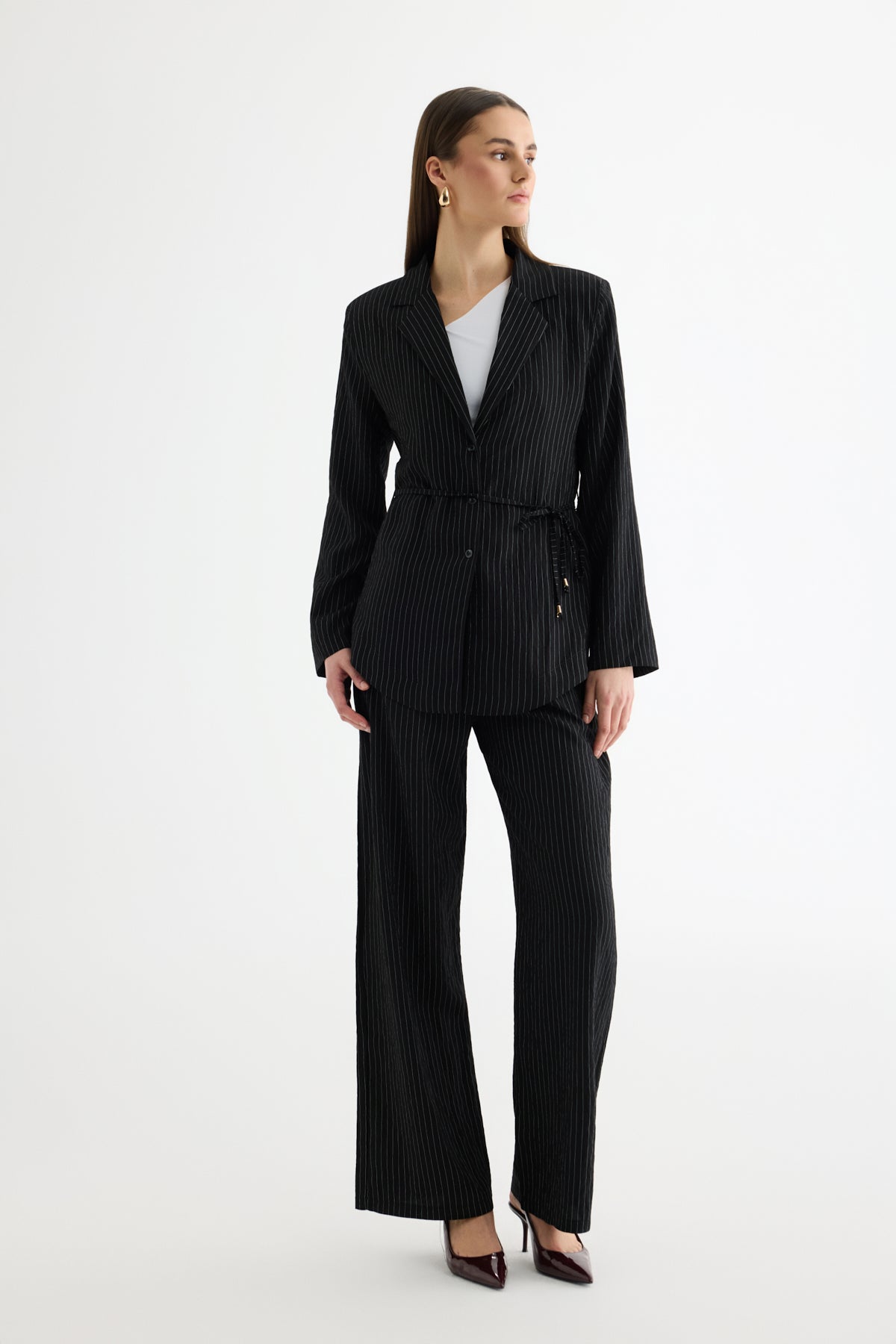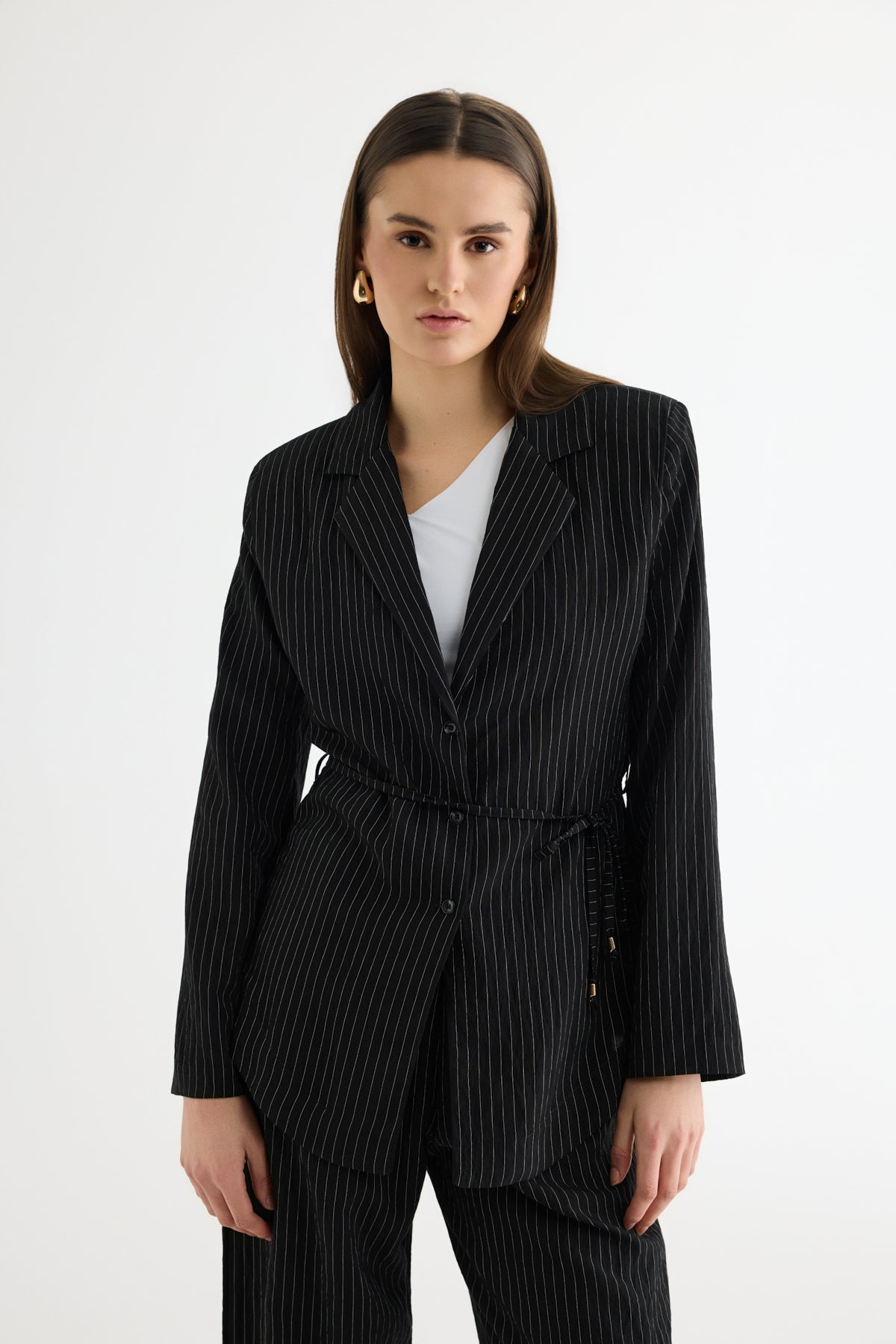 Çizgili Bağcıklı Gömlek Ceket Siyah