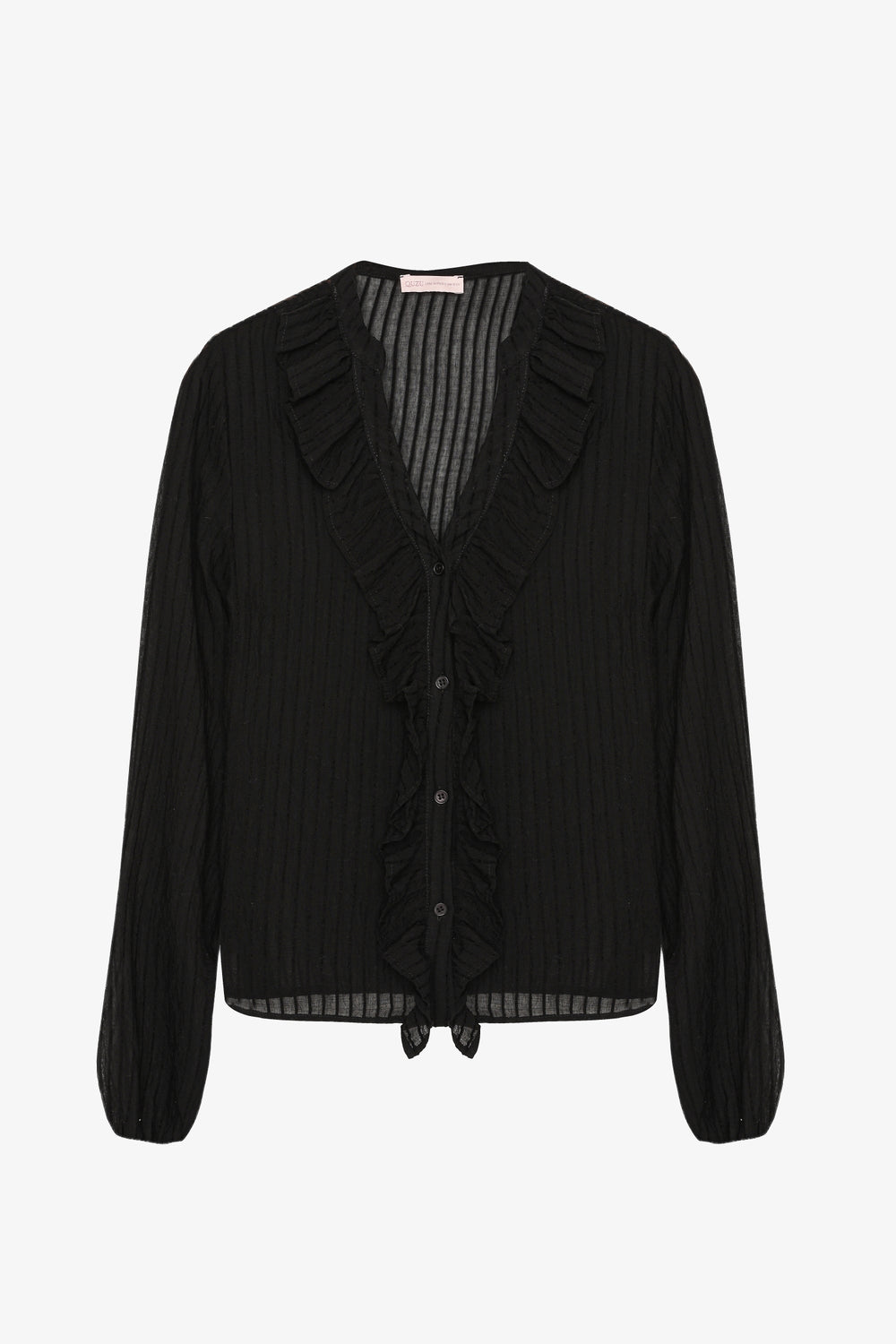 Fırfırlı V Yaka Transparan Gömlek Siyah
