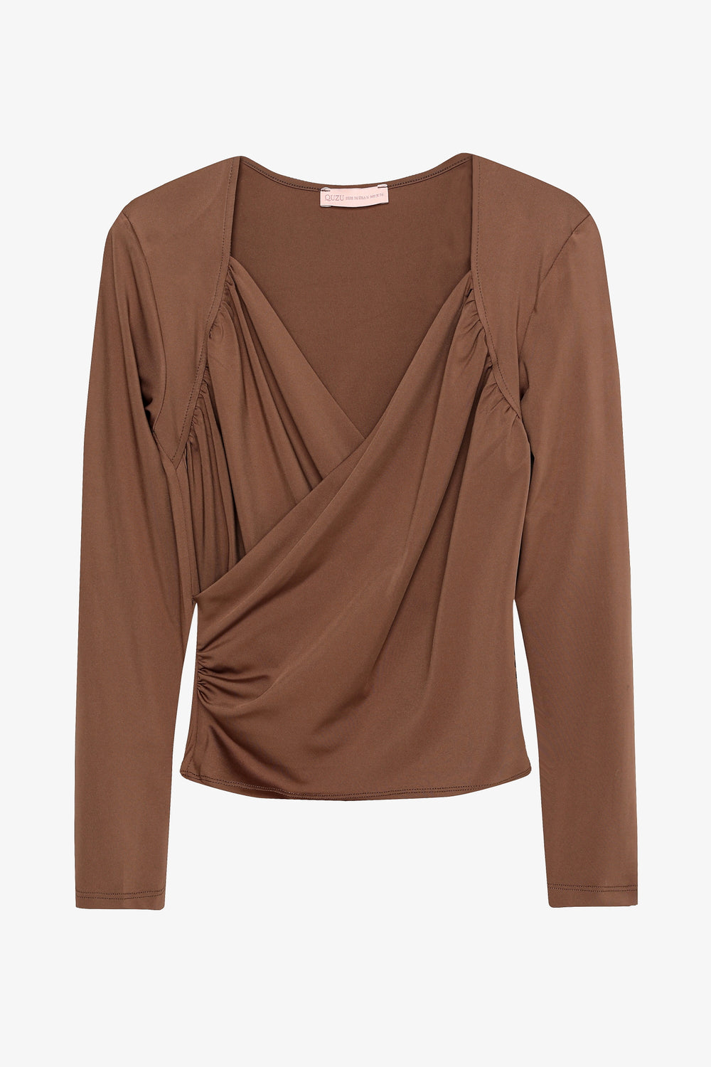 Kruvaze Yaka Drapeli Uzun Kollu Bluz Kahverengi