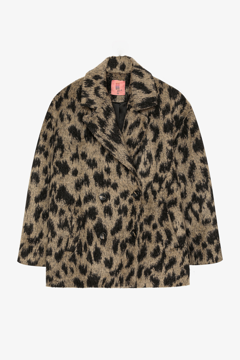 İçi kendi renginden astarlı, kruvaze yaka detaylı, çift sıra düğmeli, yan cepli, uzun kollu, leopar desenli kaban.
