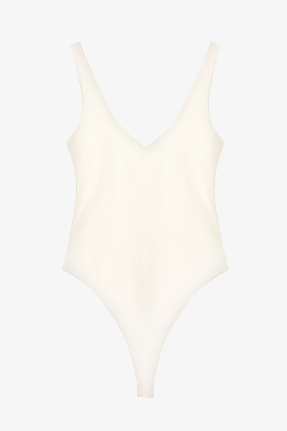 Çift kat kumaştan, sırtı derin yuvarlak yaka kesimli, kalın askılı, v yaka dekolteli, vücudu saran formda, alttan çıtçıt kapamalı, basic bodysuit.