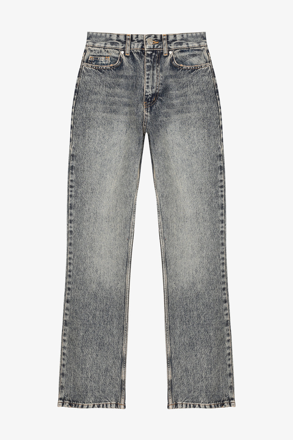 Yüksek bel, düz paça kesim, cepli, yıkama efektli, fermuarlı ve düğme kapamalı, kot pantolon.
