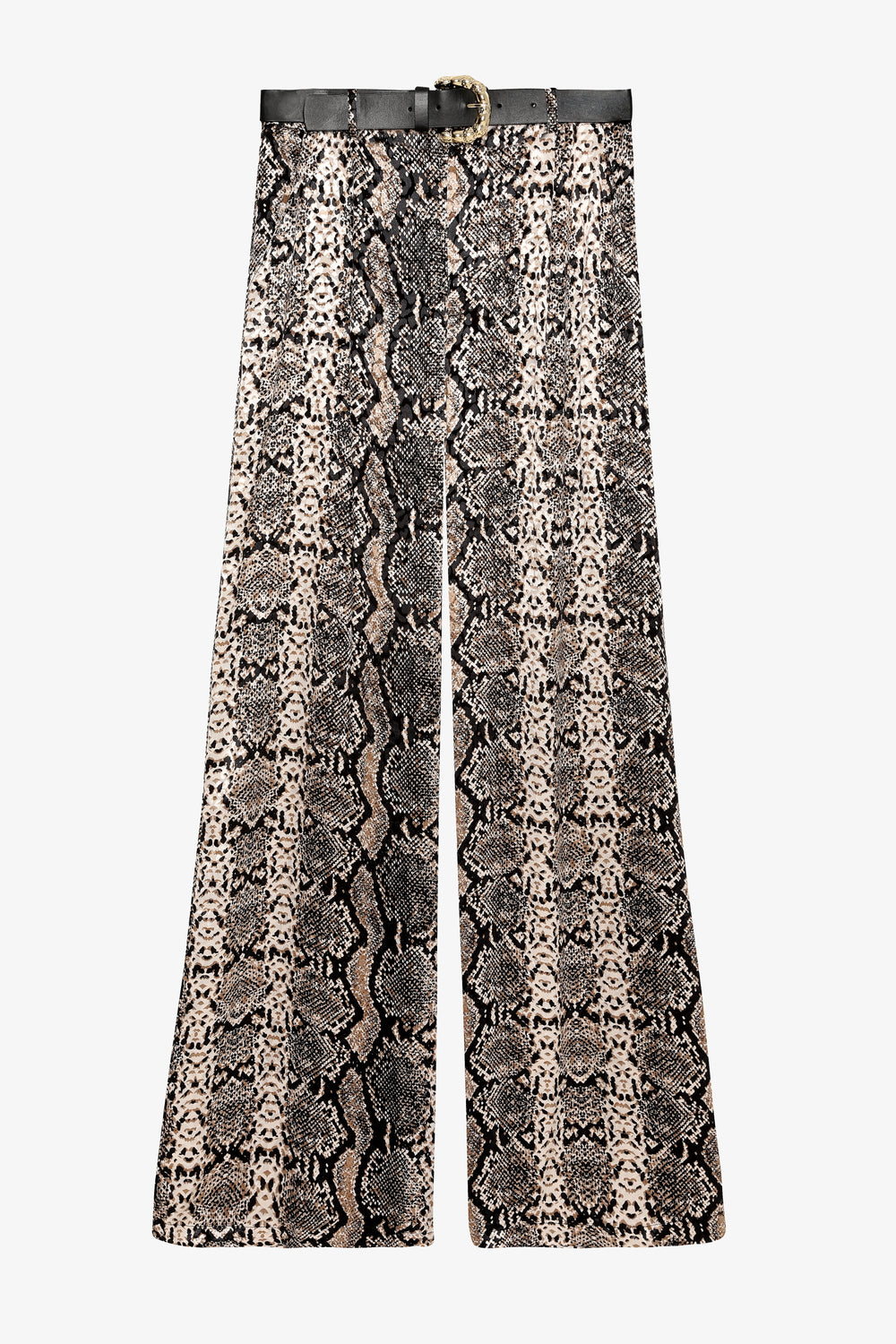 Yılan deseni baskılı, yüksek bel, bol paça, yan cepli, fermuarlı ve kanca kapamalı, gold kemer aksusarlı, uzun bol paça pantolon.