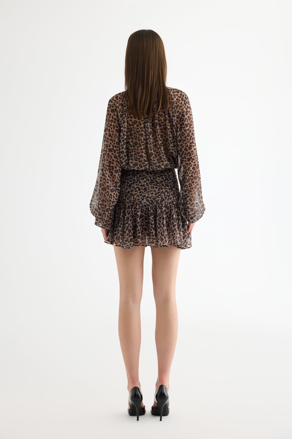 Leopar Desenli Fırfırlı Şifon Mini Etek Kahverengi