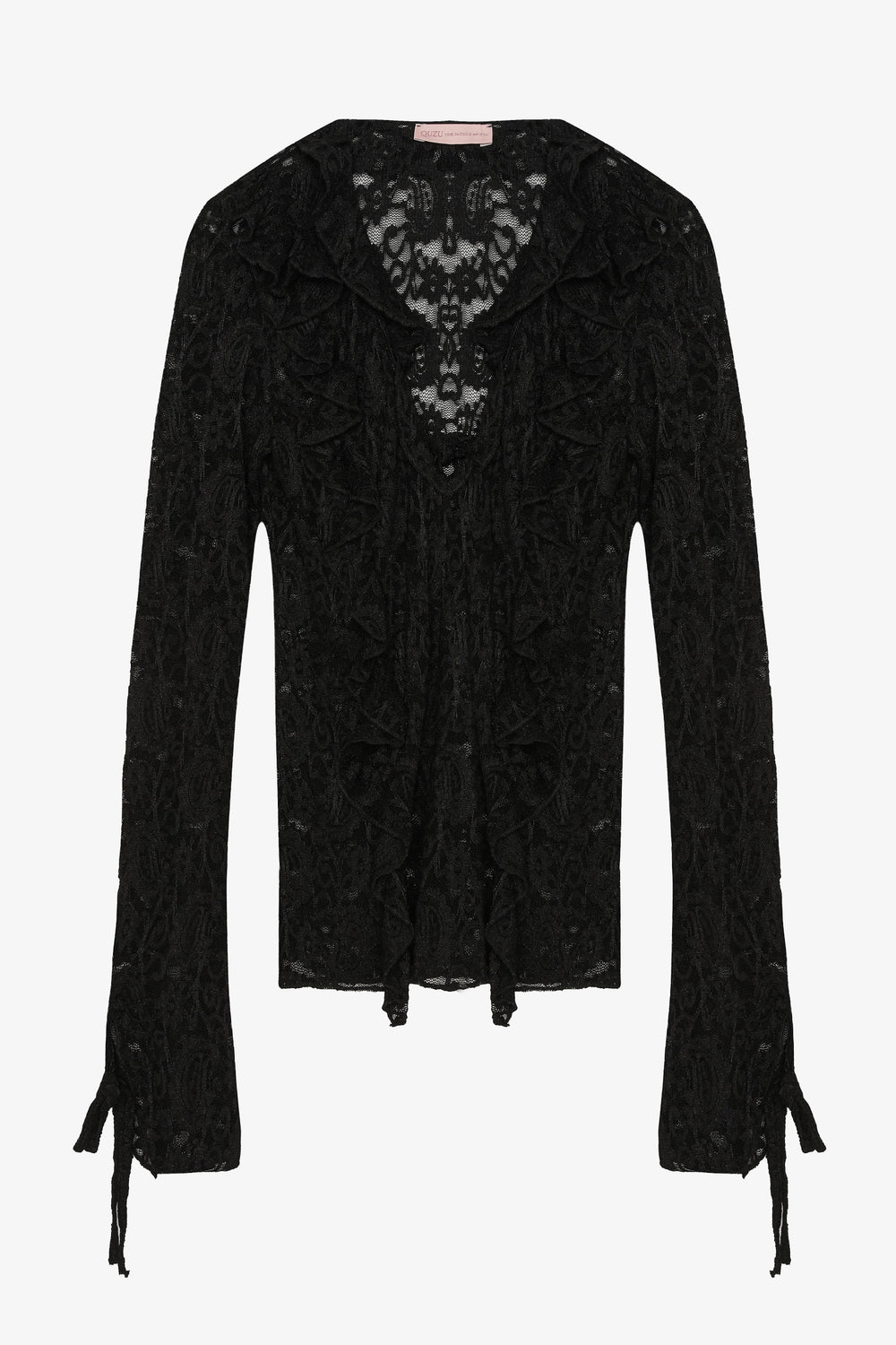 Fırfırlı V Yaka Dantel Bluz Siyah