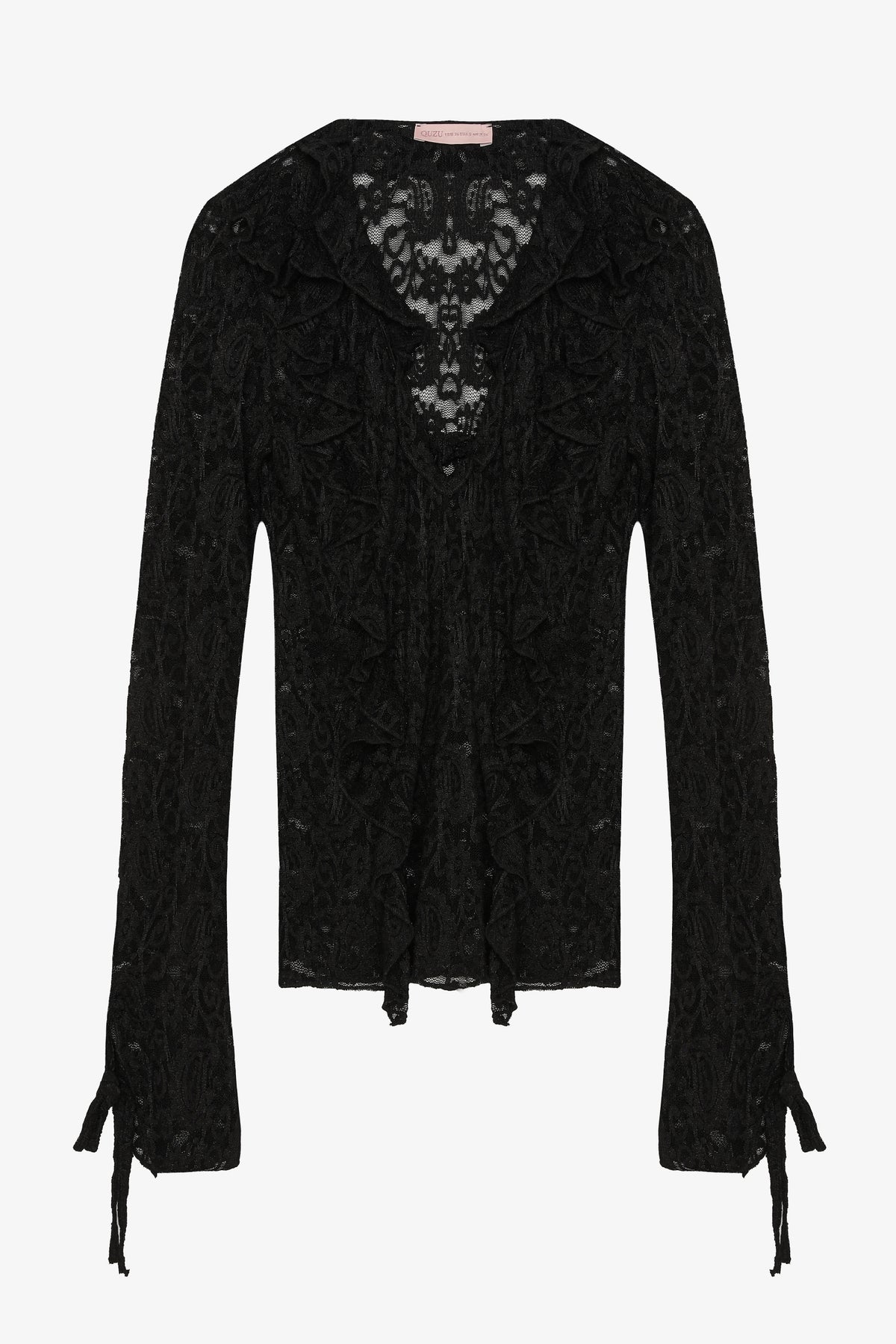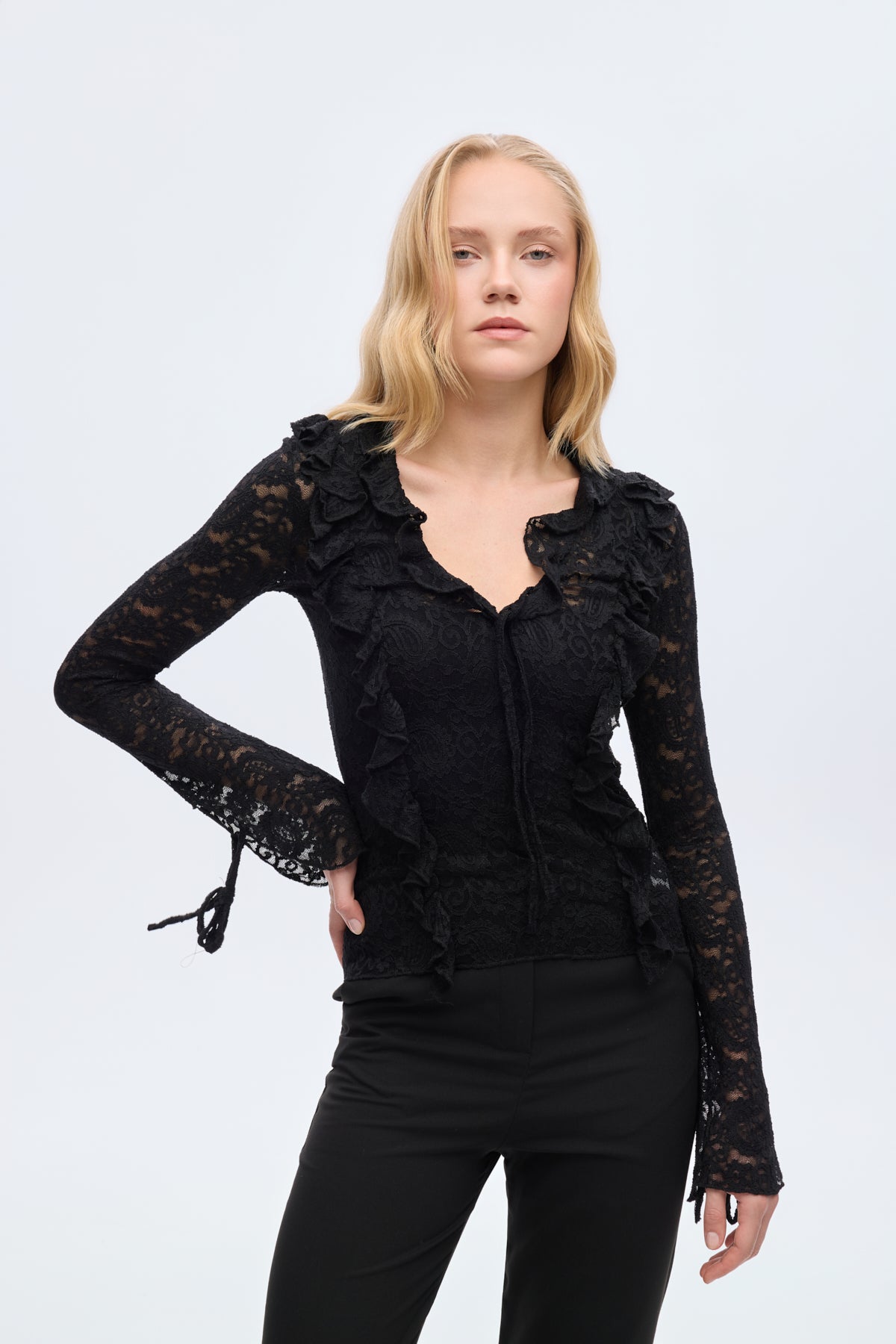 Dantel kumaştan, ön kısmı bağlama detaylı, uzun kollu, kol uçları bağcıklı, fırfırlı v yaka, transparan görünümde bluz.