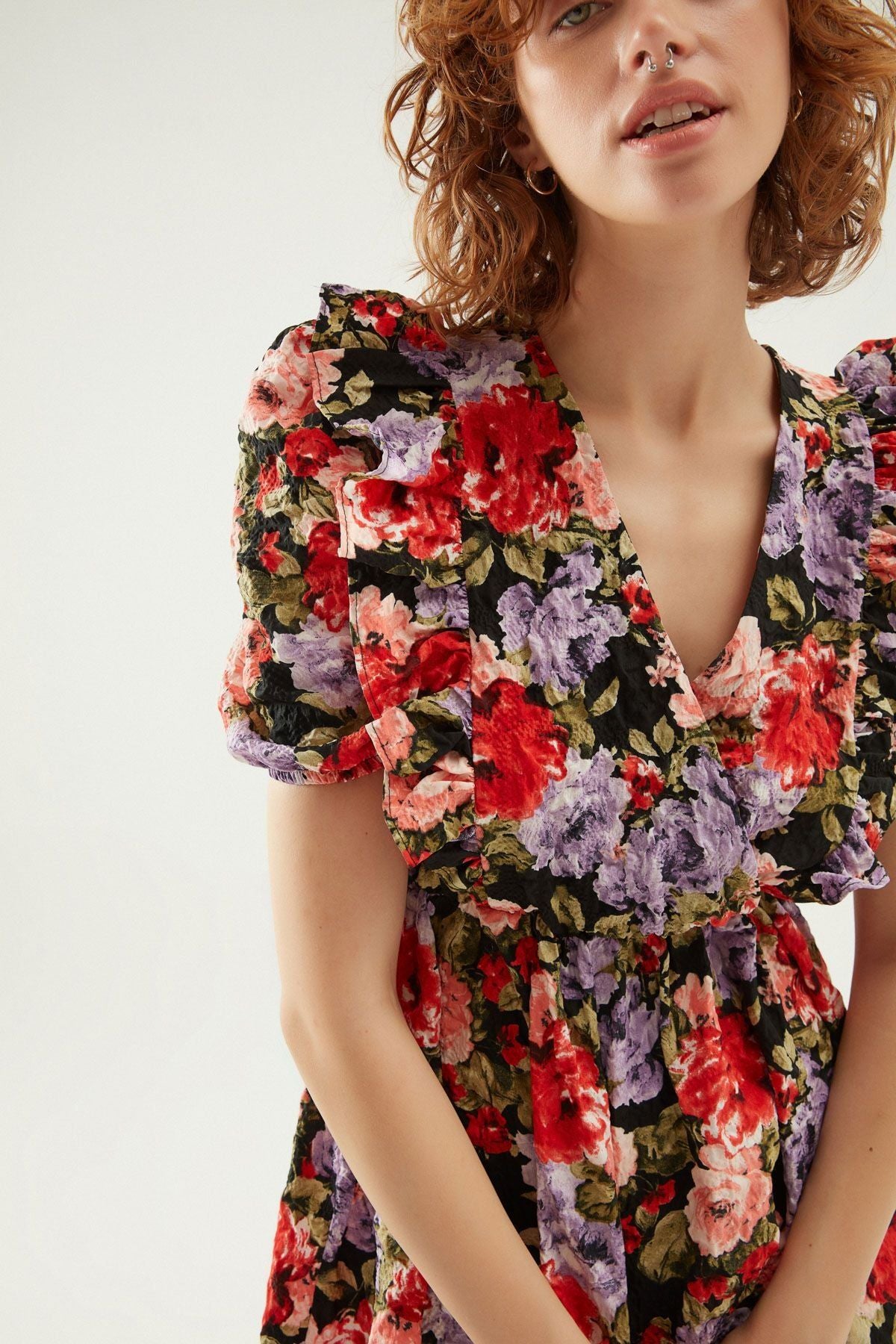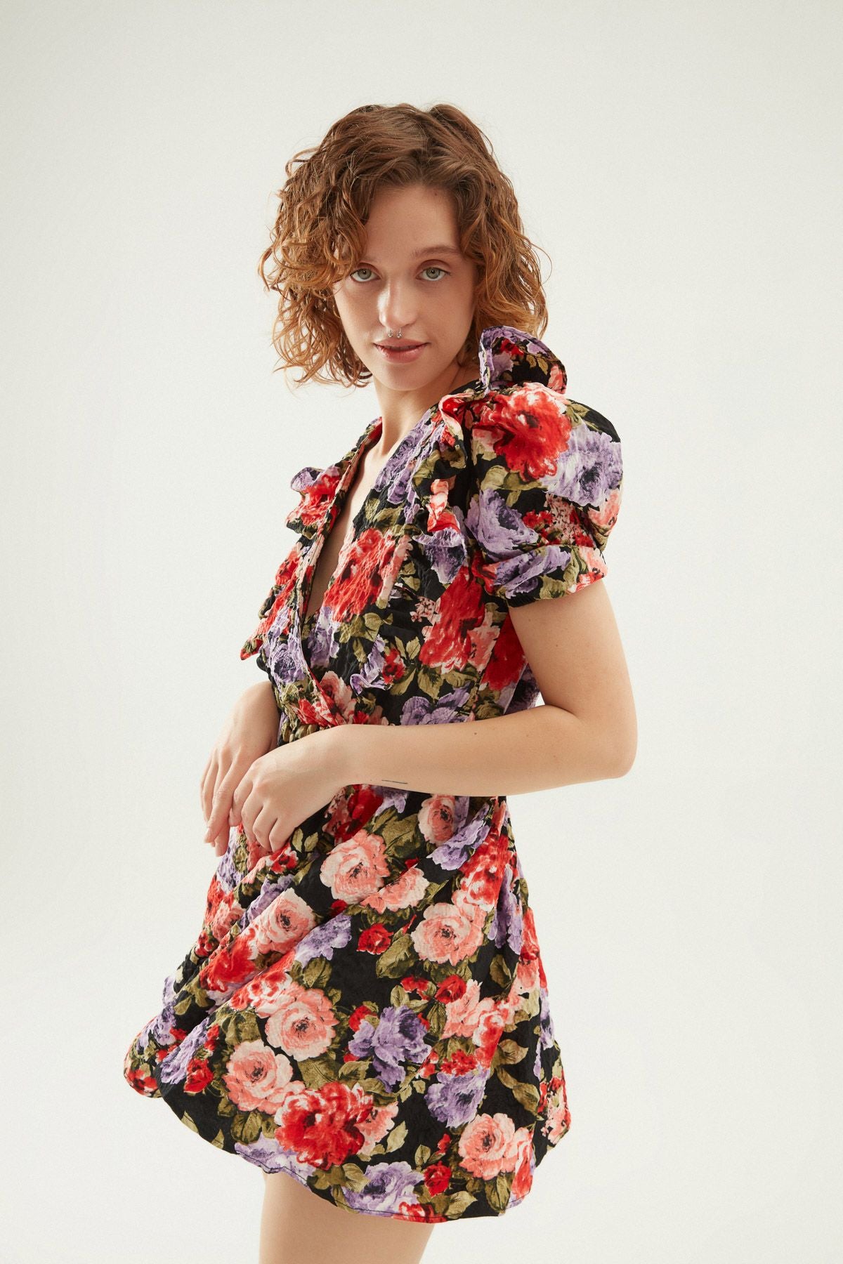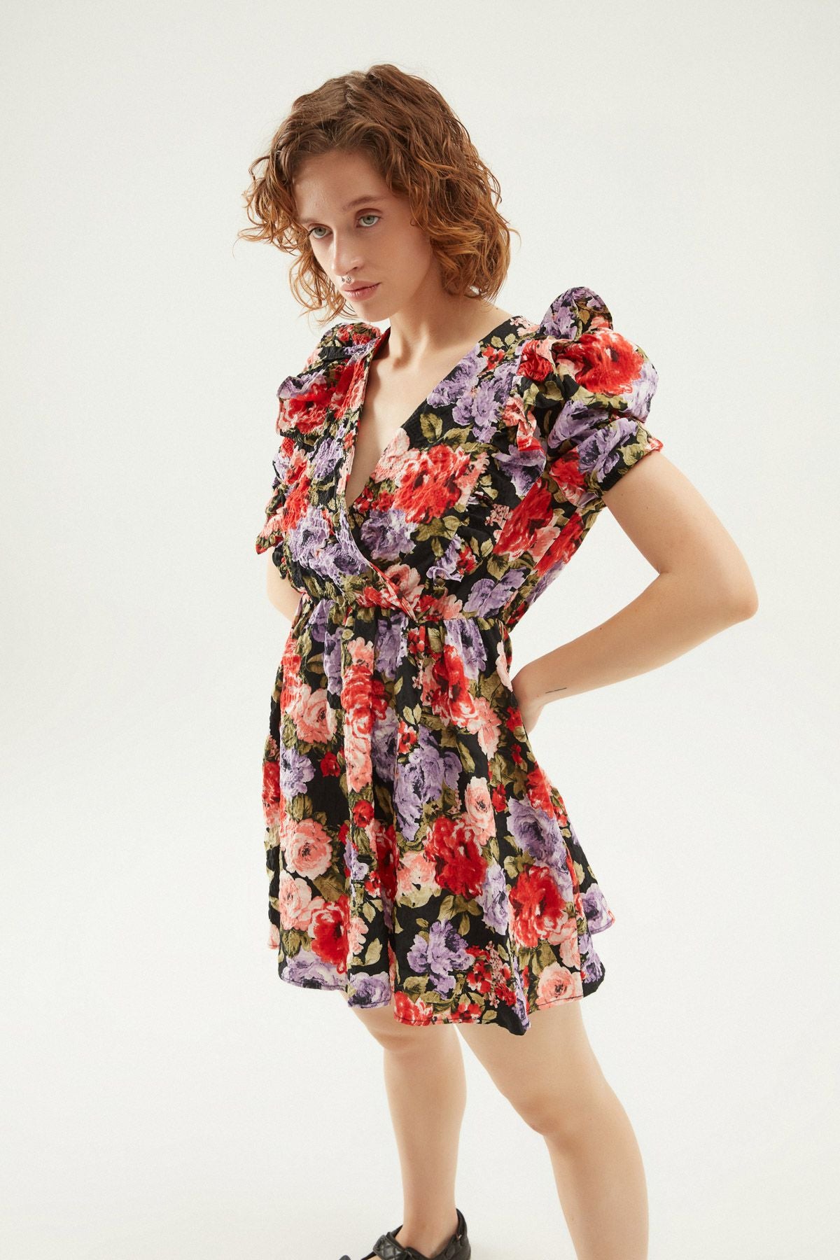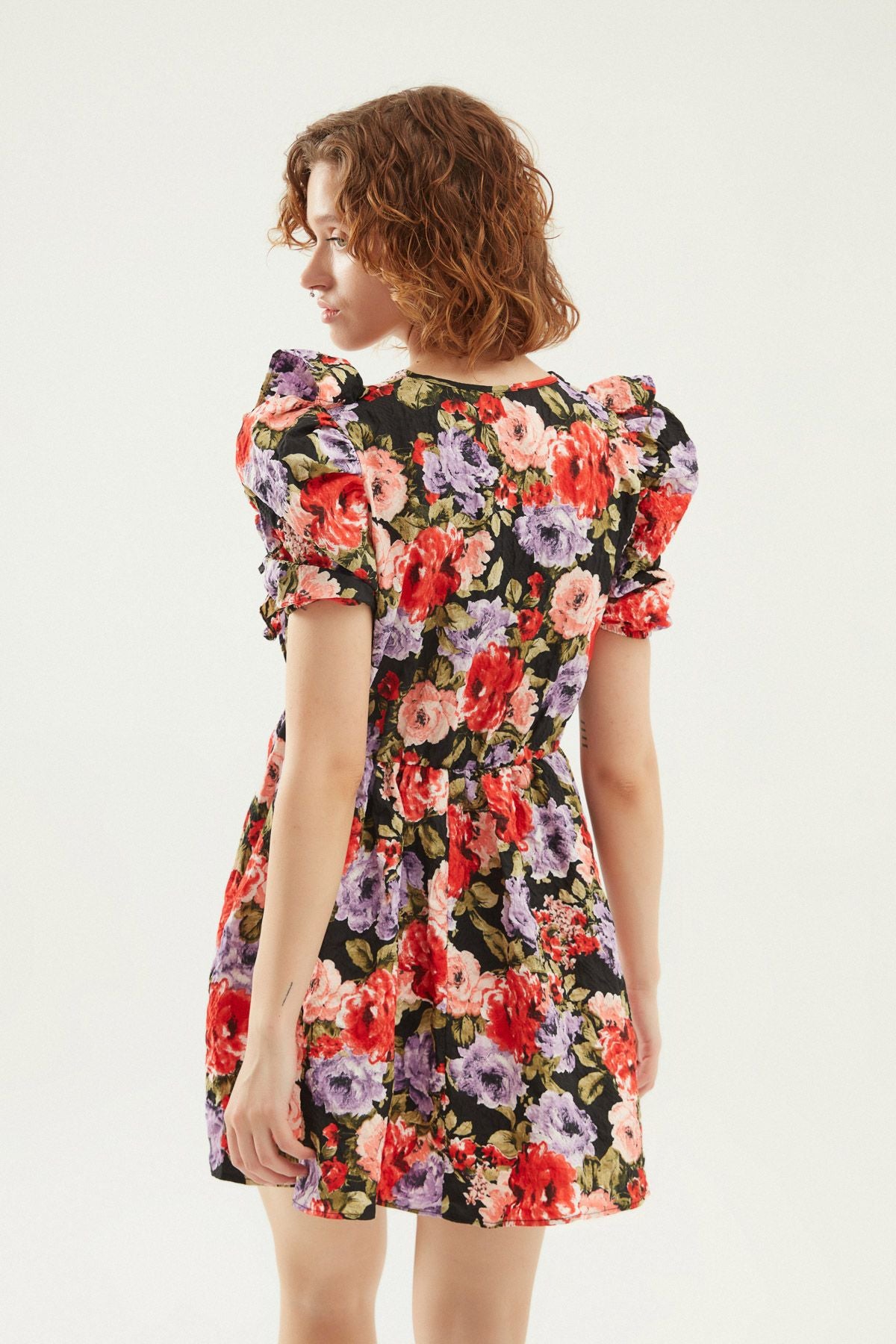 Renkli çiçek deseni ve balon kol detayıyla hareketlenen Desenli Fırfırlı Balon Kol Elbise, casual stiliniz için kalın tabanlı sandalet veya spor ayakkabı ile total görünümüzü tamamlayabilirsiniz. Kontrast renkte bir el çantası ile şıklığınız bütünlemiş olacaksınız.