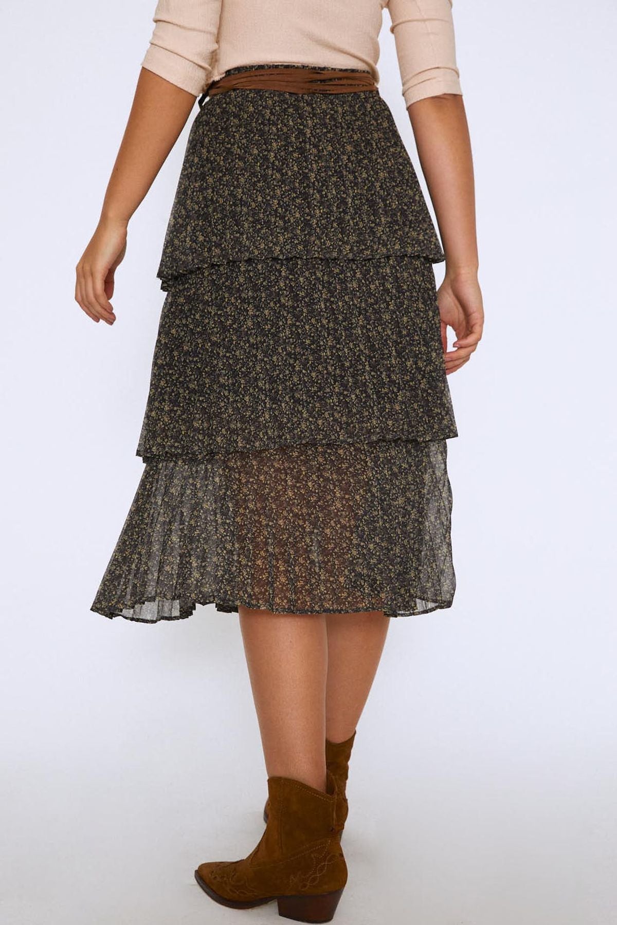 Bel kısmında yer alan kemeri ile aksesuarın tamamlayıcı gücünü yansıtan kat kat etek, bulunduğu her ortamda fark yaratmaya hazır. Quzu eteğini kısa botlarla kullanabilirsin.