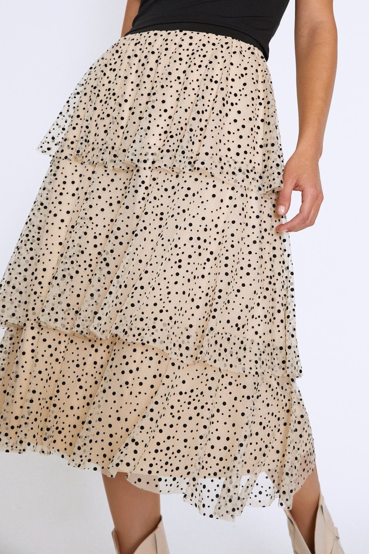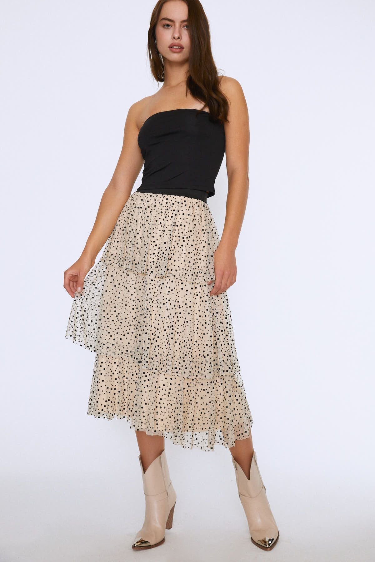 Fırfırlı Beli Lastikli Uzun Etek Bej