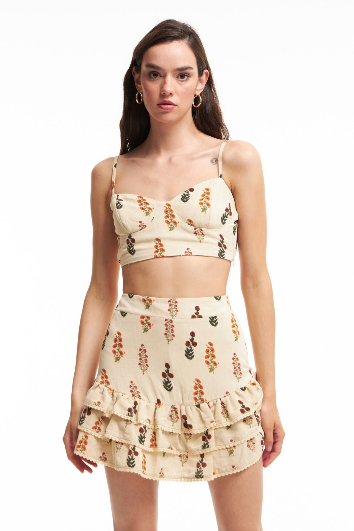 Fırfırlı mini etek modelini aynı renk ve desendeki bluz modelimiz ile birleştirdiğinde yaz mevsiminin coşkusunu yansıtabilirsin. Kombininde zahmetsizce sevimli ve romantik bir görünüm istiyorsan keten mini etek modeline şans verebilirsin. Keten, viskon ve pamuk içerikli desenli mini etek modeli hoş görünümünün yanı sıra içinin şortlu olması ile konforlu giyim sunar.