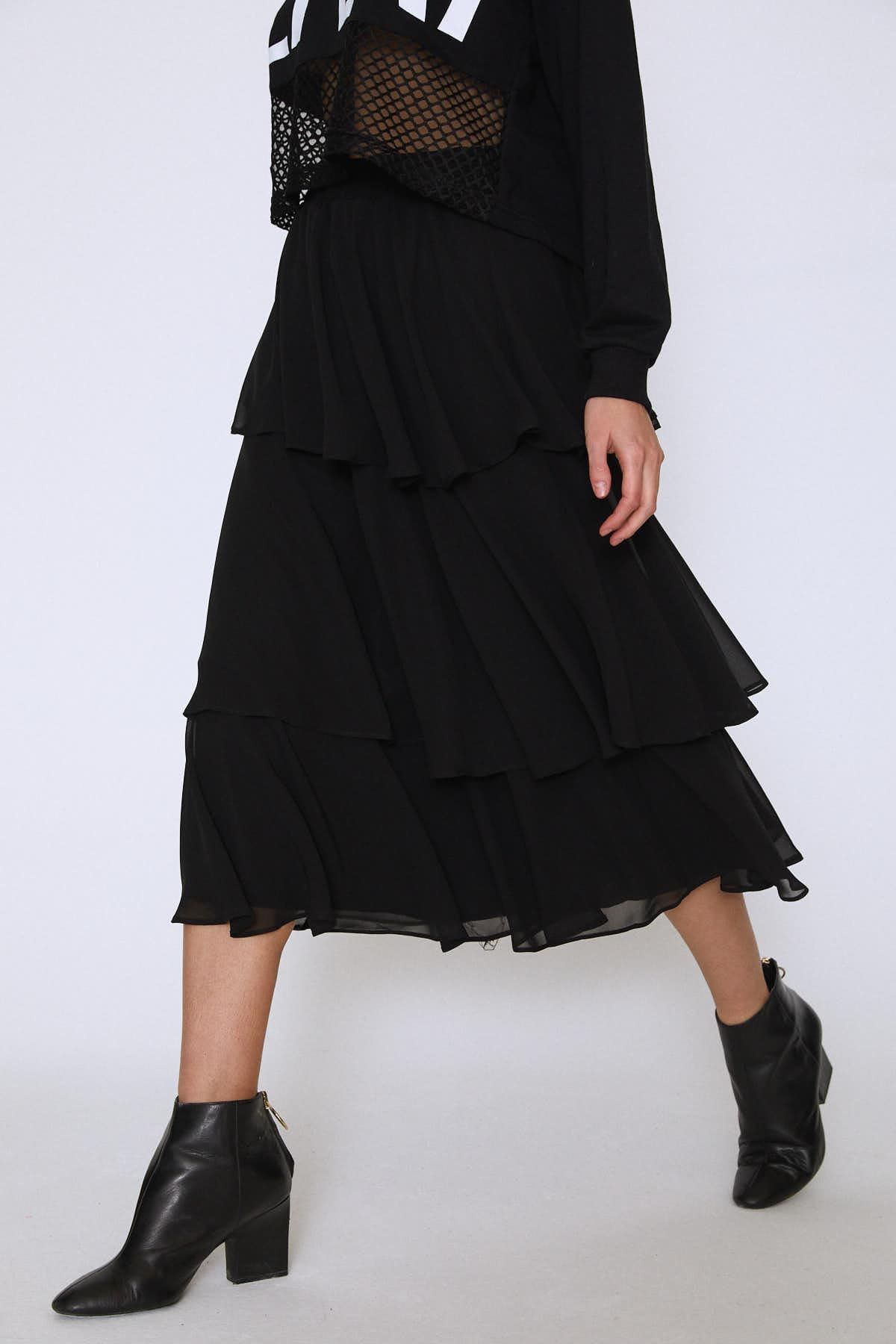 Kumaş eklemeleri ile kat kat bir görünüm kazandırılan etek, harika kombinler için olanak tanıyor. Eteğin kumaş yoğunluğunu, file detaylı bluzun tarzı ile dengeleyebilir, farklı tarzını ön plana çıkarabilirsin.