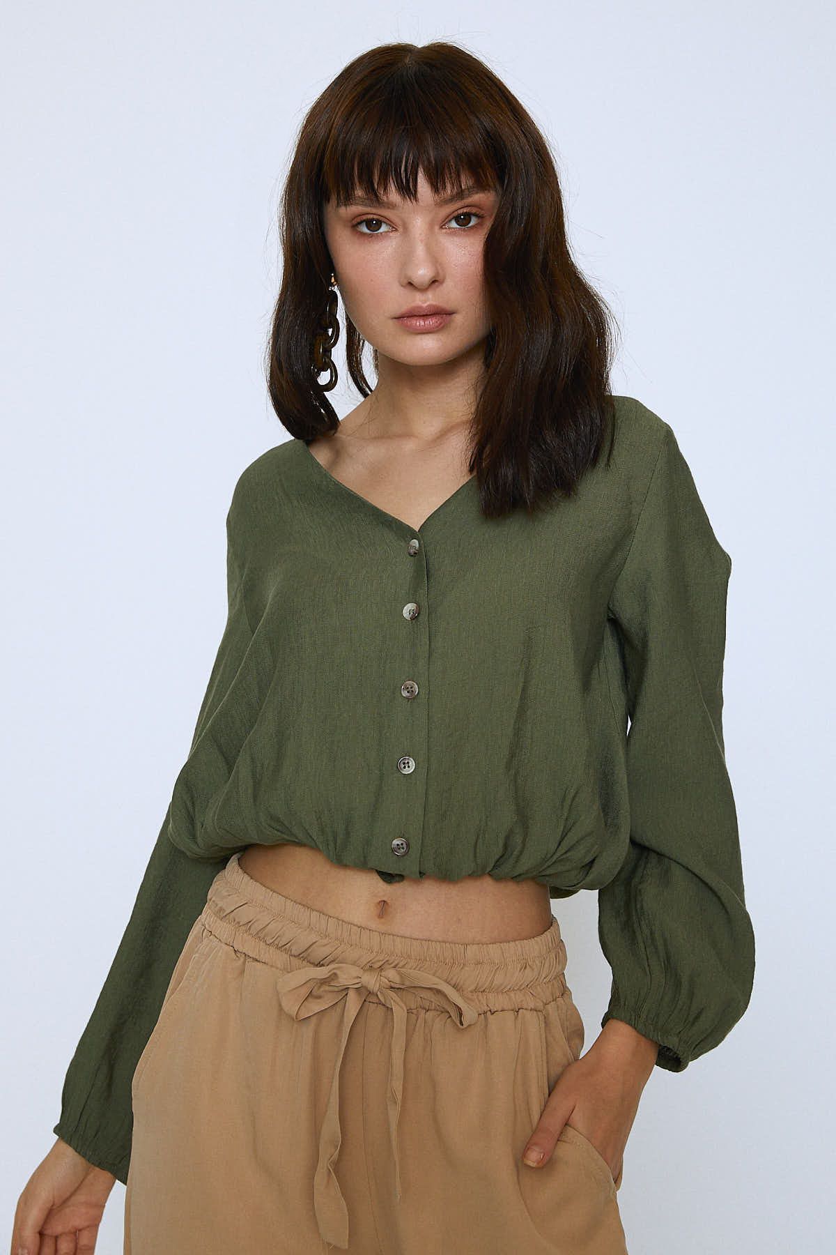 Beli Büzgülü Bağlamalı V Yaka Gömlek Haki