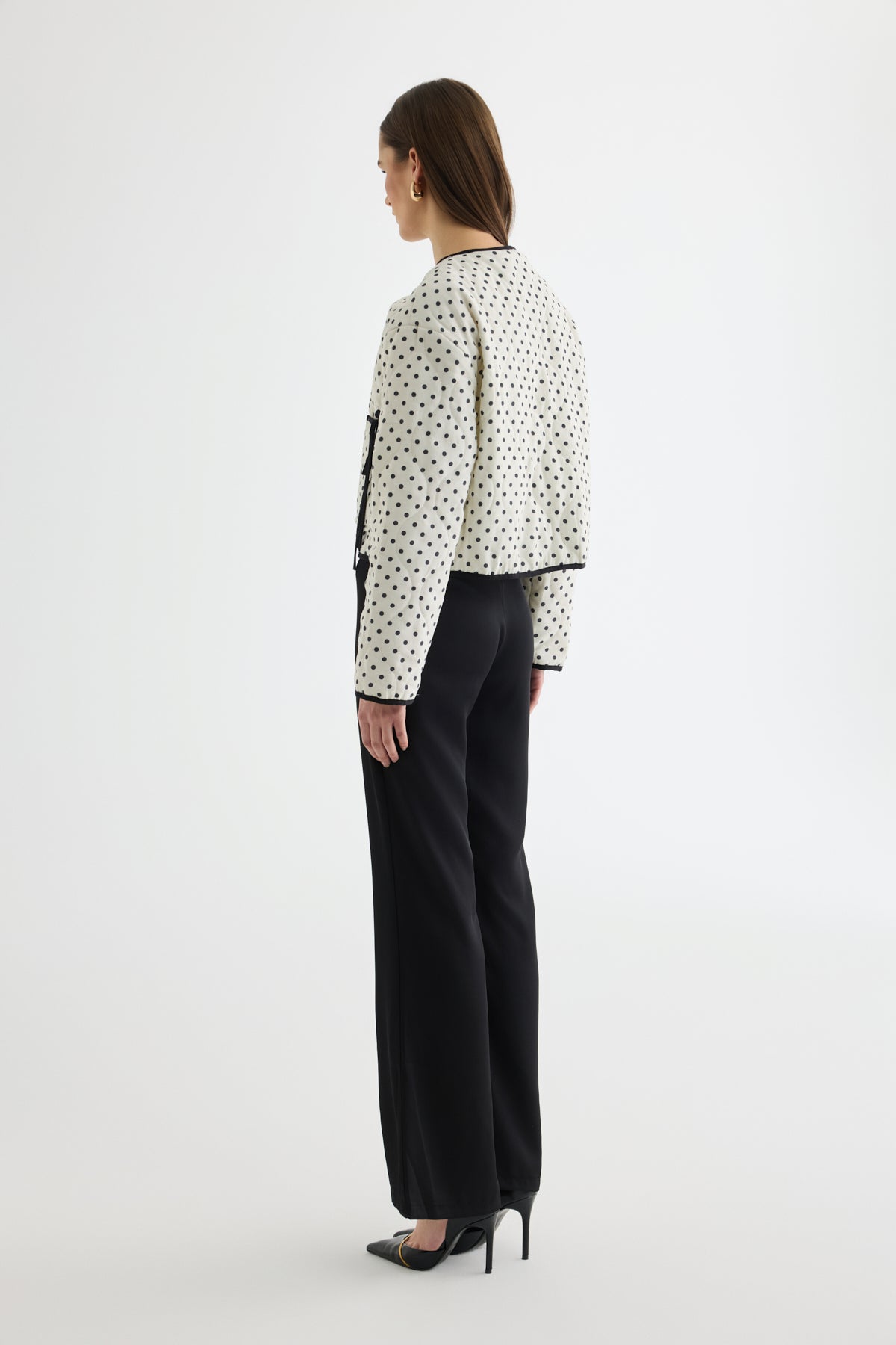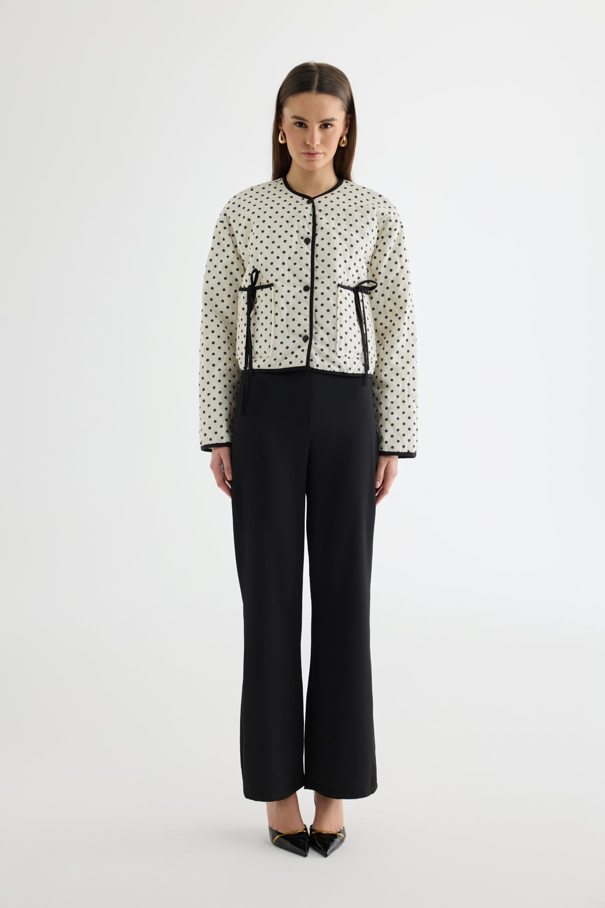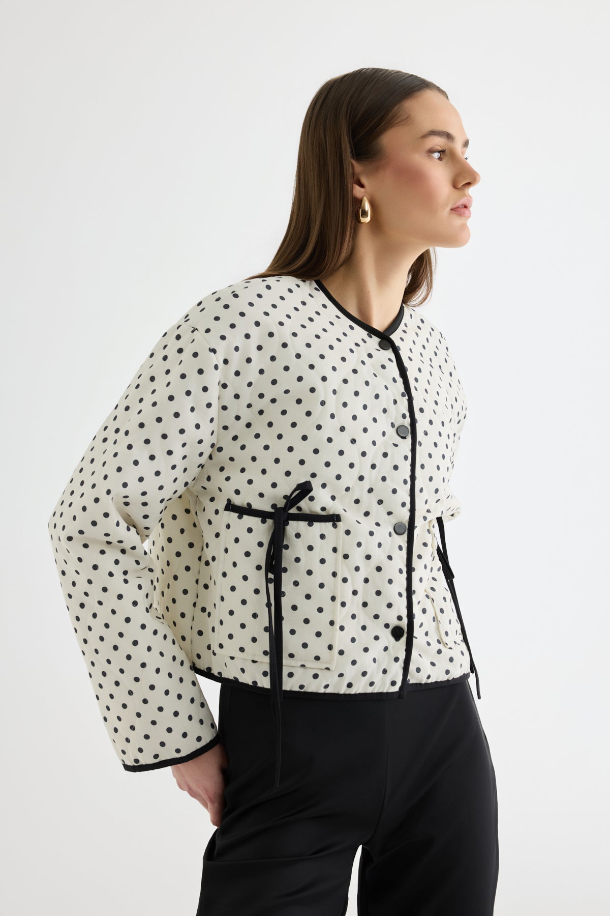 Puantiyeli Bağcıklı Kapitone Ceket Krem