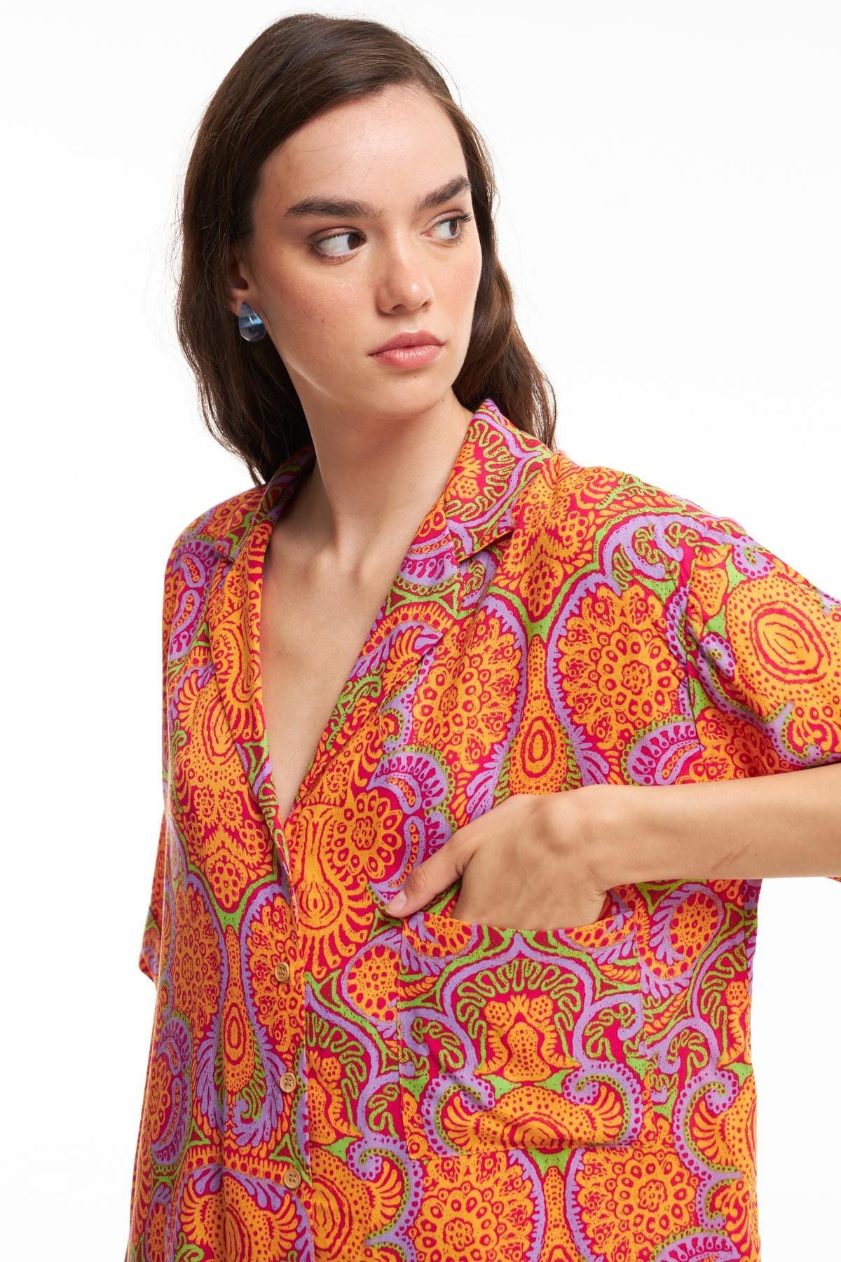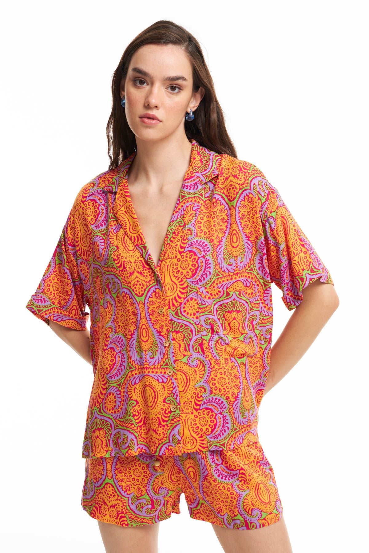 Kadınların çok yönlü giyim parçalarından desenli gömlek modelini aynı renk ve desendeki şort modeli ile kombinleyerek yazın enerjisini yansıtan dikkat çekici bir tarz oluşturabilirsin. Viskon içerikli oversize gömlek modelini istersen daha sade alt giyim parçaları ile birleştirerek gömleğin rengini ve desenini ön plana çıkarabilirsin. Tek ceptir.