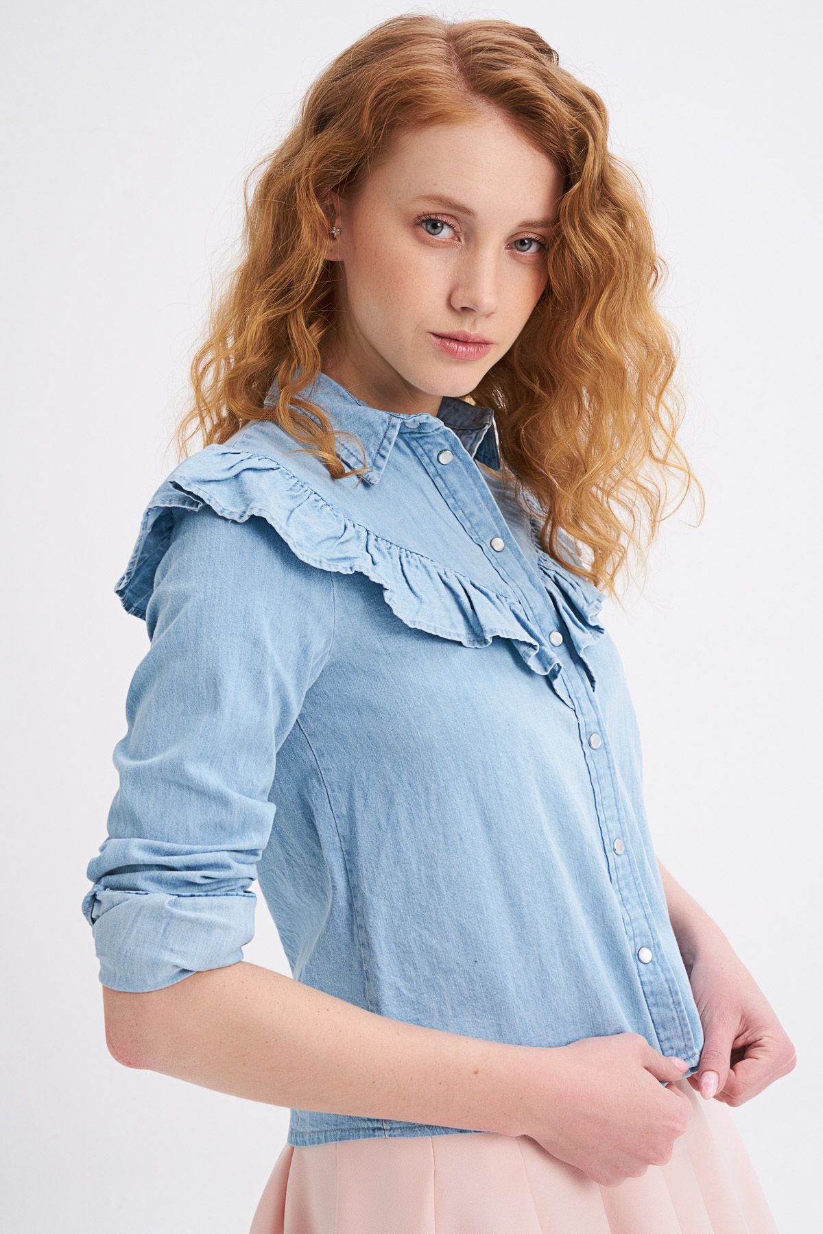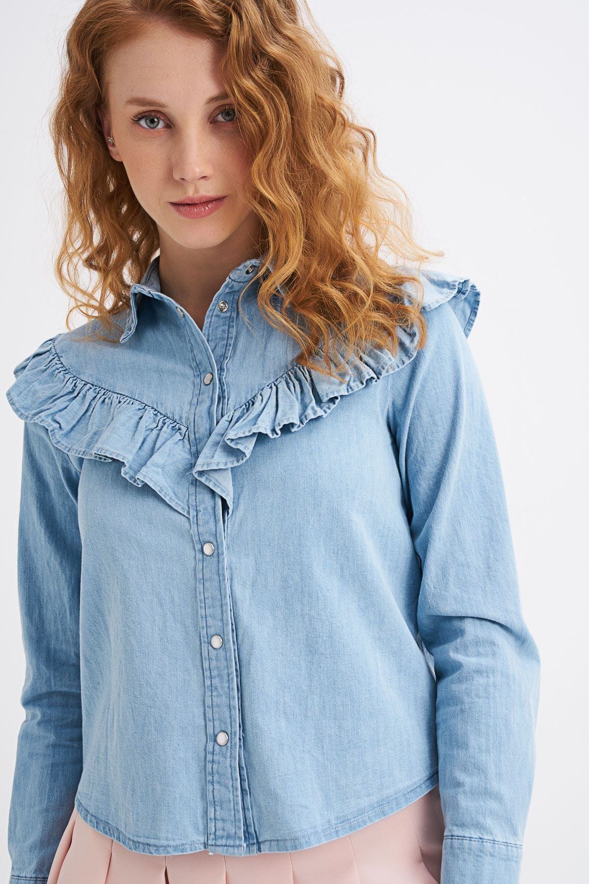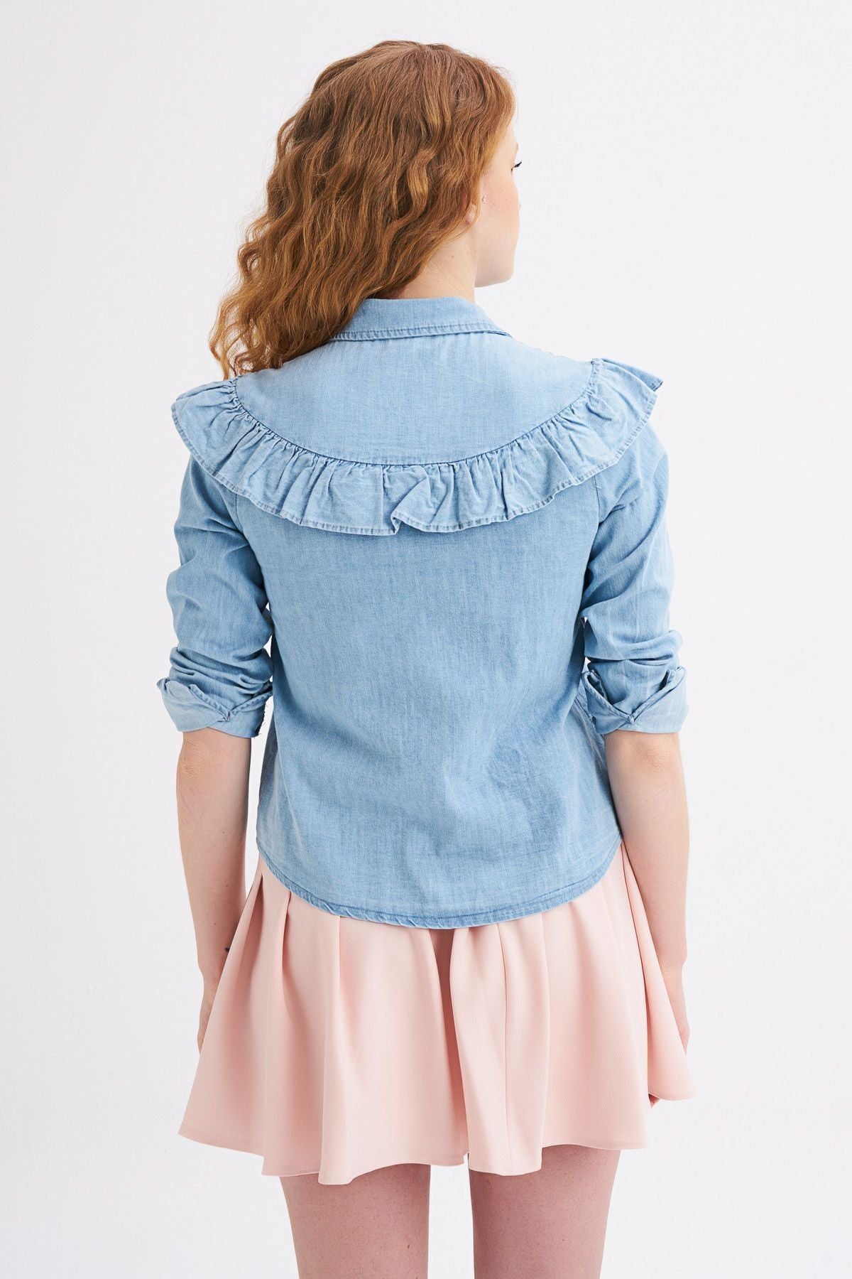 Bu bahar beyaz jean ile konforlu ama şık bir görünüm sağlayabileceğin fırfır detaylı mavi kot gömlek ile tanış.