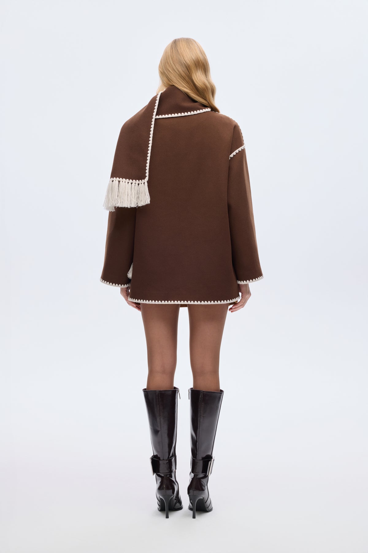 Çıkarılamayan püsküllü şal detaylı, kontrast işleme görünümlü biyeli, astarlı, önü düğmeli, büyük cepli, oversize kısa kaban.
