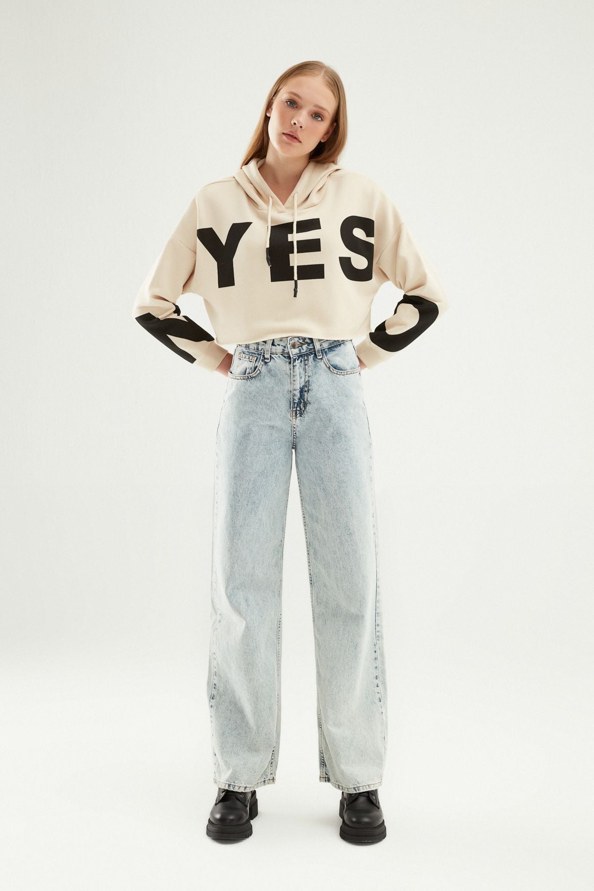 Baskılı Crop Sweatshirt Bej