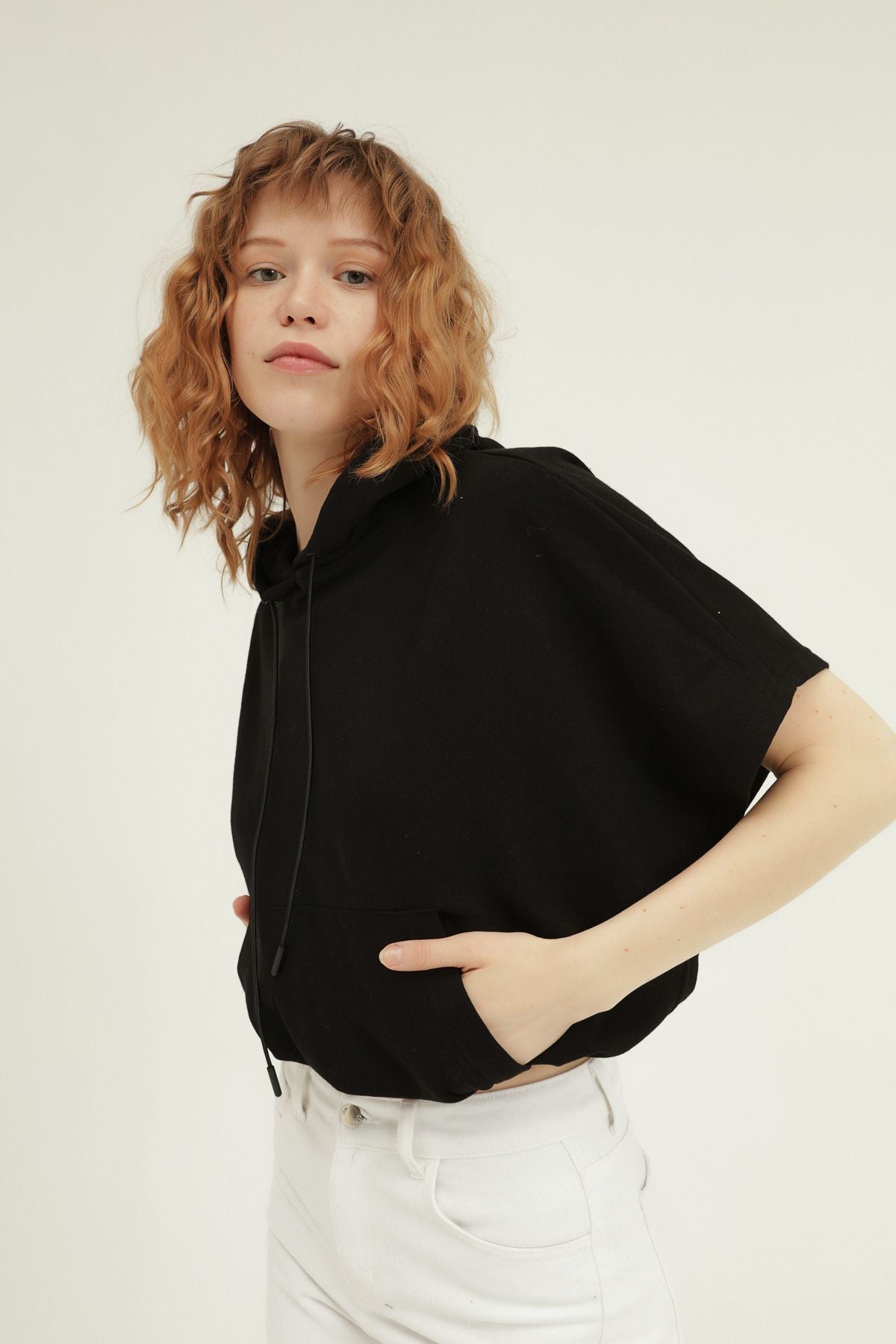 Yarasa Kol Kapüşonlu Sweatshirt Siyah