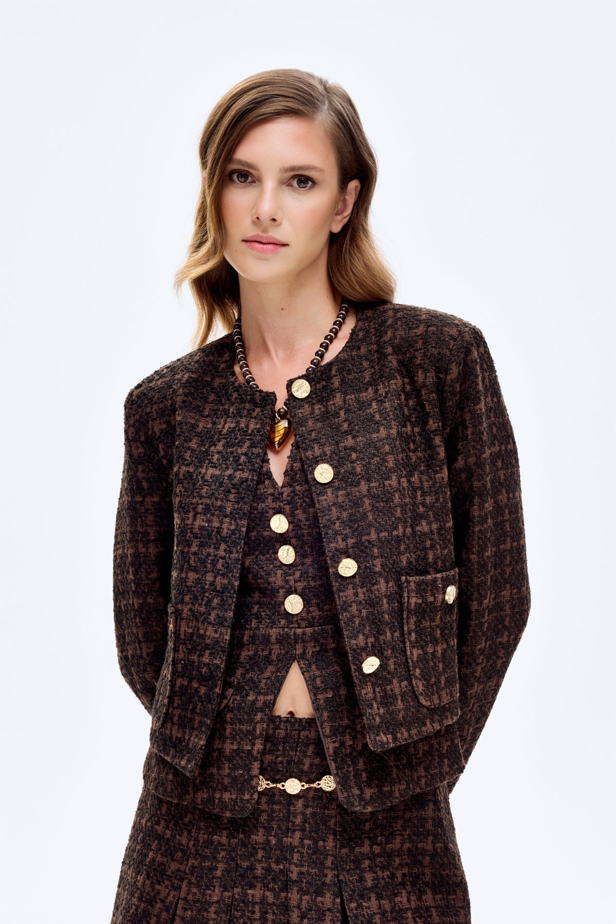 Yuvarlak Yaka Gold Düğmeli Tüvit Ceket Kahverengi