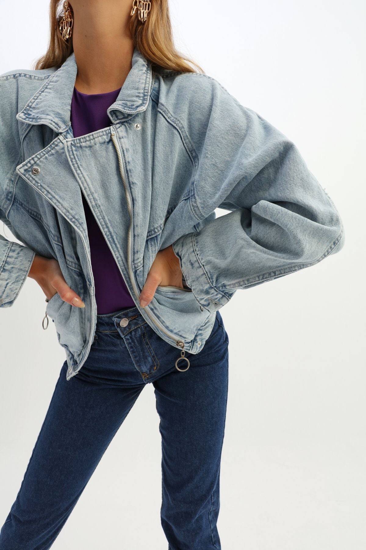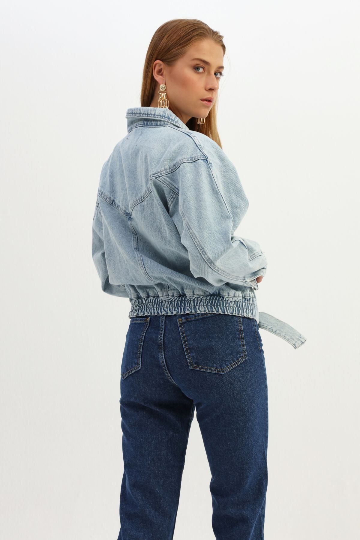 Kemer Detaylı Fermuarlı Kot Ceket Buz Mavi