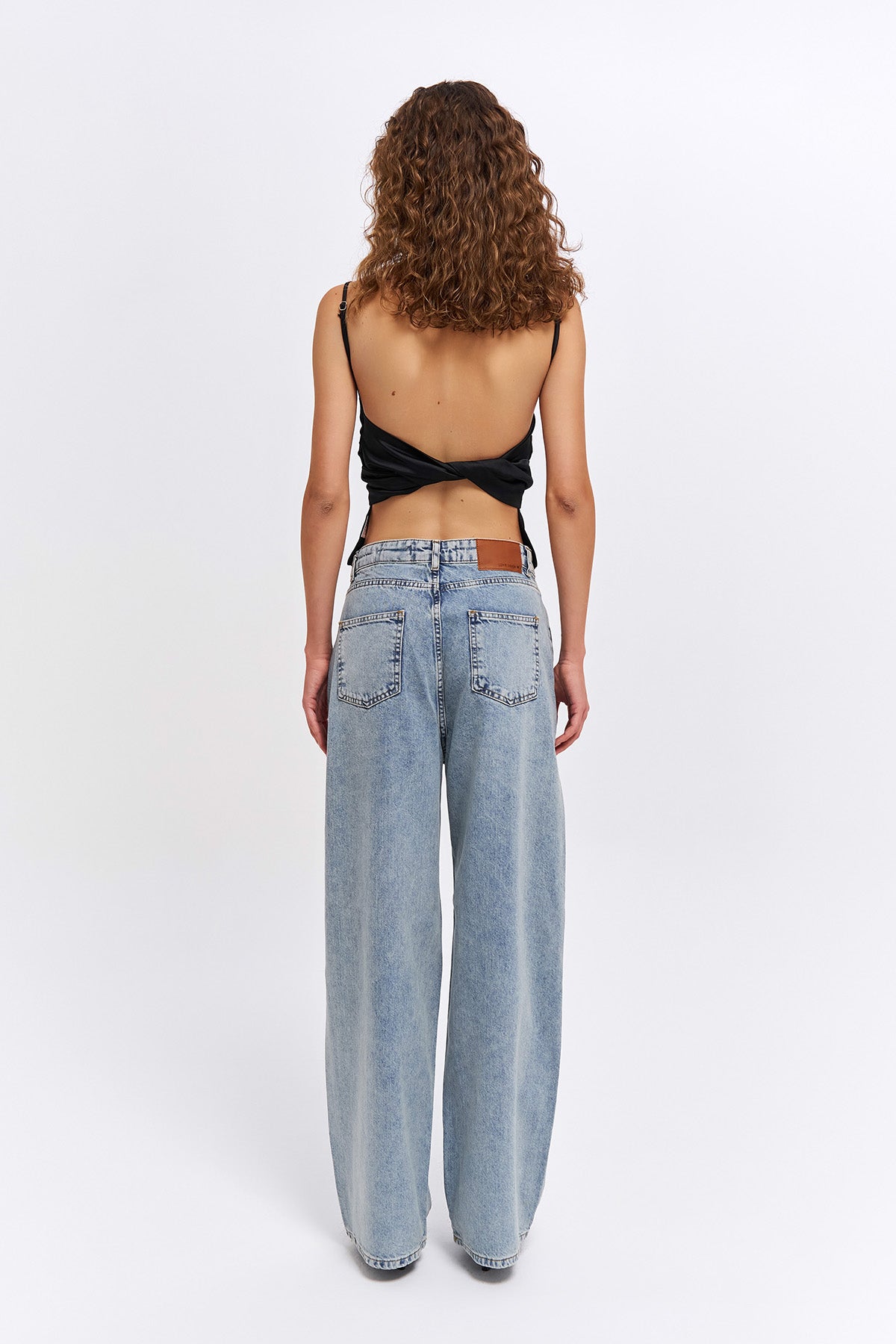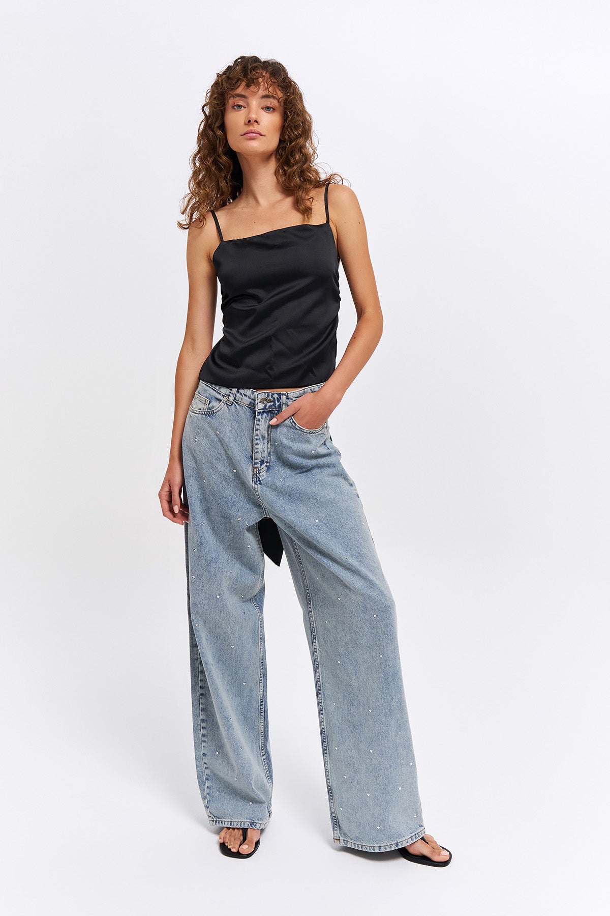 Yüksek bel, bol paça, taş detaylı kot pantolon.
