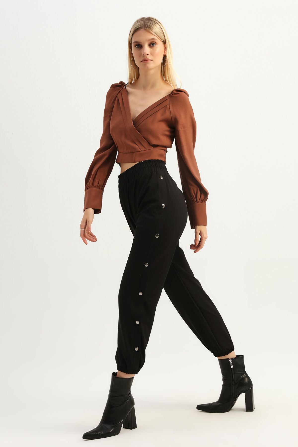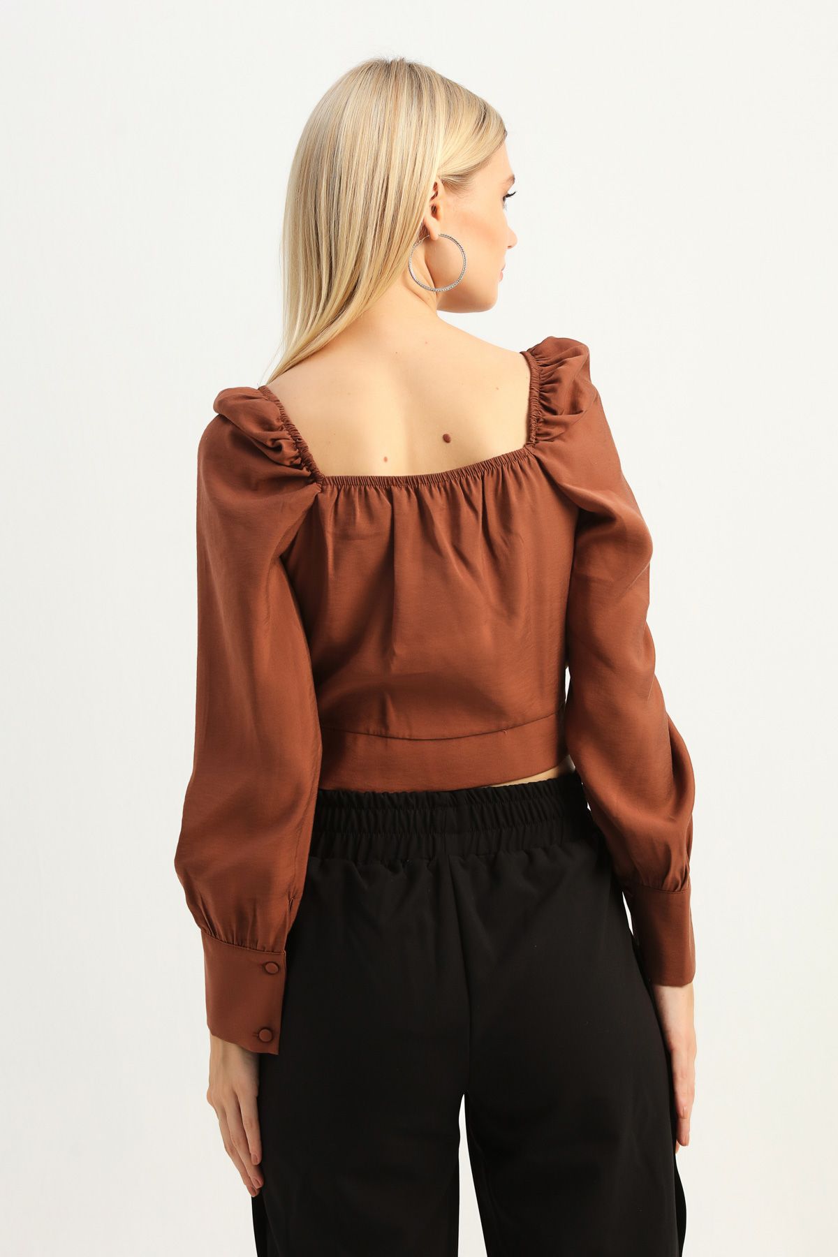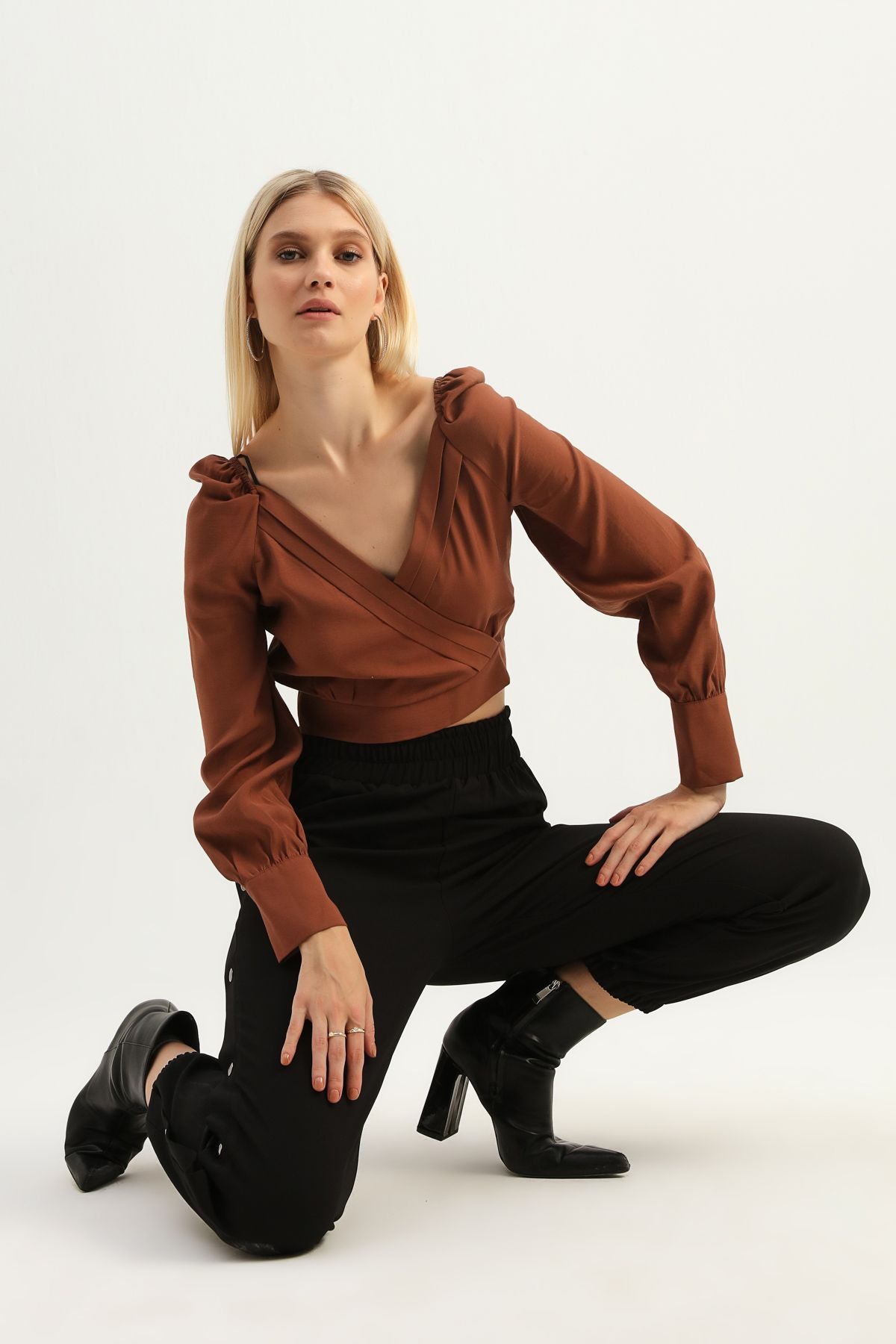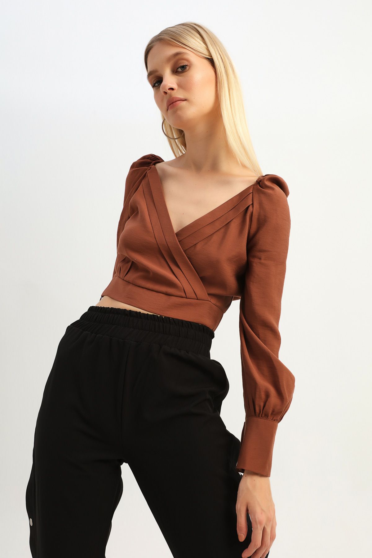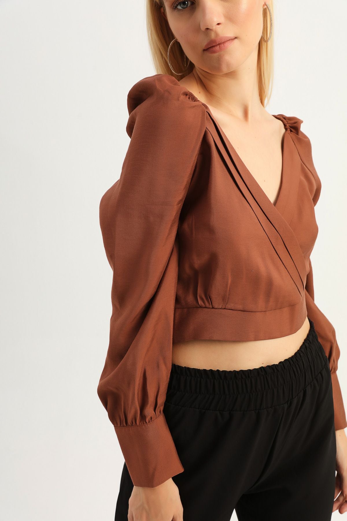 Balon Kol Kruvaze Crop Bluz Kahverengi