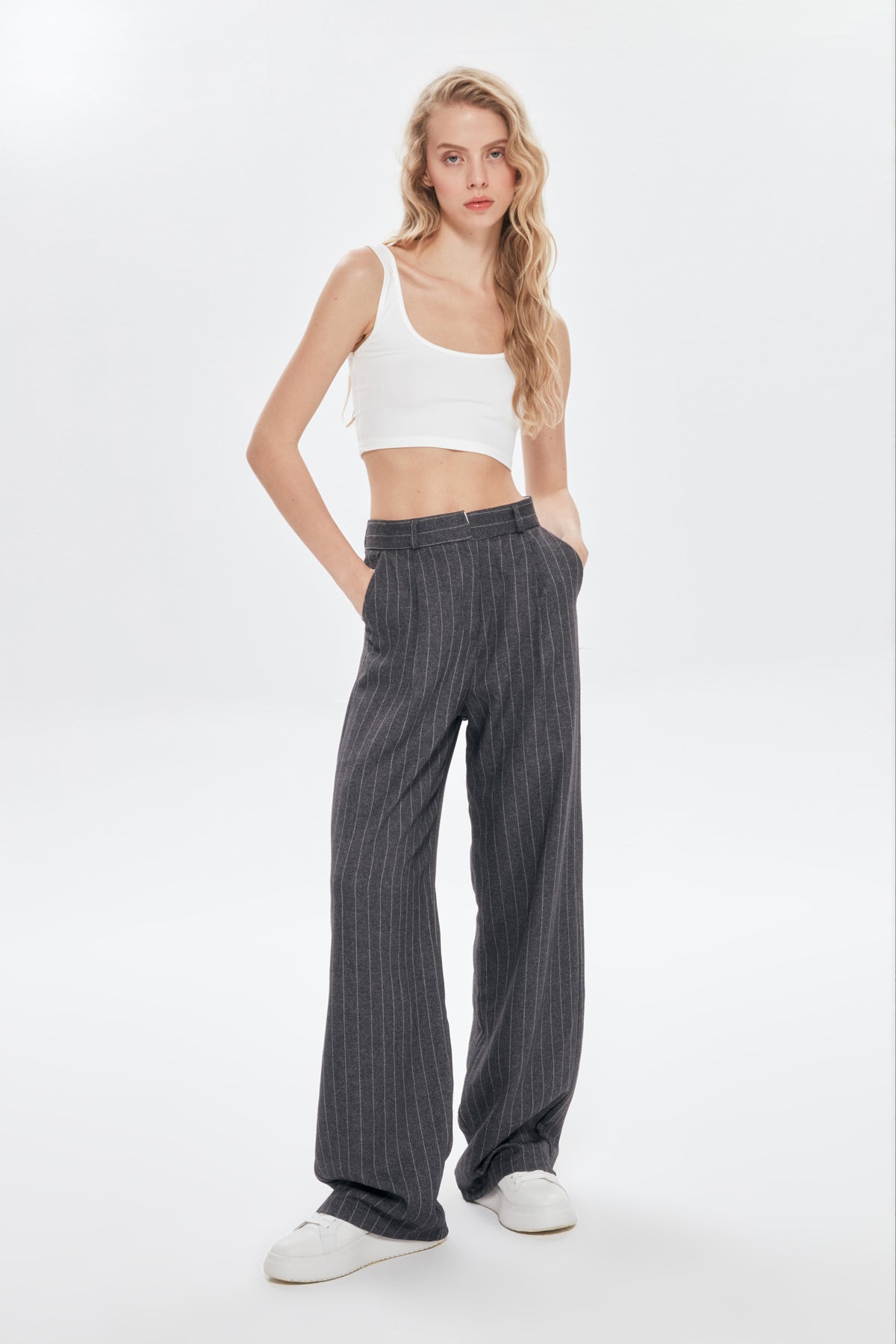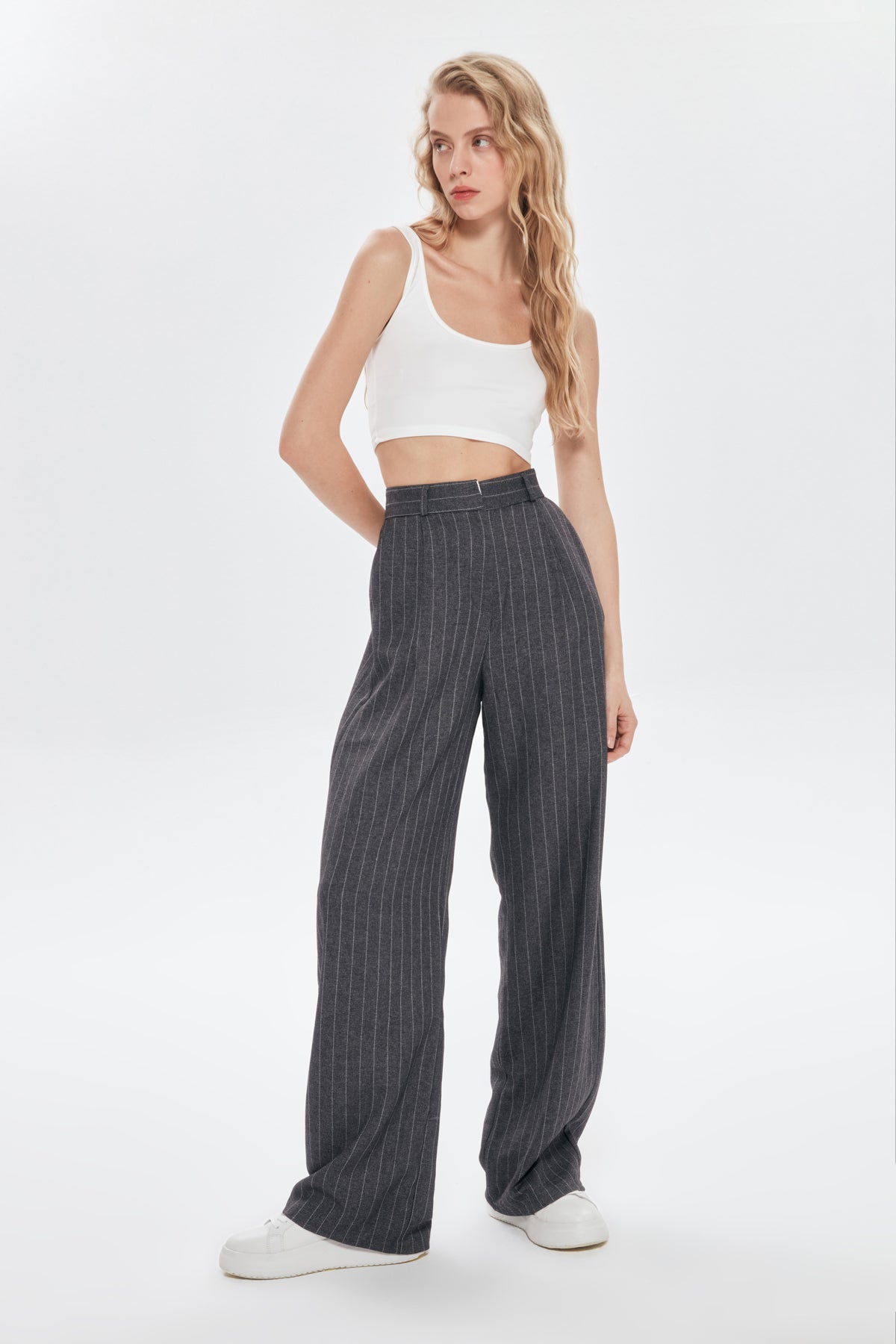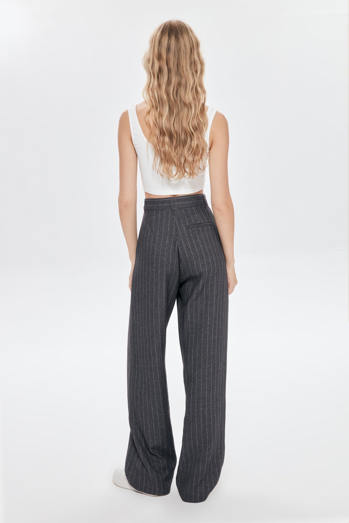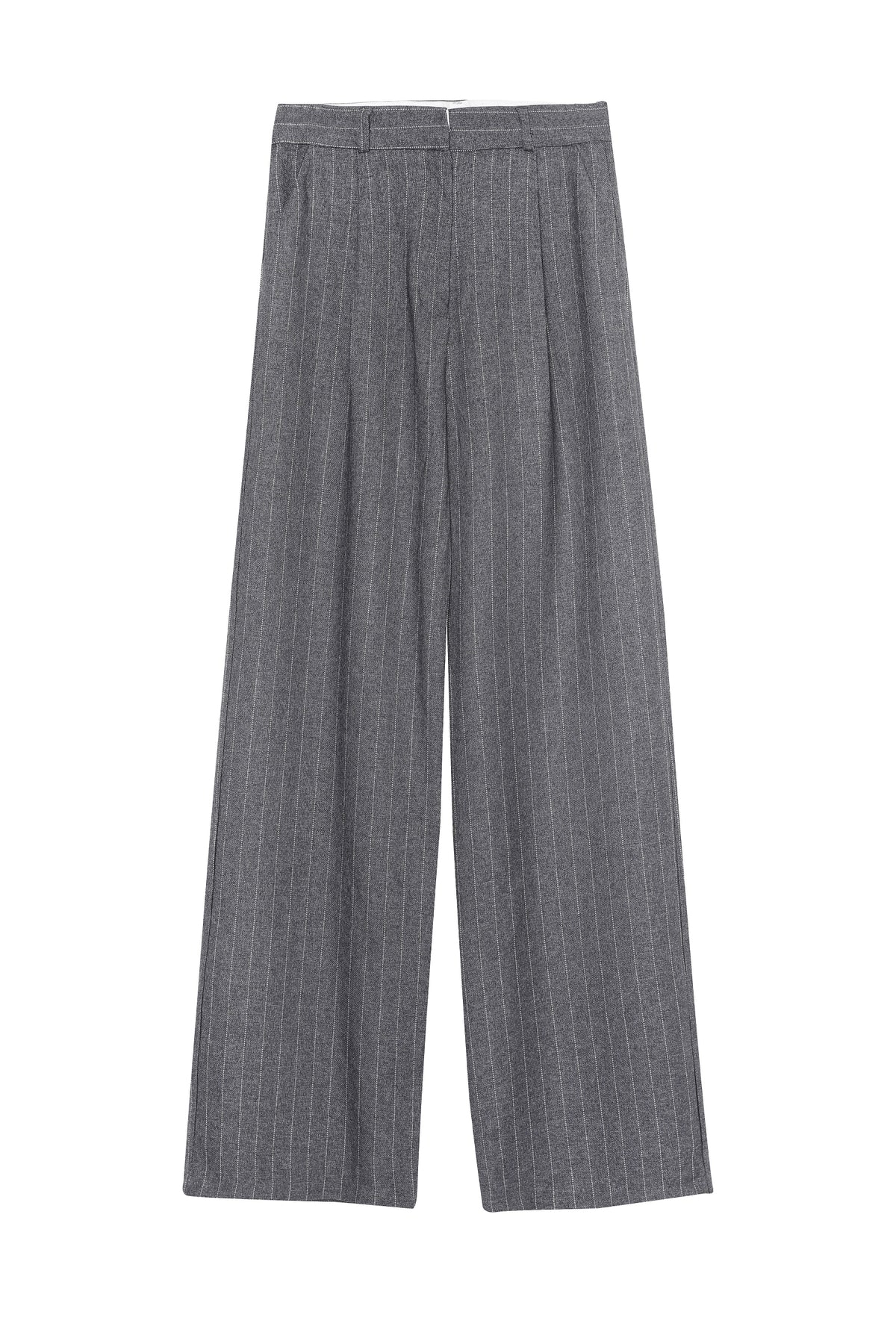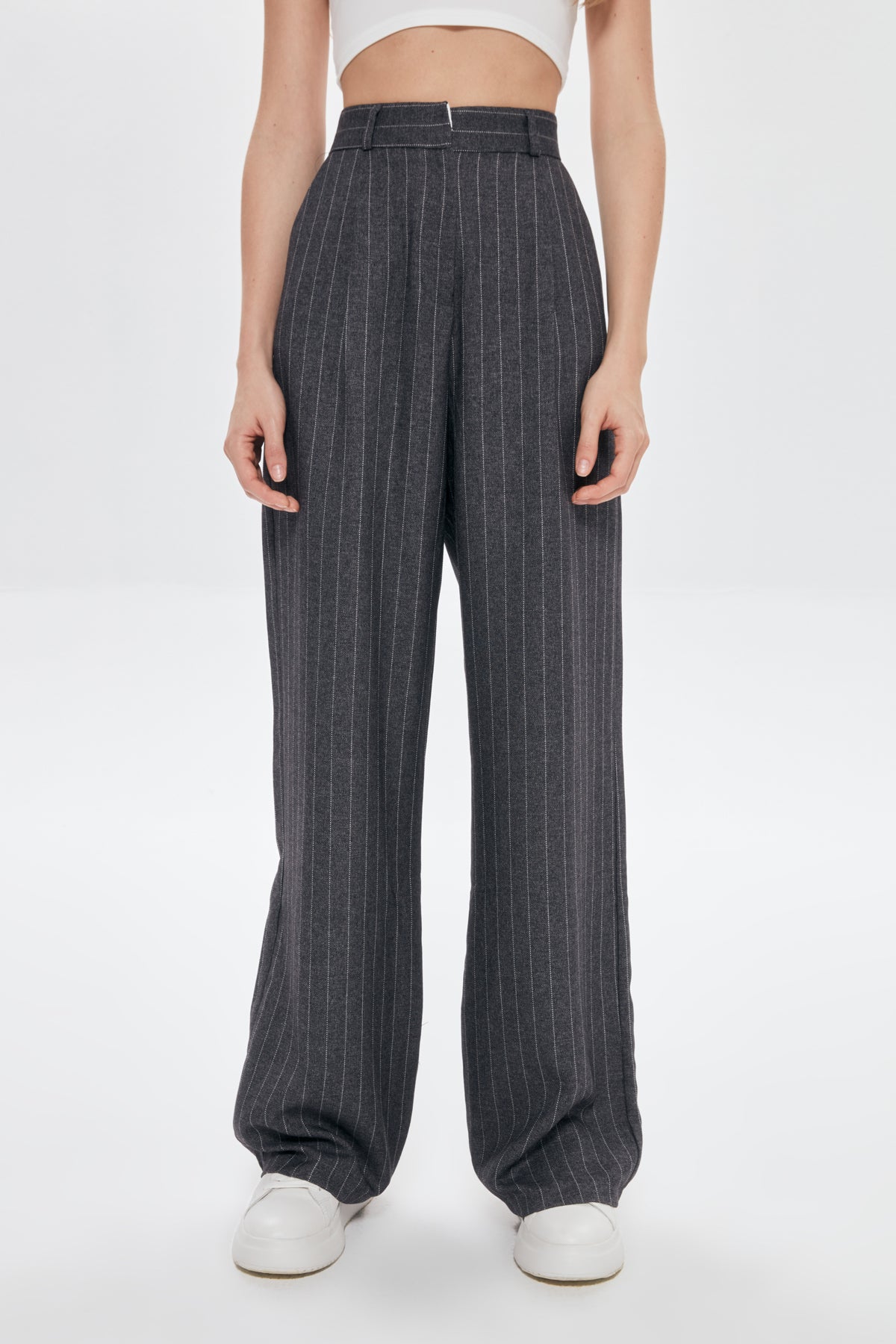 Yüksek bel detaylı, pİlelİ, çİft cep detaylı, İnce çİzgİlİ, genİş paça palazzo pantolon.