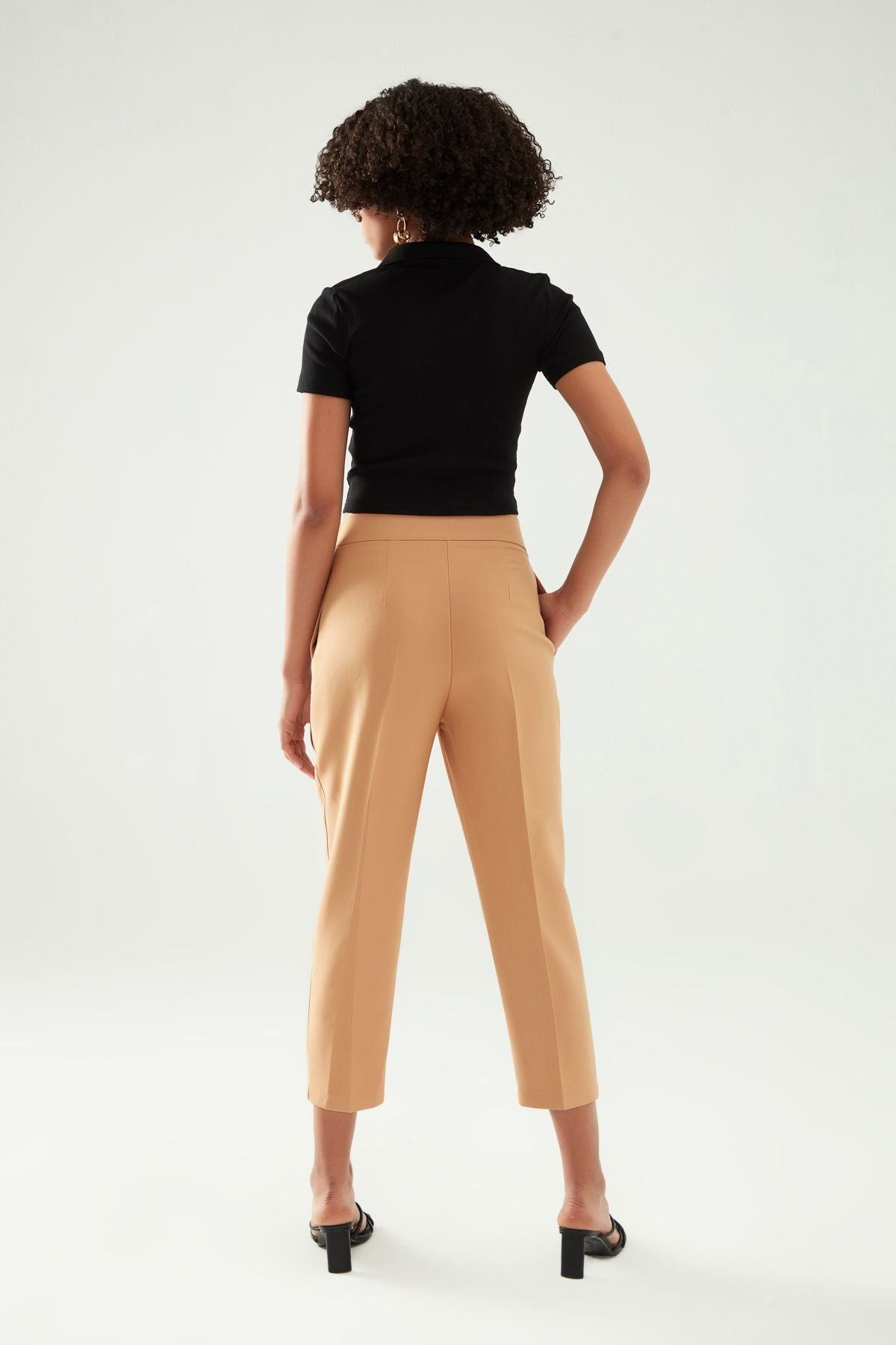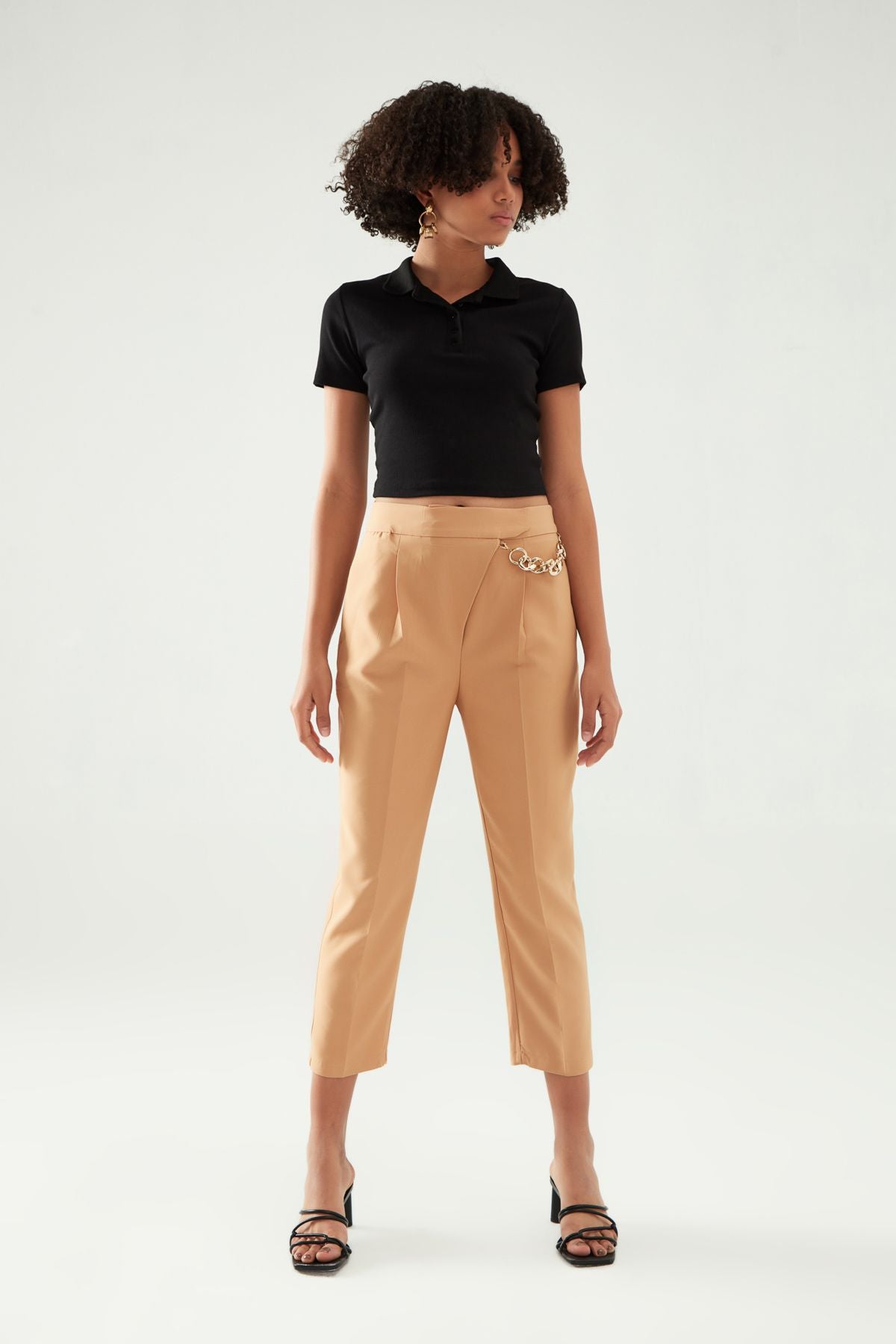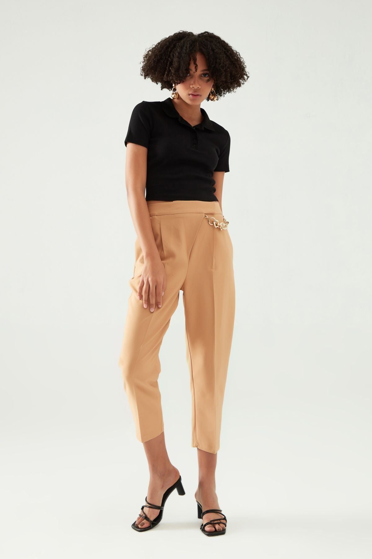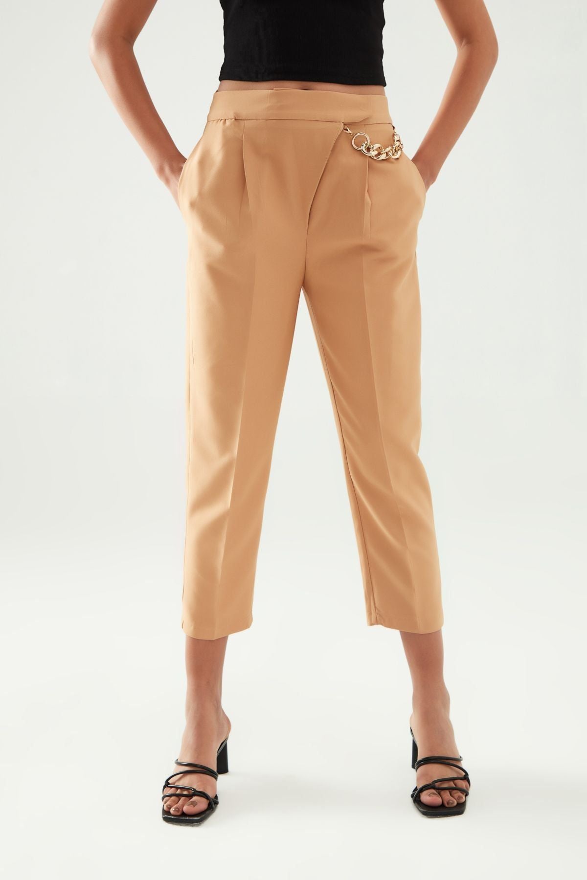 Zincir Aksesuarlı Yüksel Bel Pantolon Camel