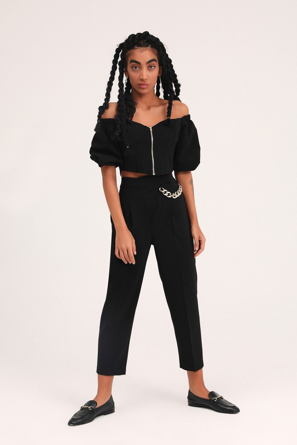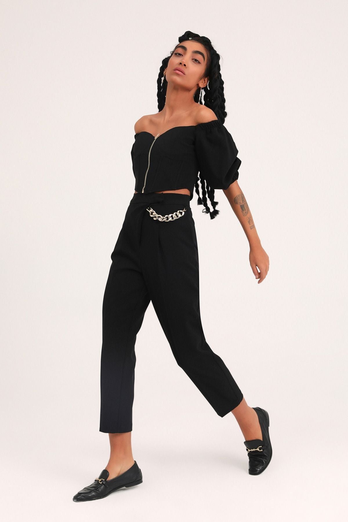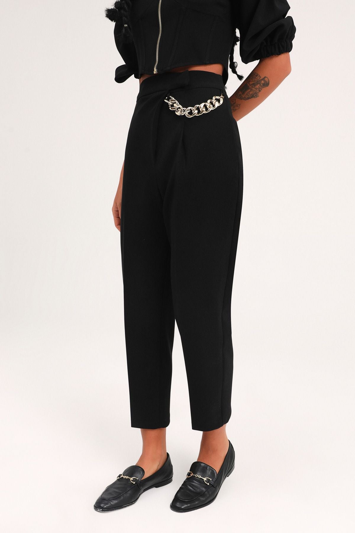 Zincir Aksesuarlı Yüksel Bel Pantolon Siyah