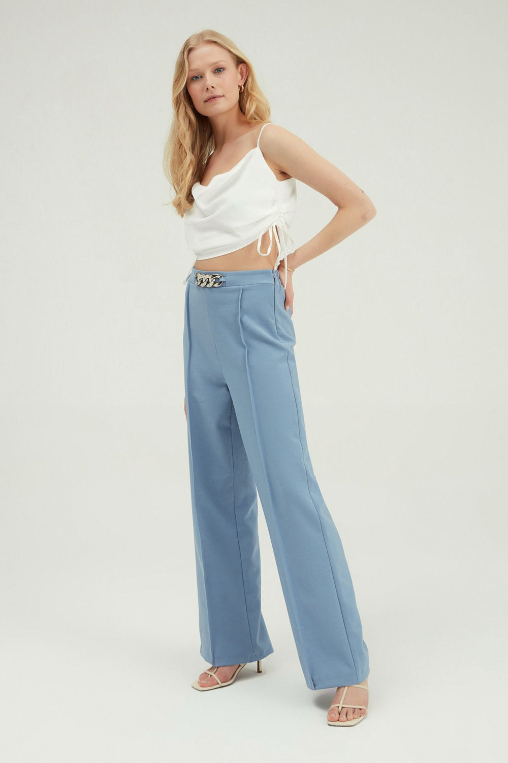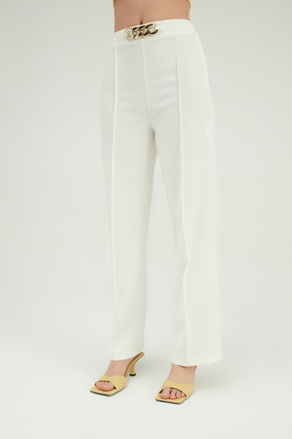 Beli Zincir Detaylı Pantolon Beyaz