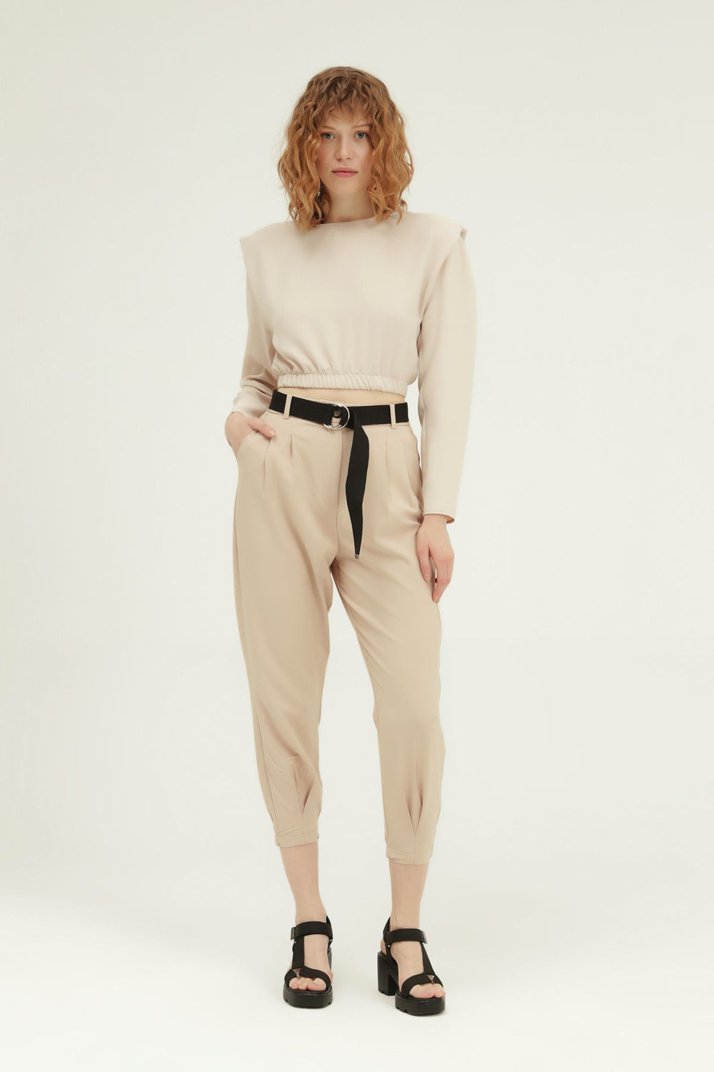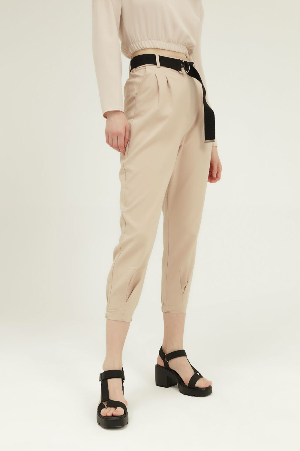 Kemerli Yüksek Bel Pantolon Bej