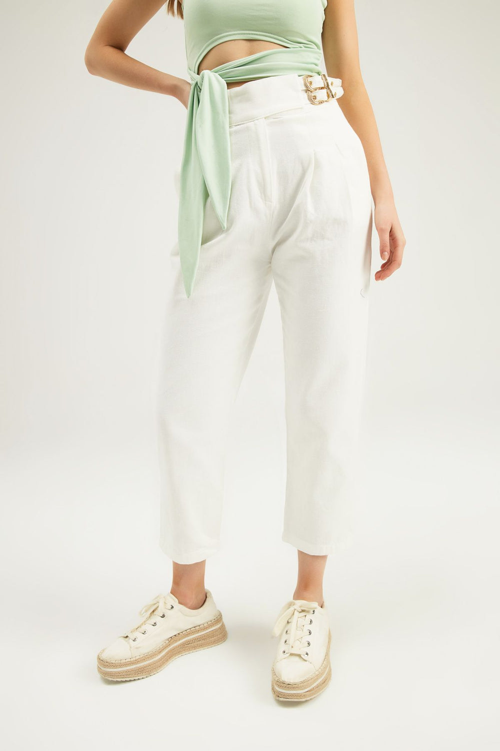 Tokalı Gabardin Yüksek Bel Pantolon Beyaz