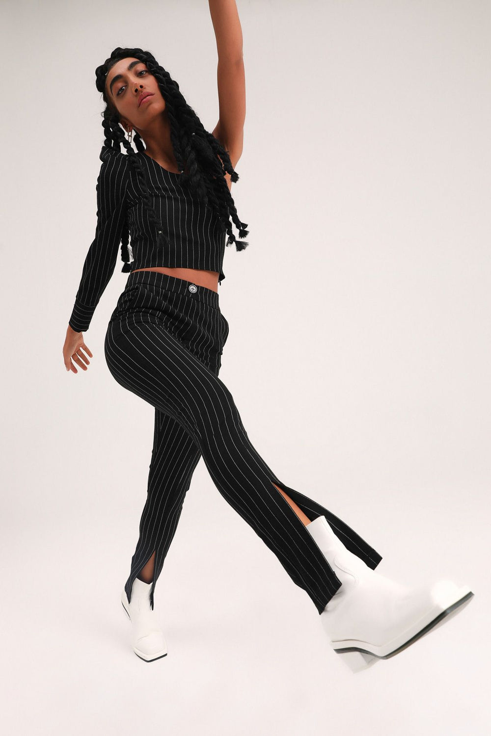 Paçası Yırtmaçlı Çizgili Pantolon Siyah