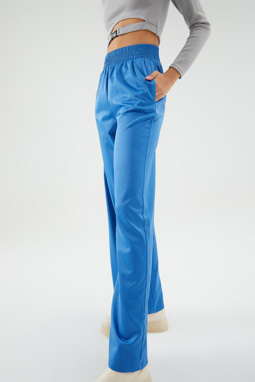 Beli Lastikli Saten Pantolon Mavi