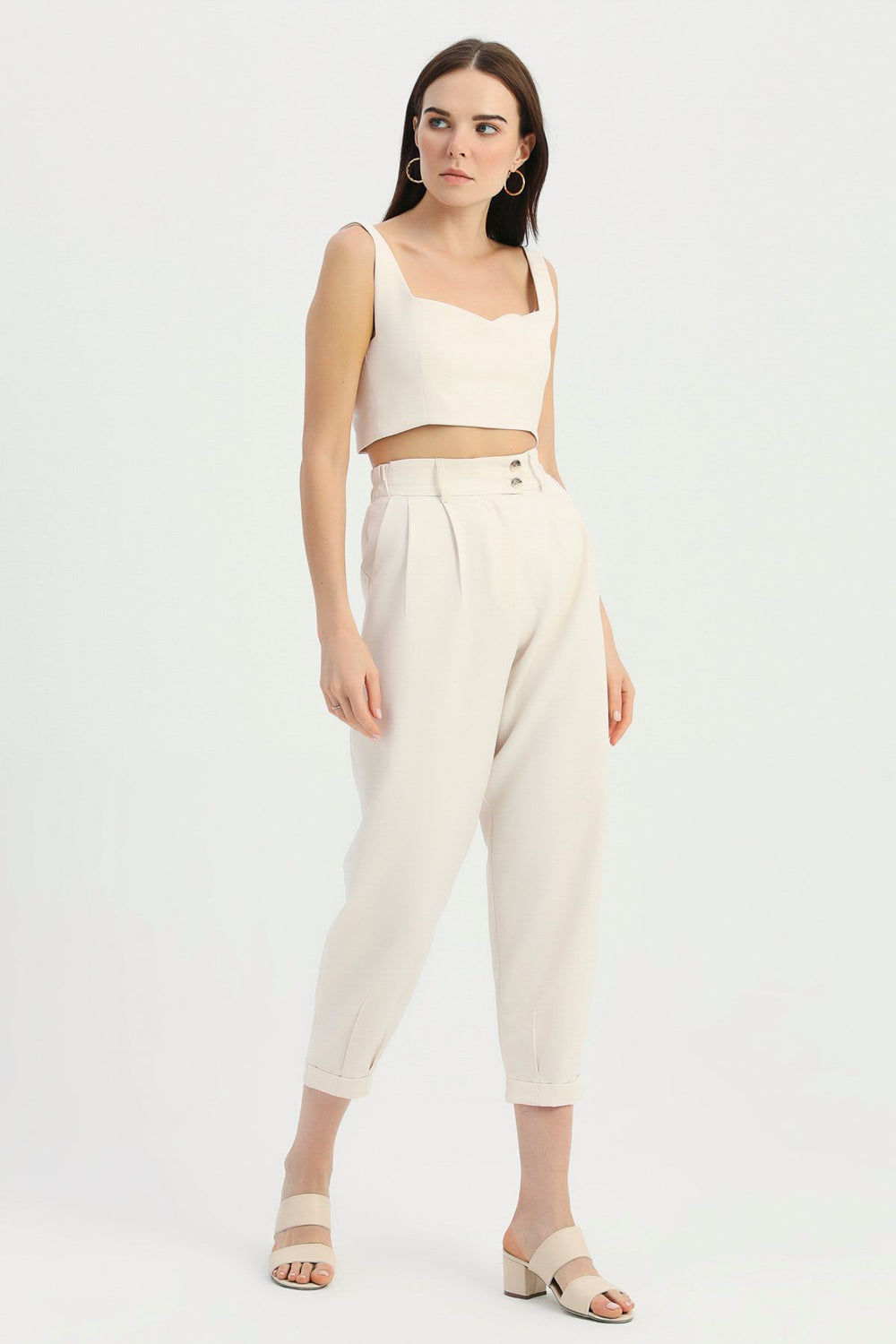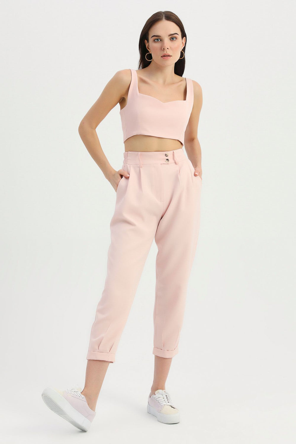 Yüksel Bel Kumaş Pantolon Pudra