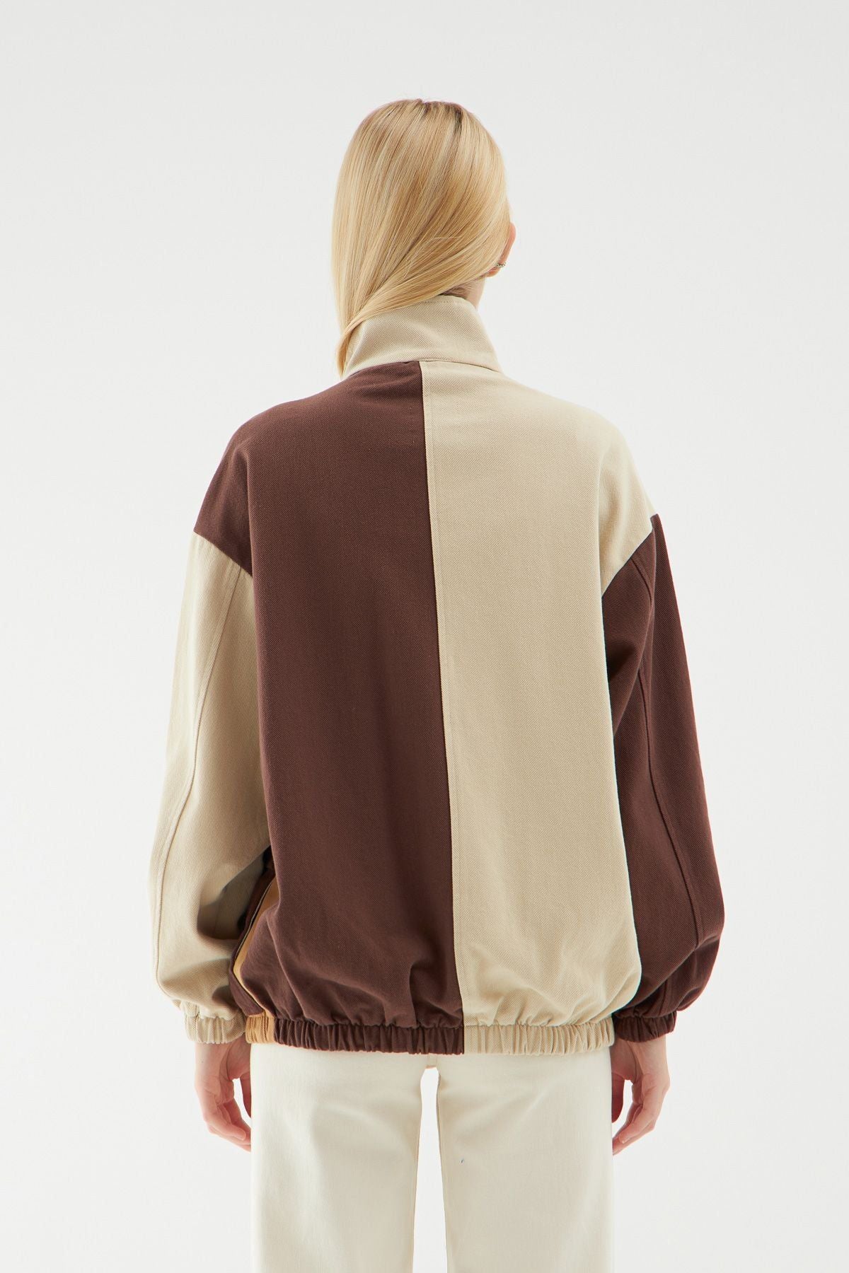 %100 pamuk içerikli kadın oversize ceket, farklı blok renk modeli ile dikkat çekiyor. Kombinlerine farklı bir görünüm sunan oversize ceket modeli gizli fermuar ve çıtçıt düğmelerinin yanı sıra büyük cep detayı ile de dikkat çekiyor. Kol ve alt kısmı lastiklidir. Dik yakadır.