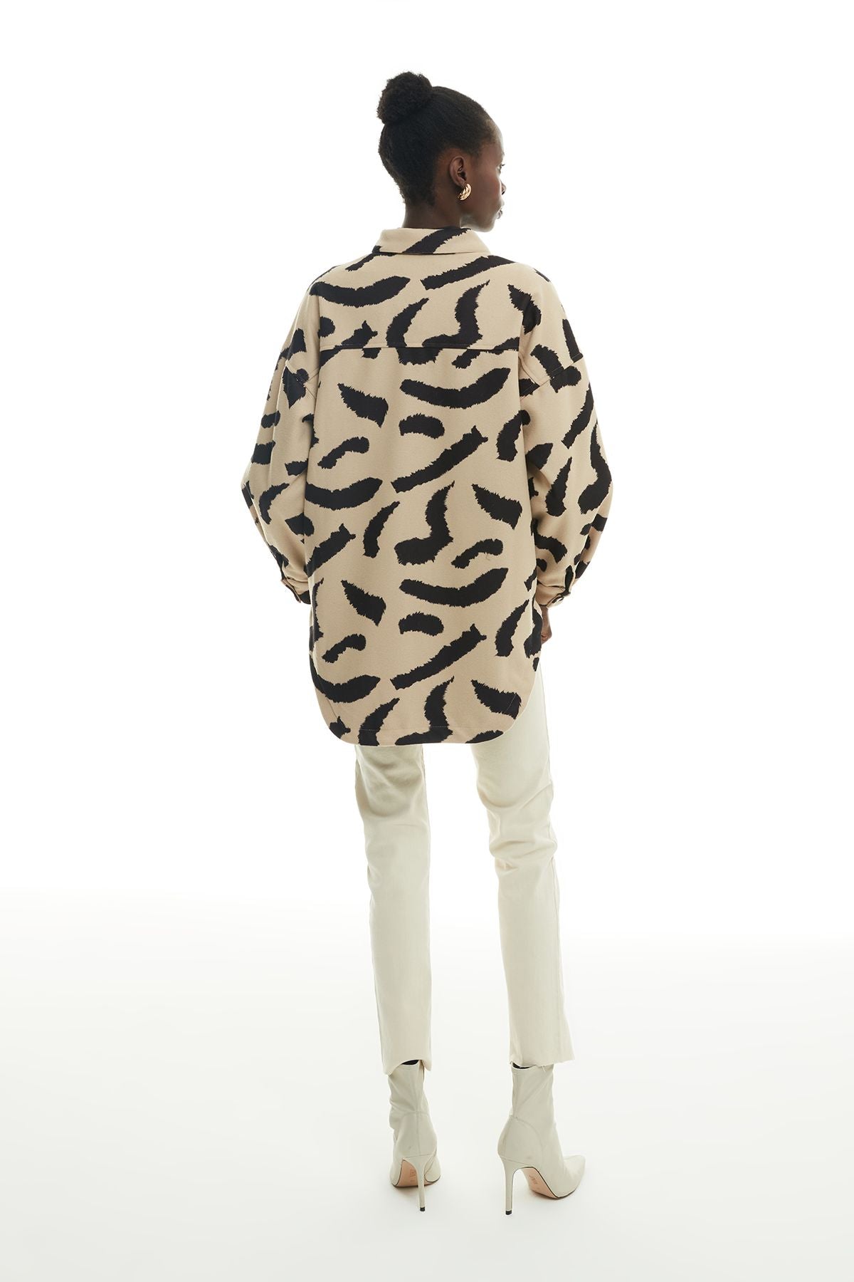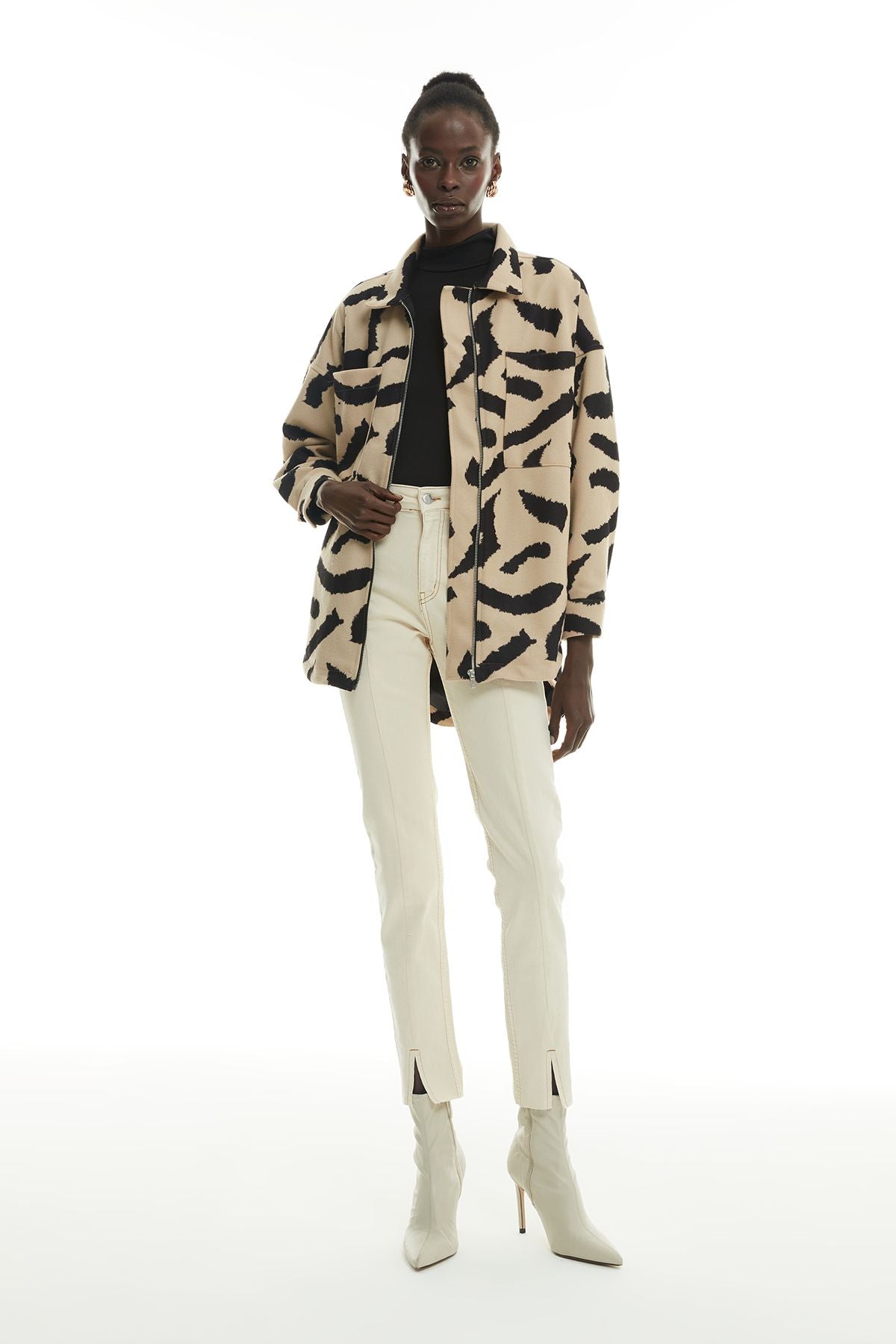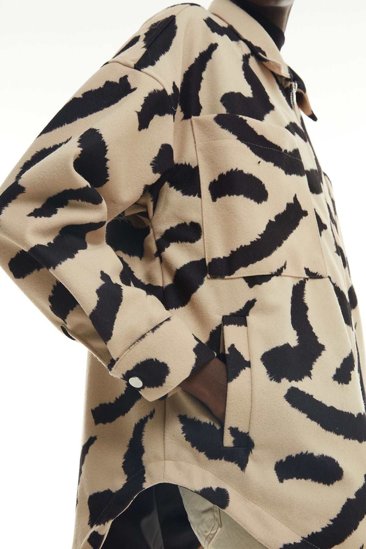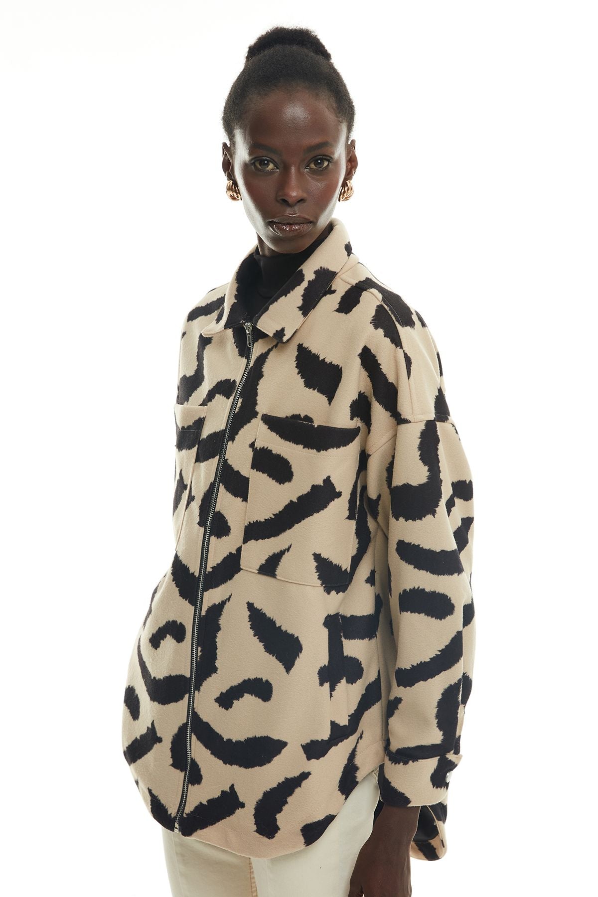 Asimetrik kesim, uzun kol, içi astarlı, ara boy, fermuarlı, cepli, fermuarlı, kaşe, leopar desen ceket.