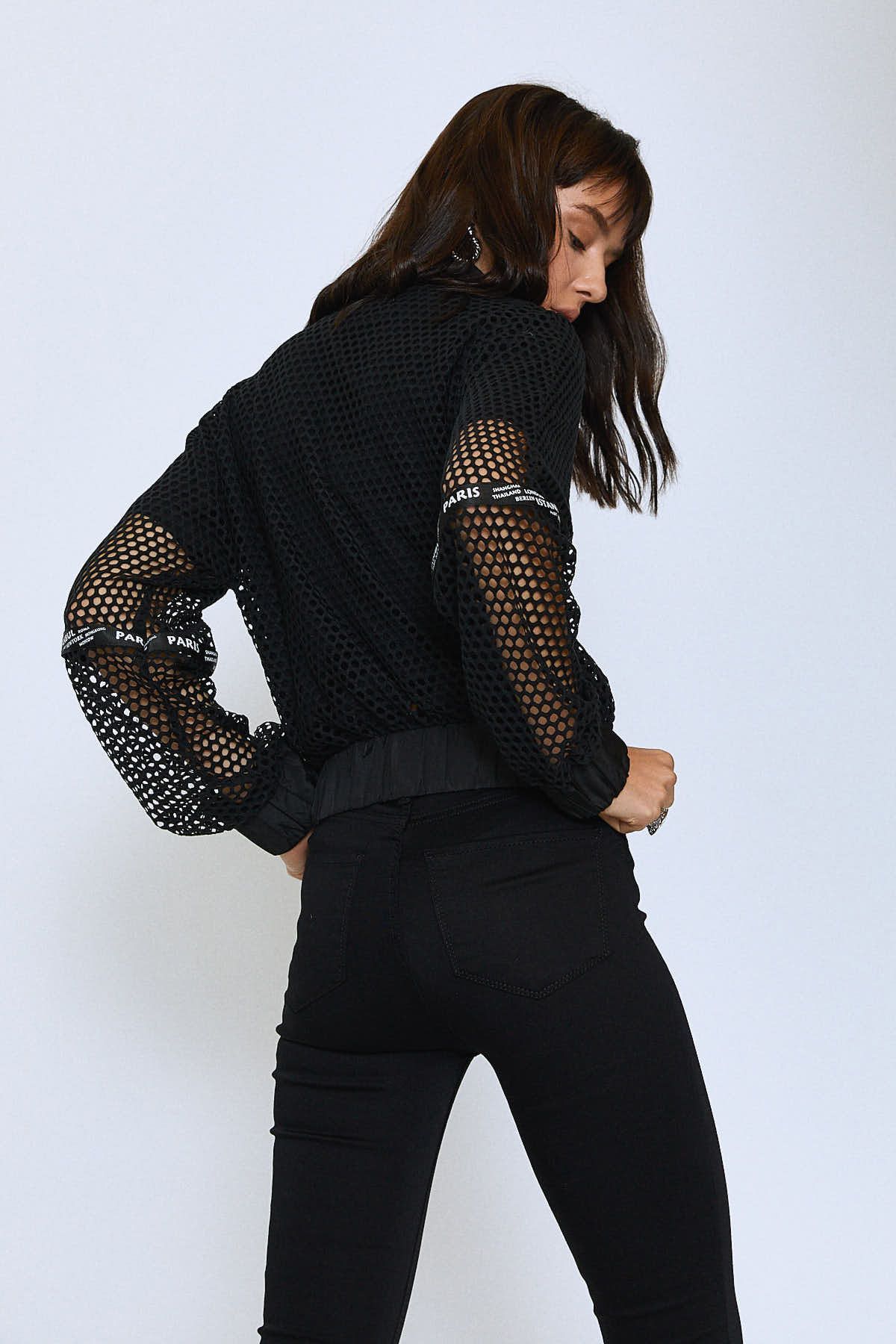 File kumaşıyla farklı olmayı garantiliyen ceket, boğazlı yakası ile zıtlığın yarattığı güçlü etkiyi kullanıyor.