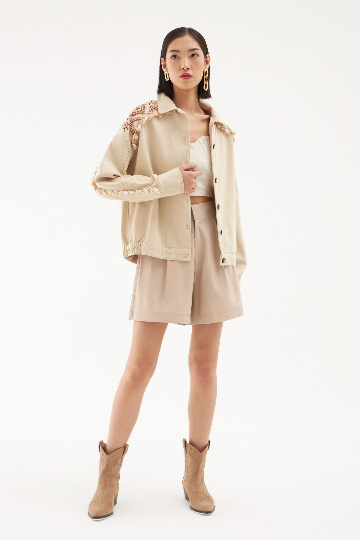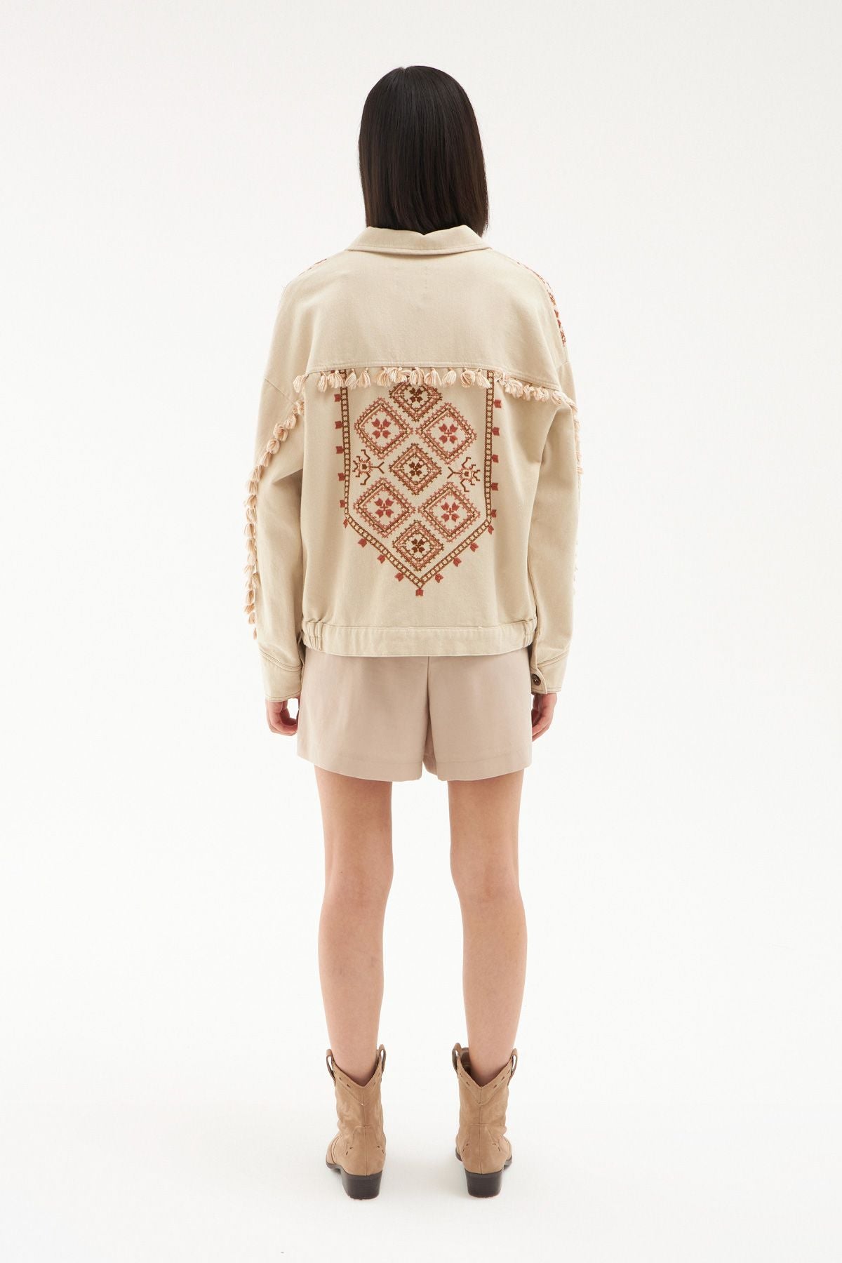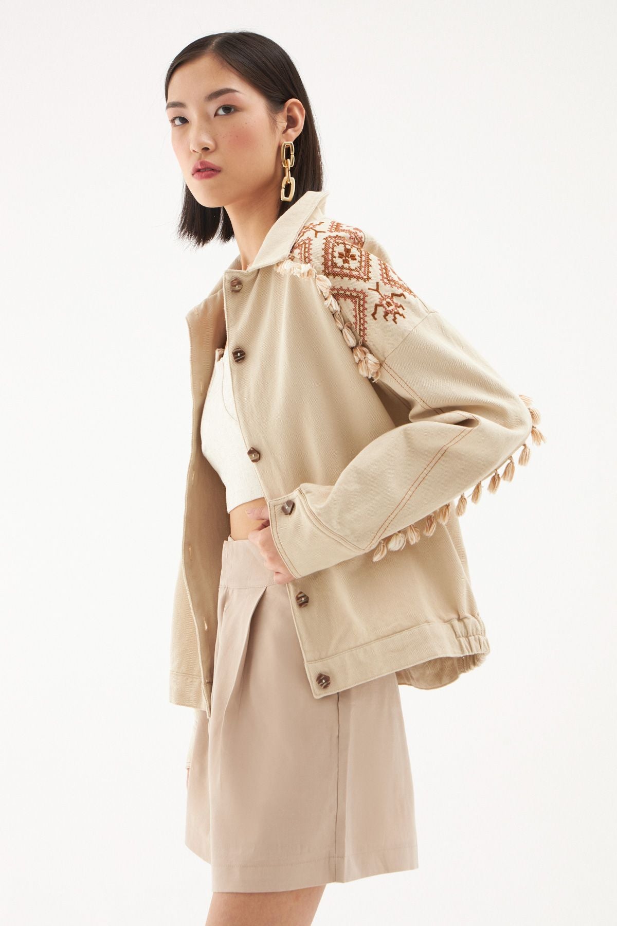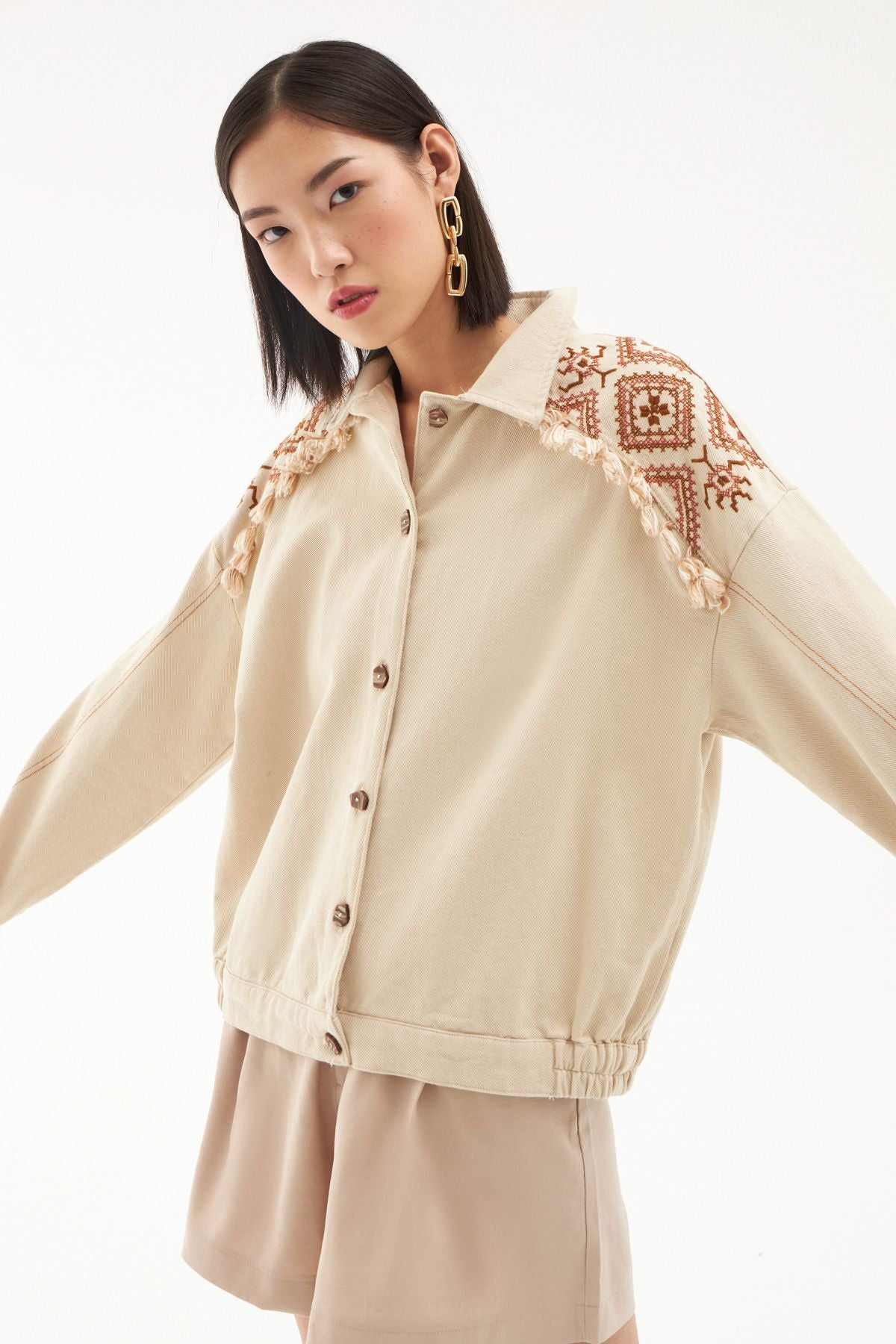 Gardırobundaki mevsimlik ceket seçeneklerine farklı bir tasarım katan nakış işlemeli ceket modeli, sezonda dış giyim parçaların arasında favori tercihin arasında olmaya aday. Omzunda ve arkasında yer alan nakış işleme detaylarının püsküllerle buluşmasıyla bütünlük kazanarak göz dolduran püsküllü ceket modeli fark yaratacağın dış giyim parçaları arasında yerini almaya aday. Nakış ve püskül detaylı ceket modeli, %100 pamuk içeriği, rahat kesimi ve zarif tasarımı ile Quzu'da seni bekliyor.