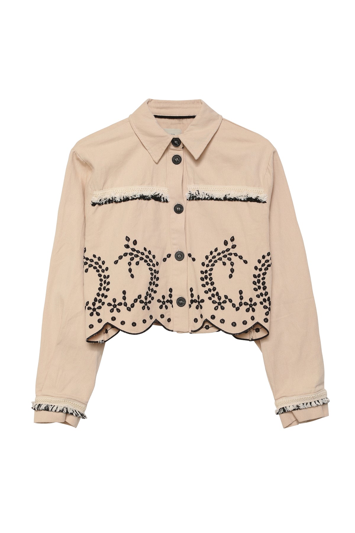 %100 pamuk İçerİklİ, büyük düğmelİ, uzun kollu, asİmetrİk kesİm, kol-ön ve arka nakış İşlemelİ, püskül detaylı, crop ceket.