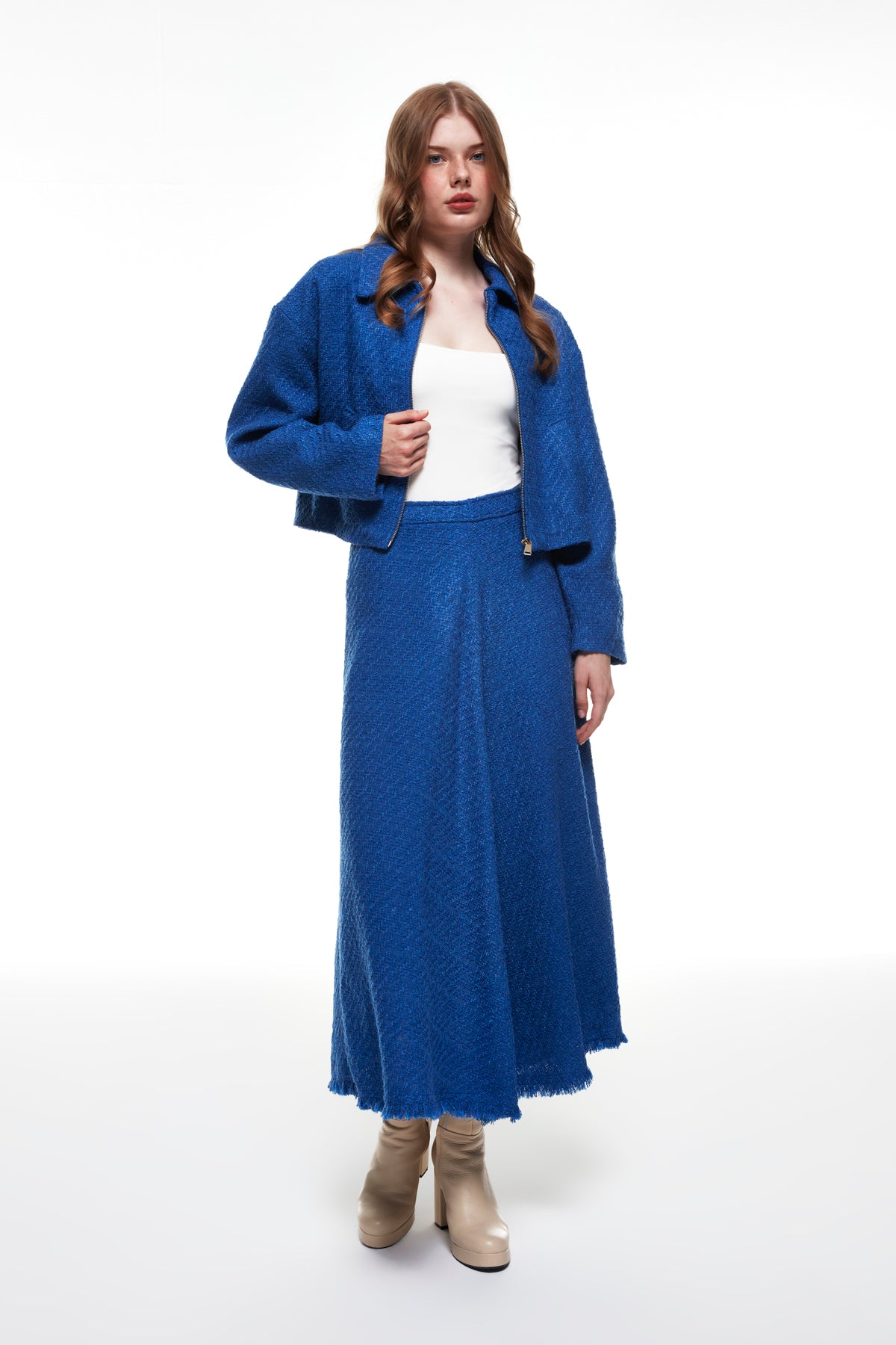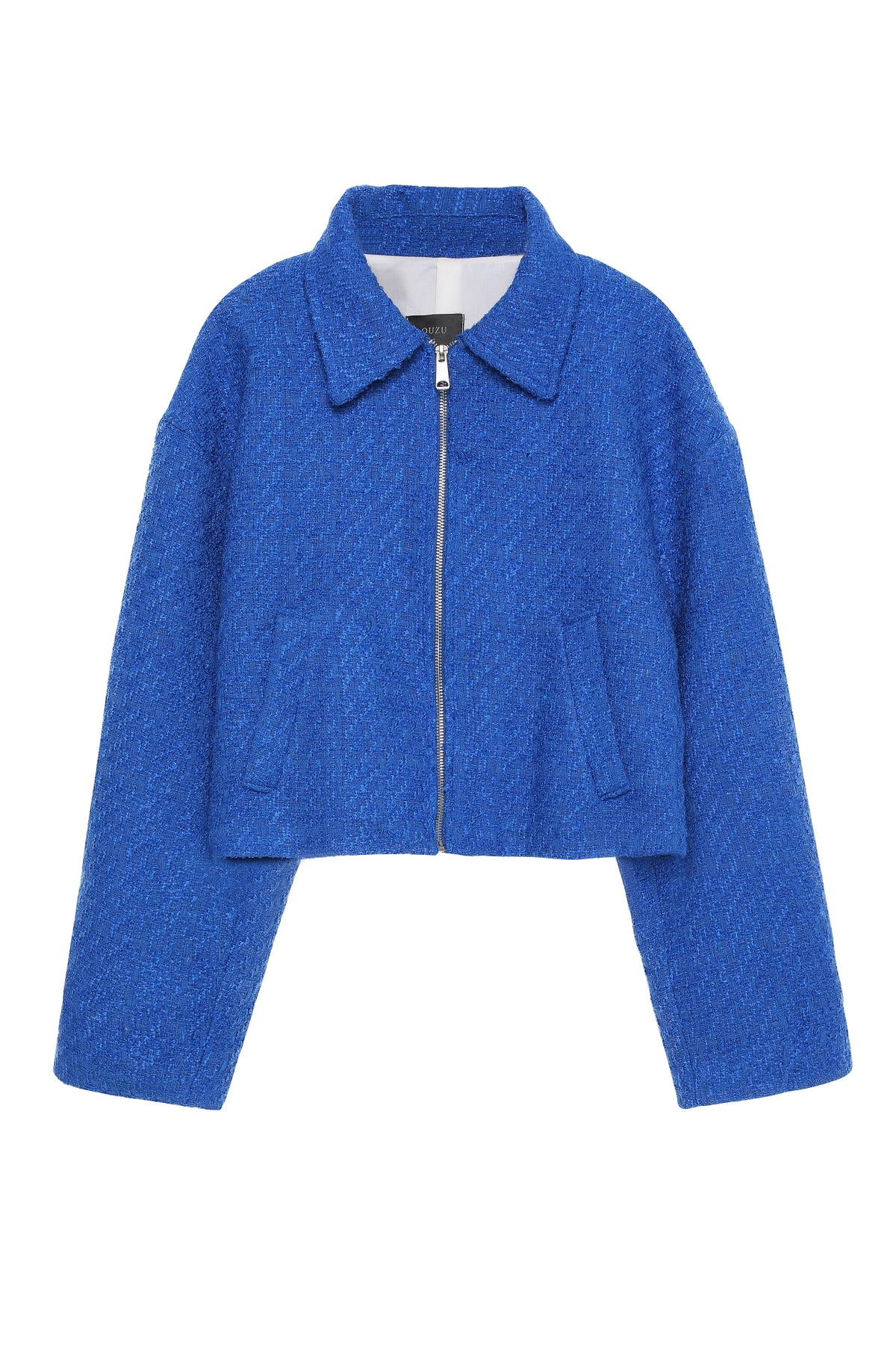 Pamuk karışımlı, içi astarlı, uzun kollu, fermuar kapatmalı, tüvit ceket.
