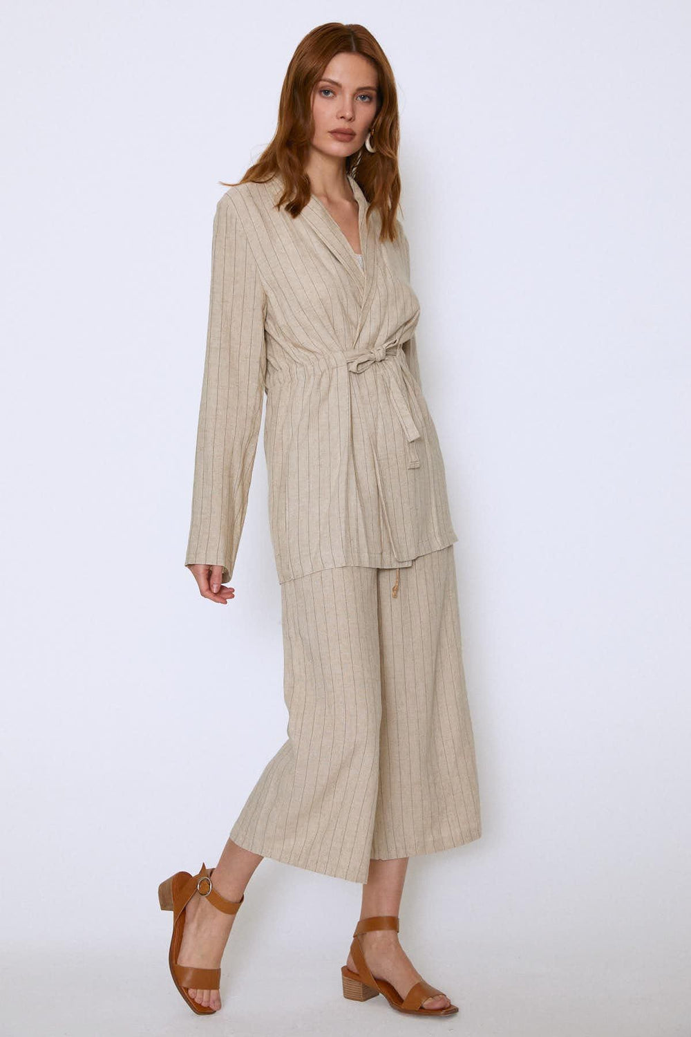 Çizgili Beli Kuşaklı Keten Ceket Bej